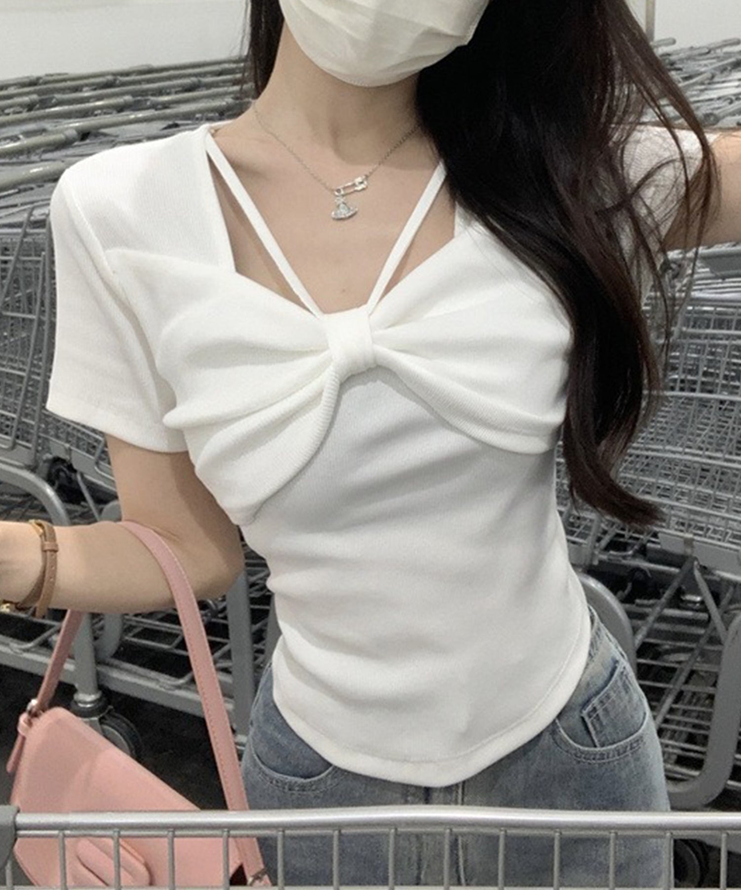 リボン ホルター デザイン 半袖 Tシャツ