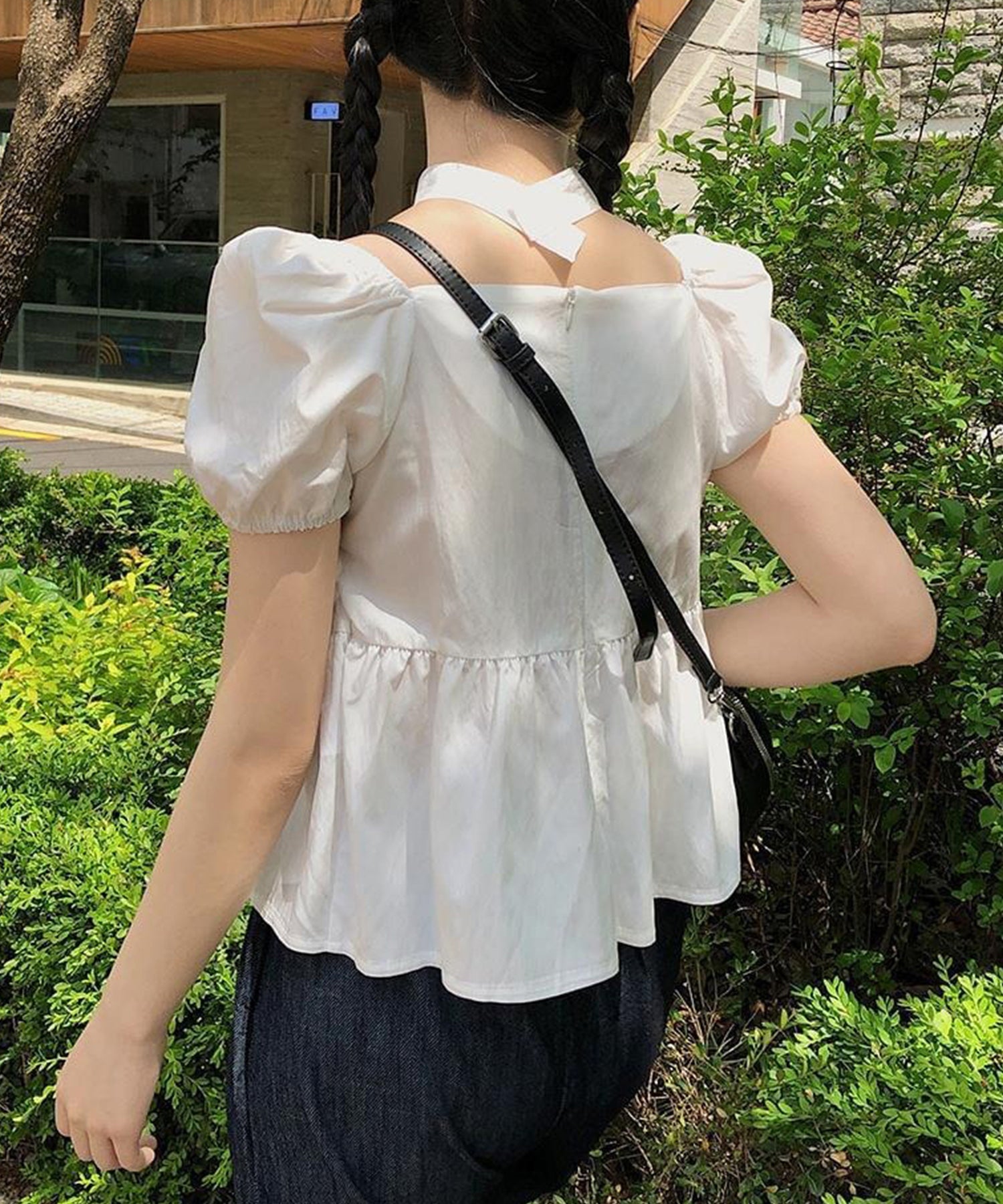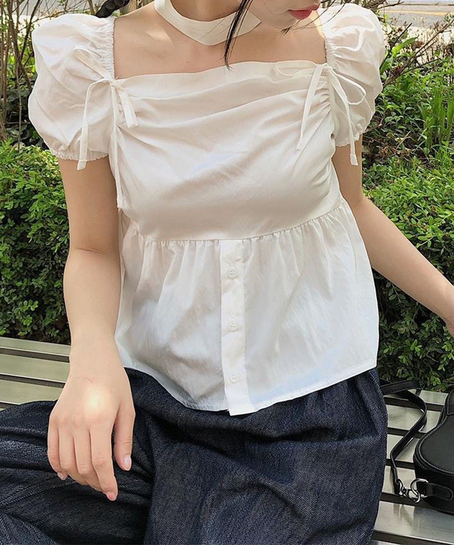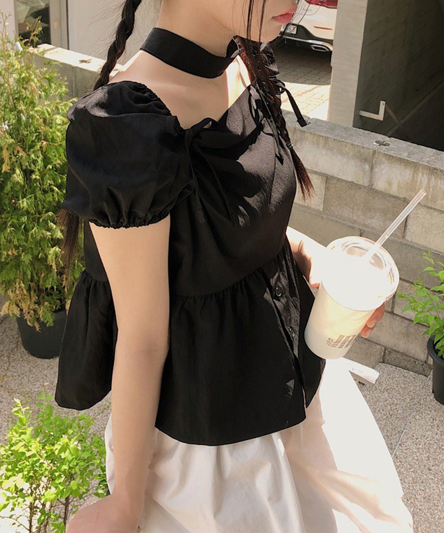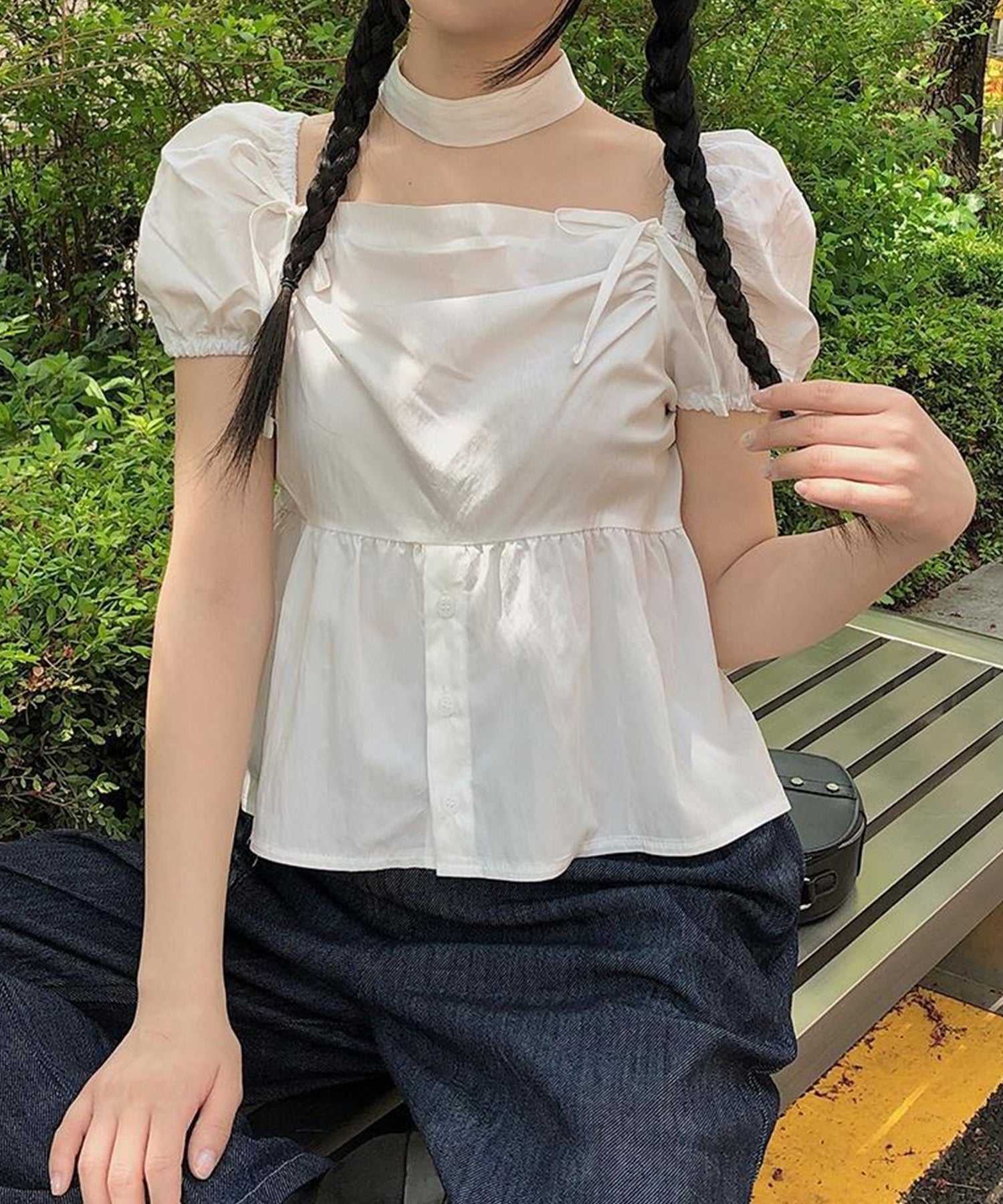 チョーカー付き リボン ペプラム パフスリーブ ブラウス