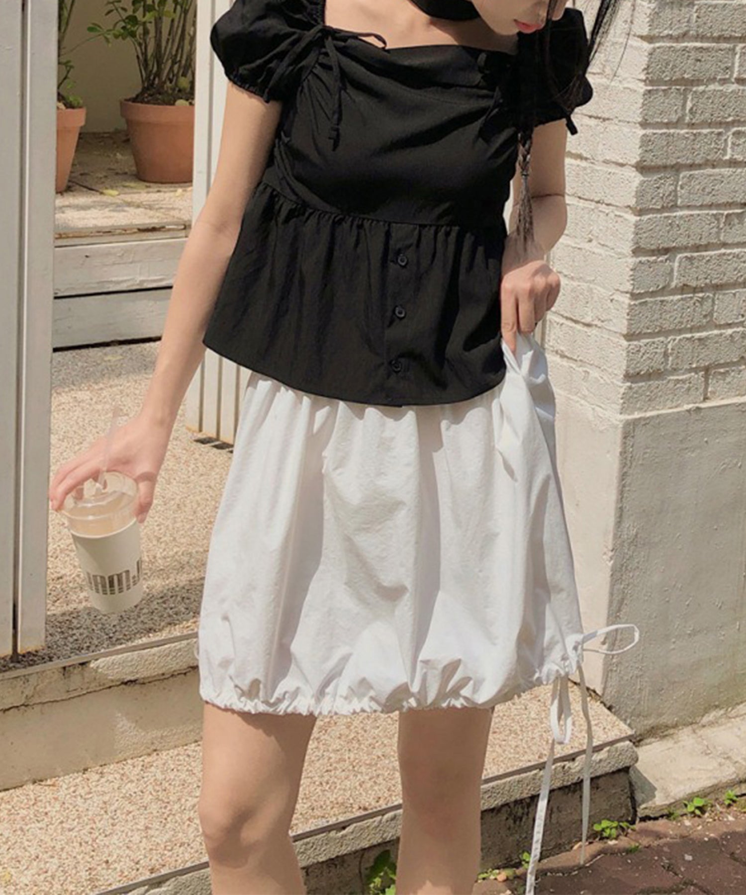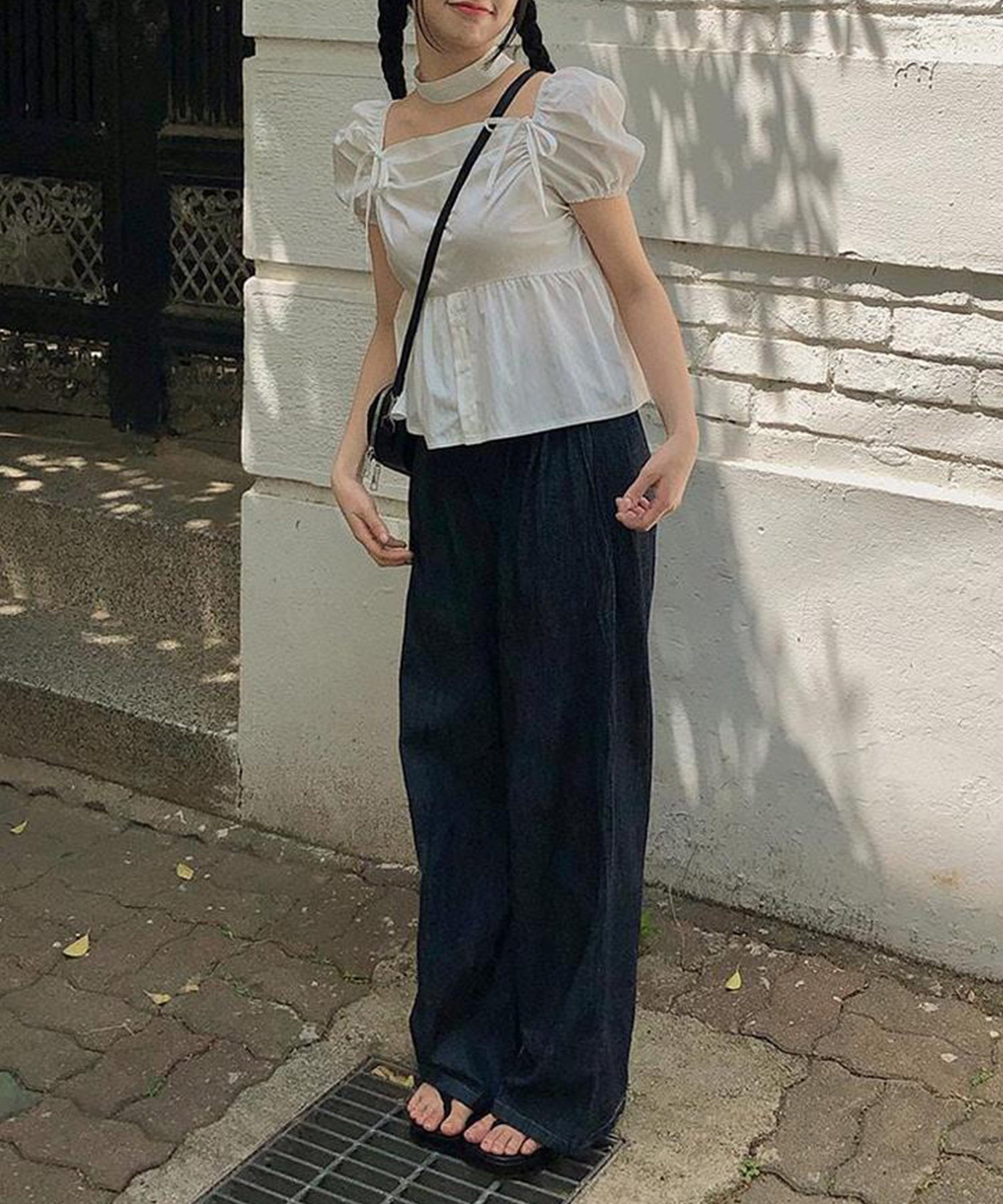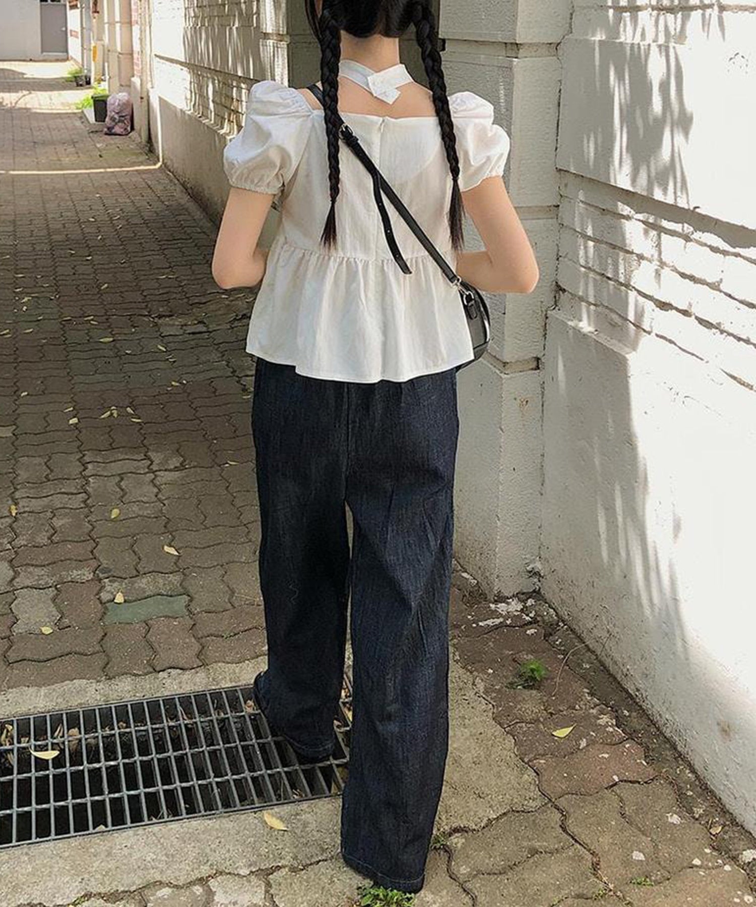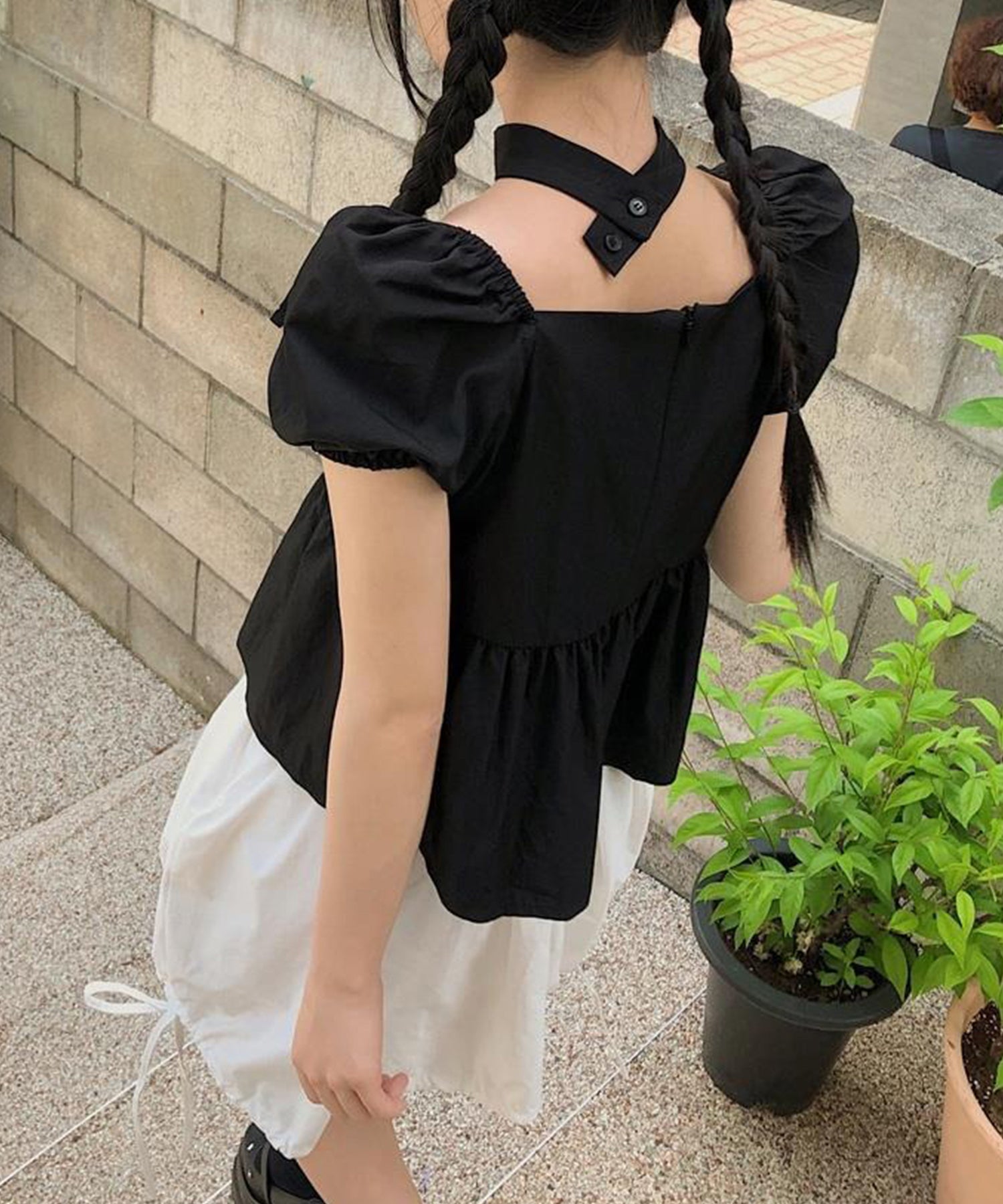チョーカー付き リボン ペプラム パフスリーブ ブラウス