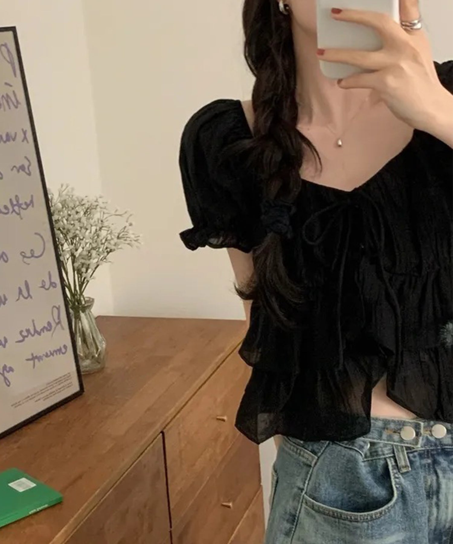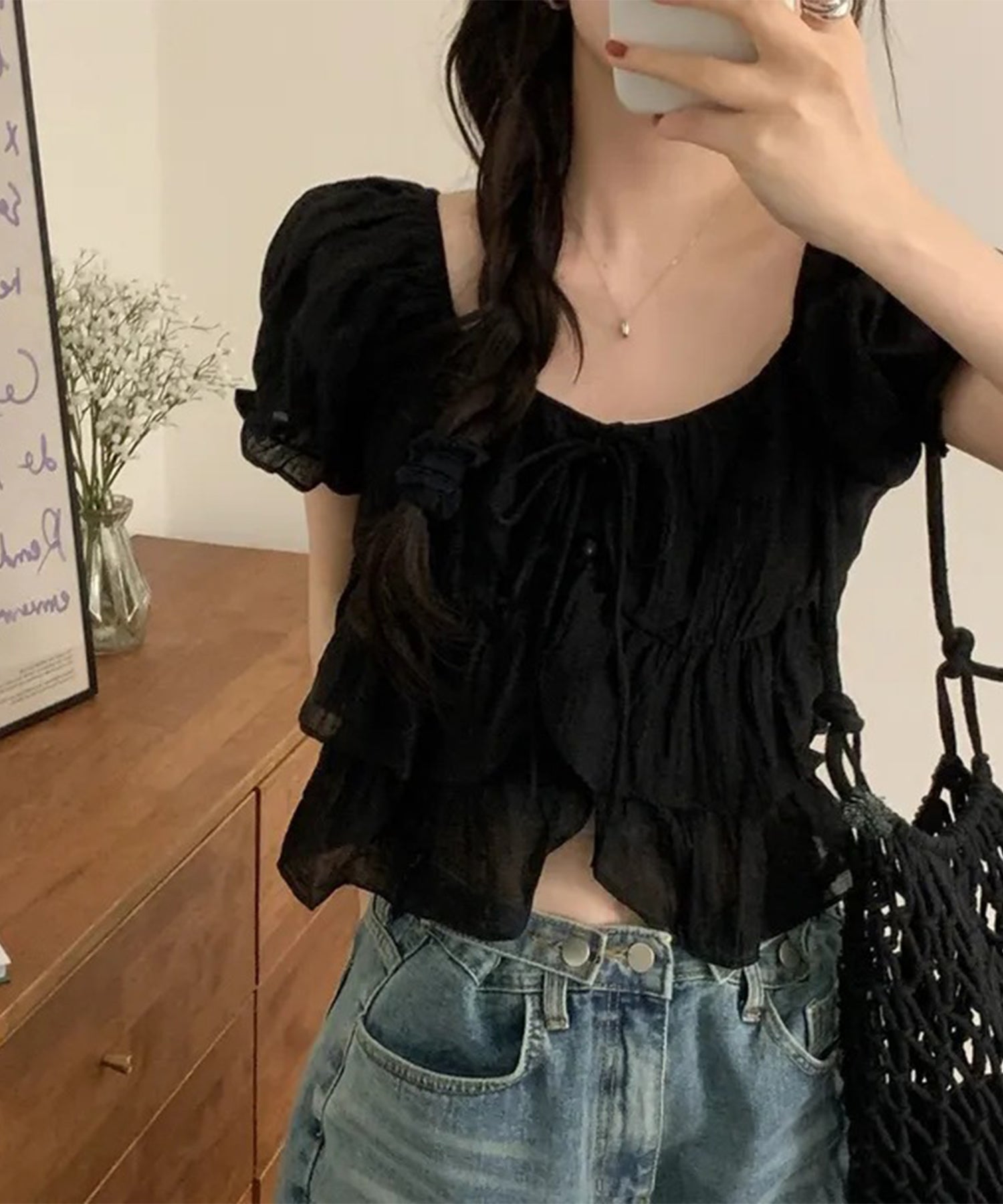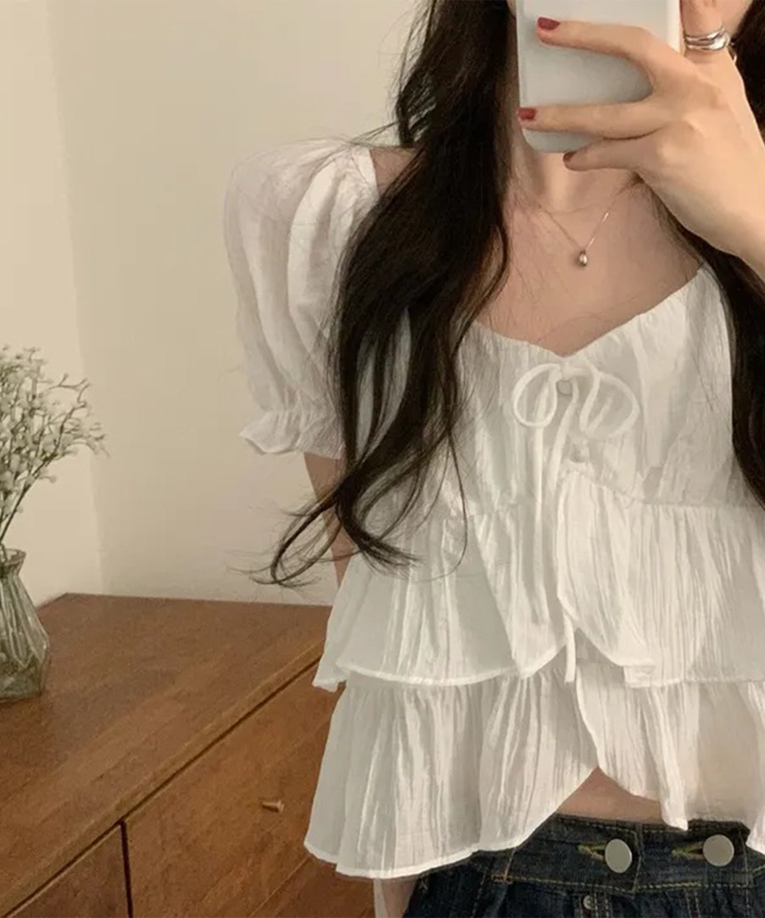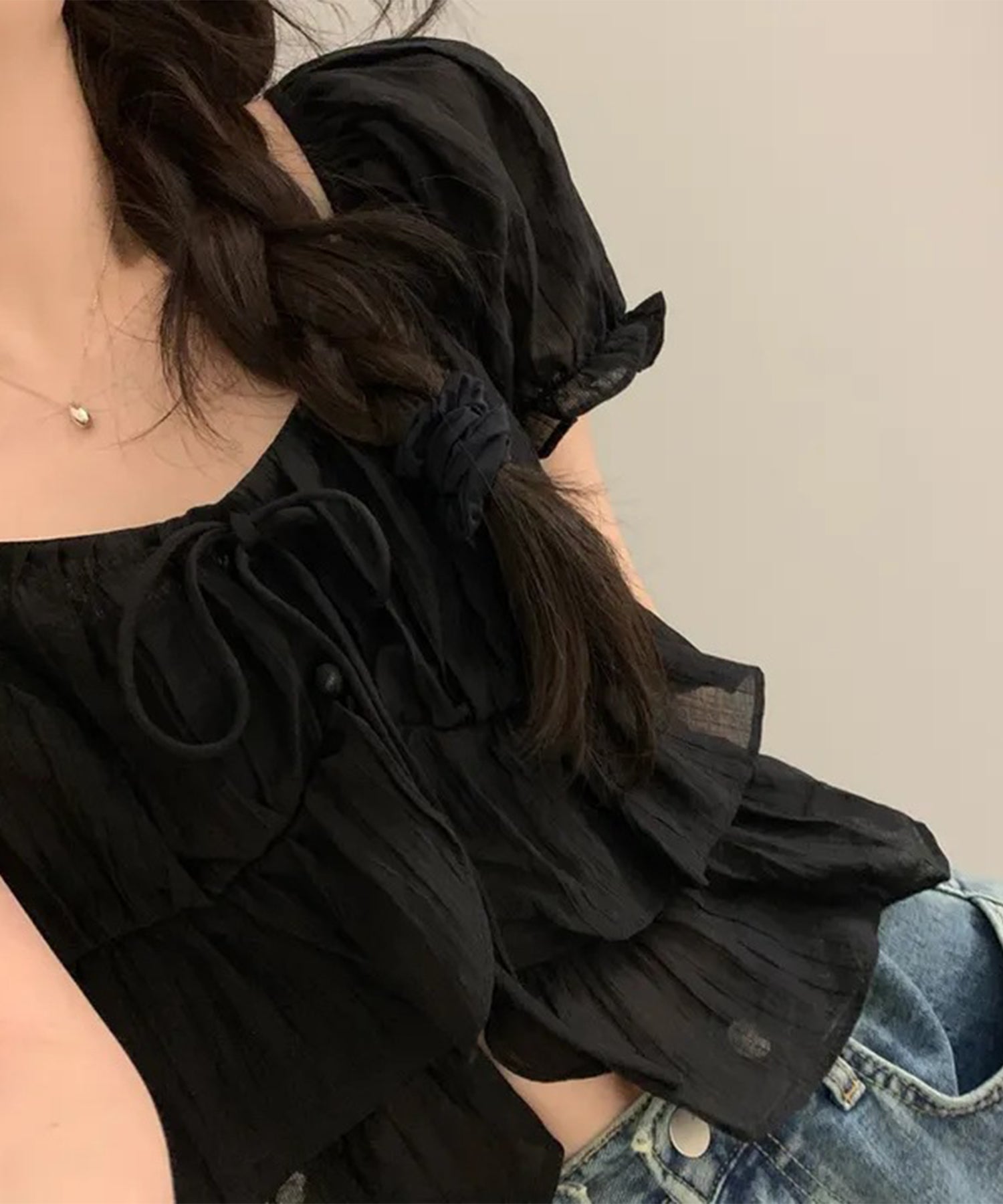 ワッシャー加工 ティアード フリル パフスリーブ ブラウス