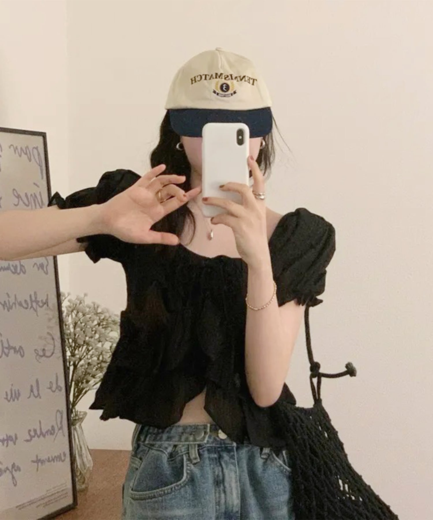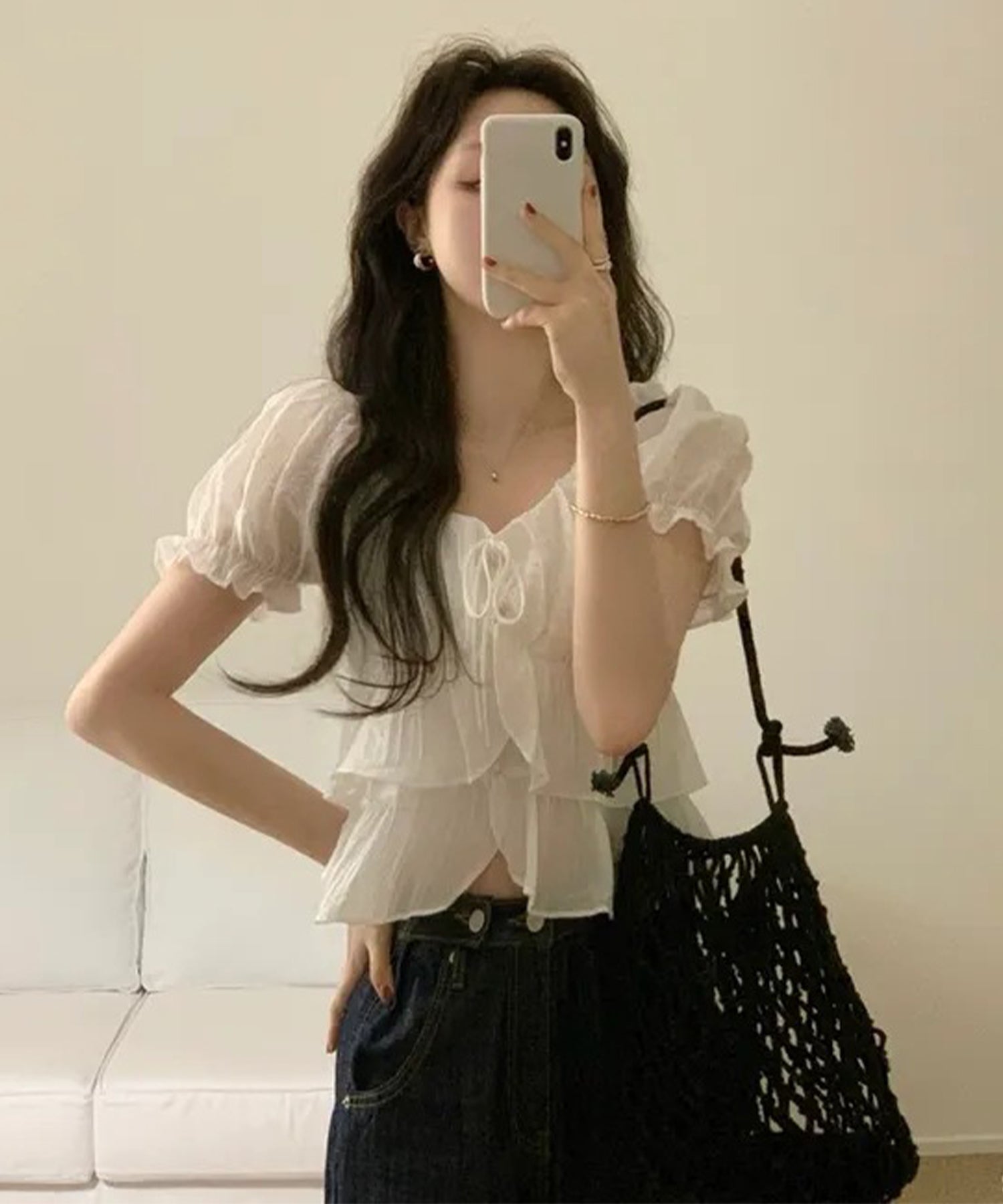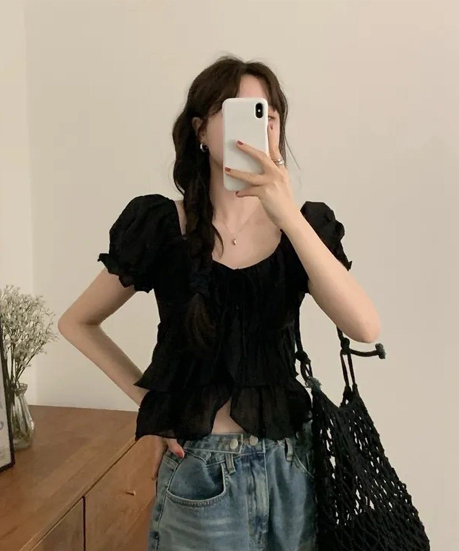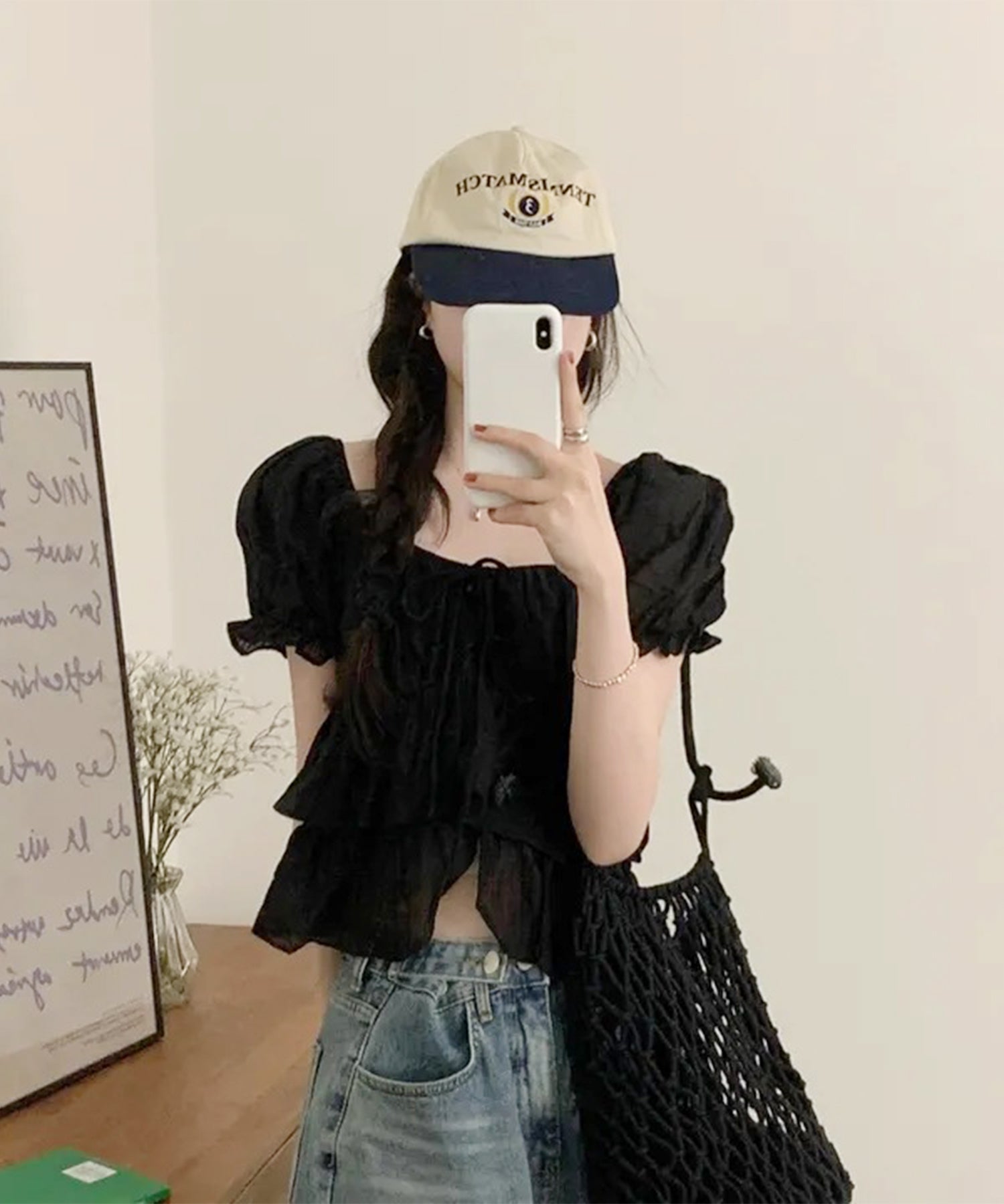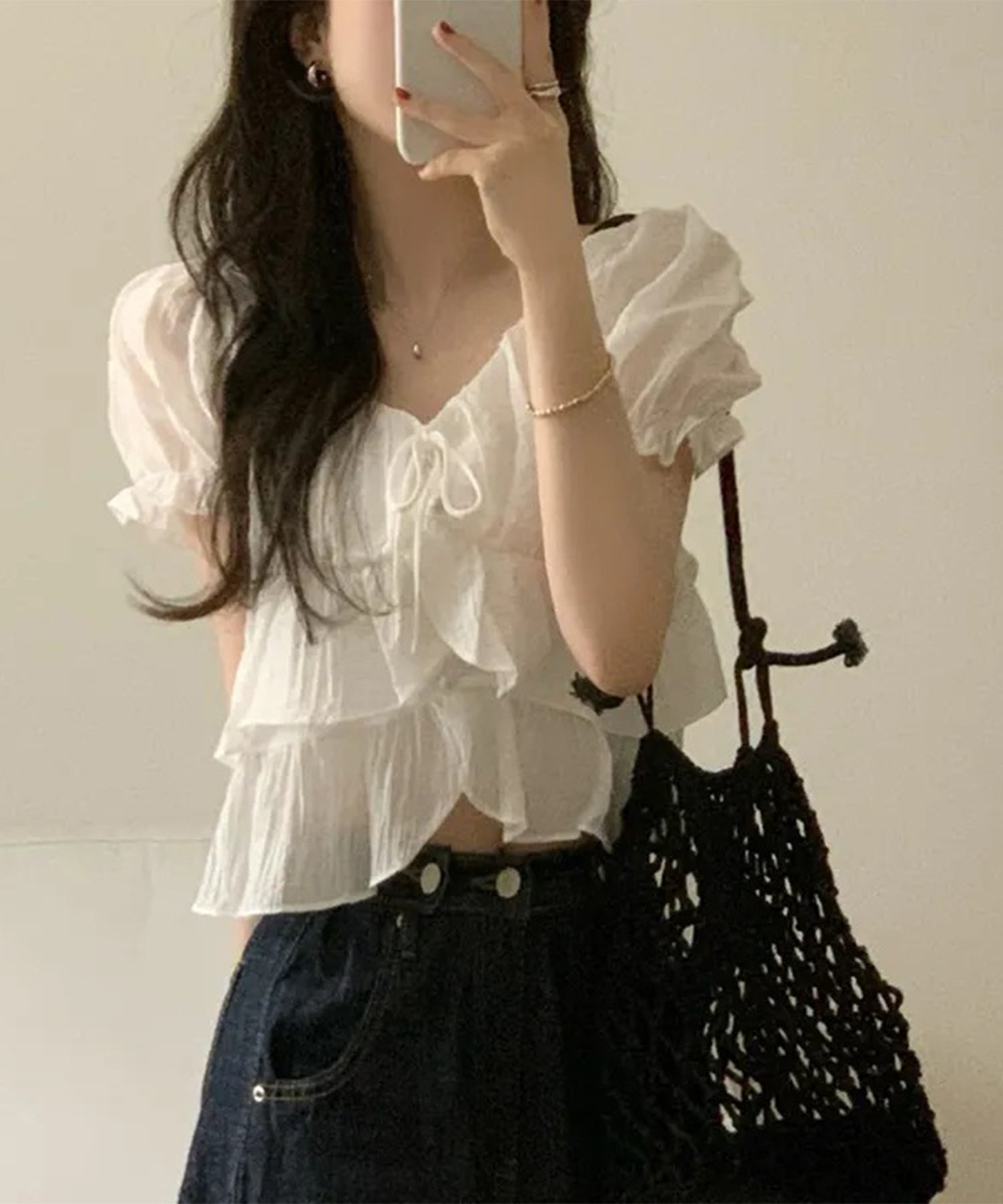 ワッシャー加工 ティアード フリル パフスリーブ ブラウス