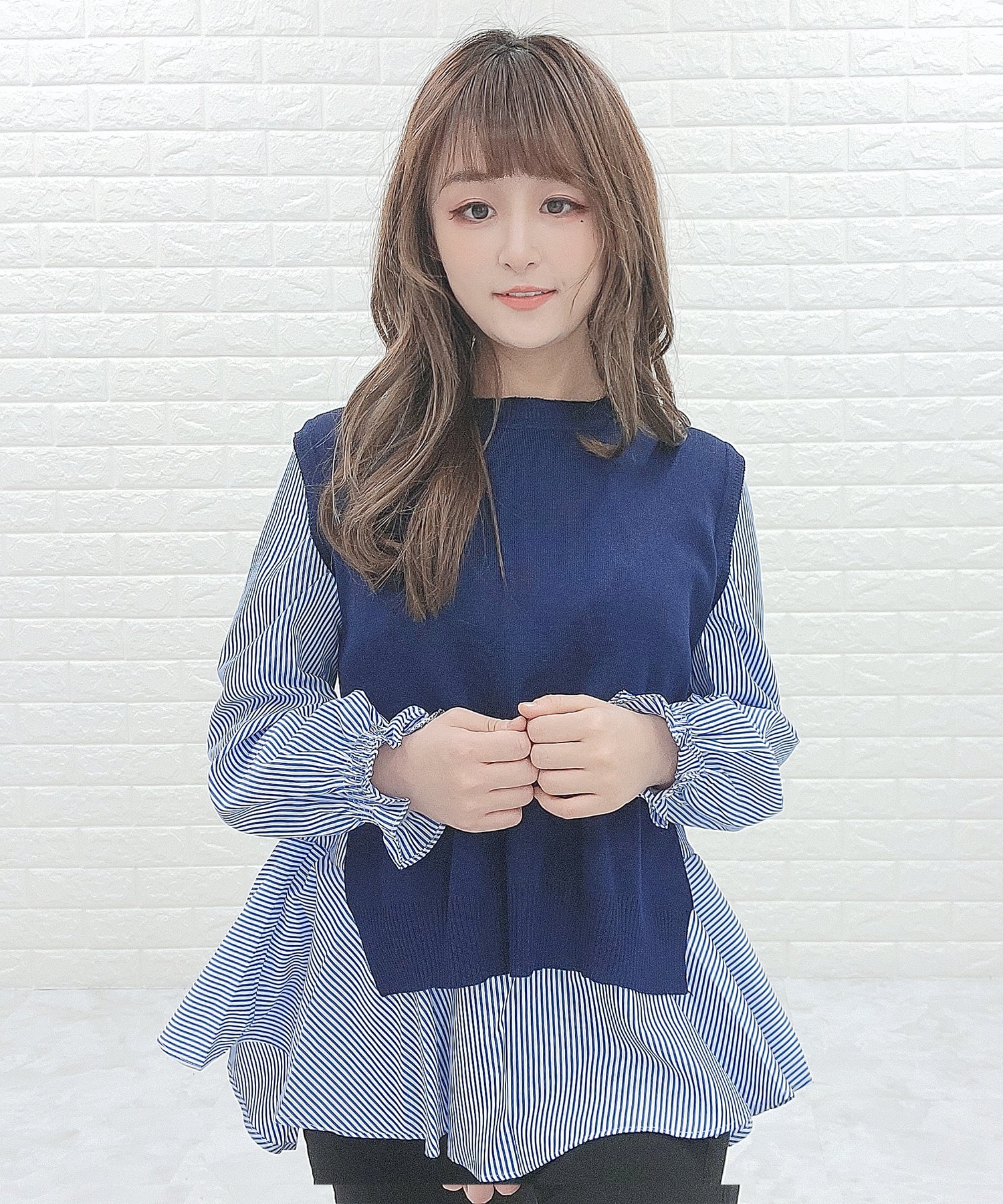 キャンディスリーブのフリルブラウスとニットベストのレイヤード2点セット