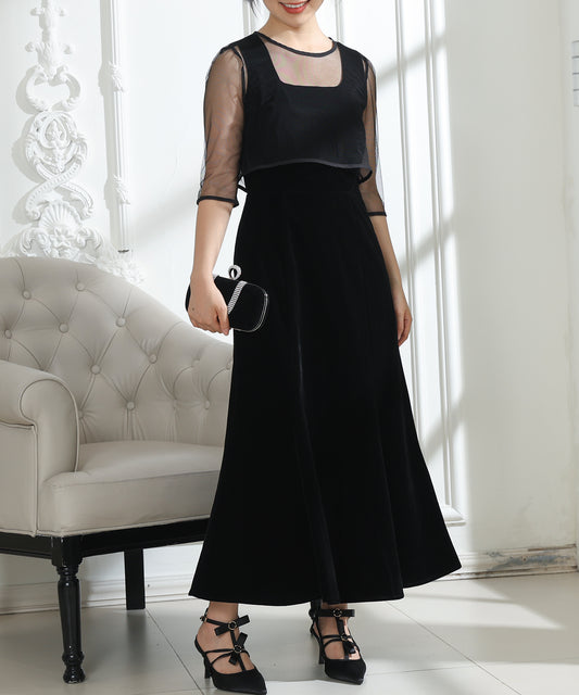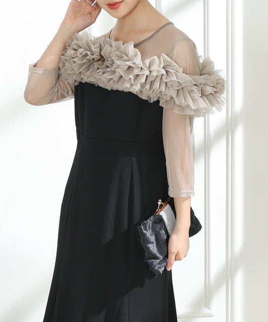 チュールフリル シアー 切り替え フレア ロング ドレス