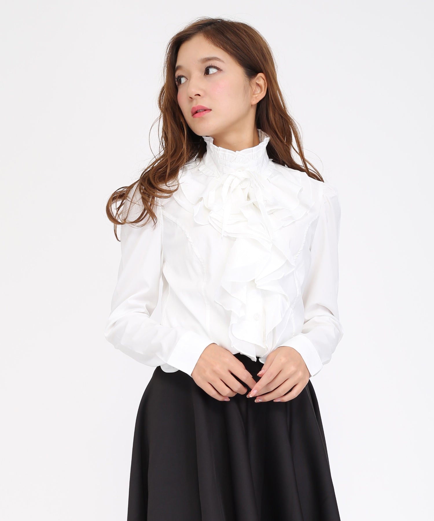 フリルをあしらったスタンドカラーで顔回りに華やかさを添える