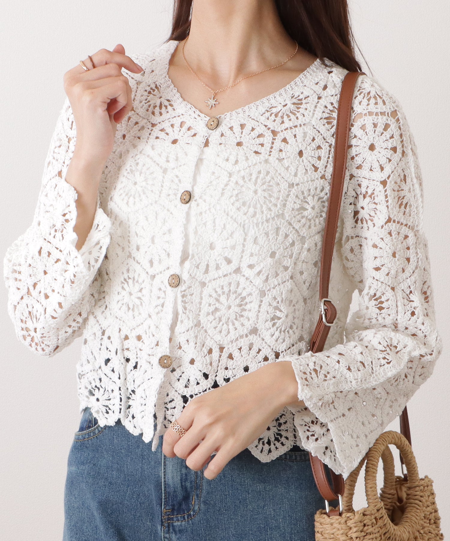 ヘキサゴン型をベースにしたレースで、甘くなりすぎず大人っぽく着こなせる1枚です。