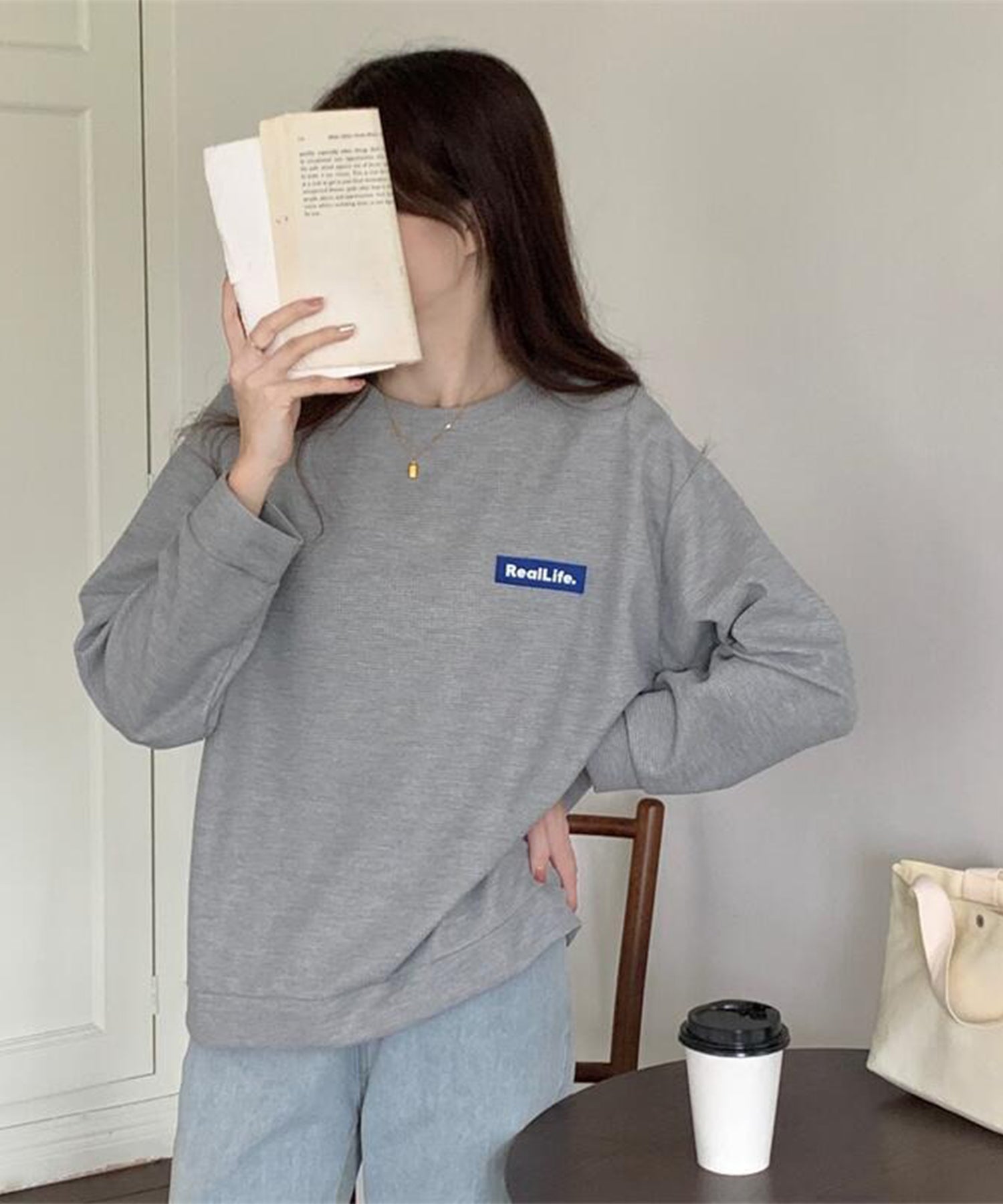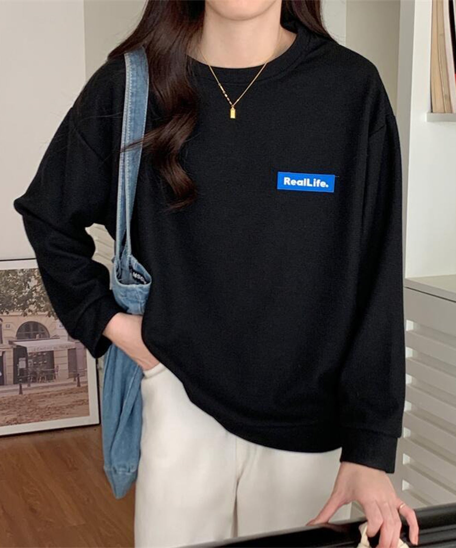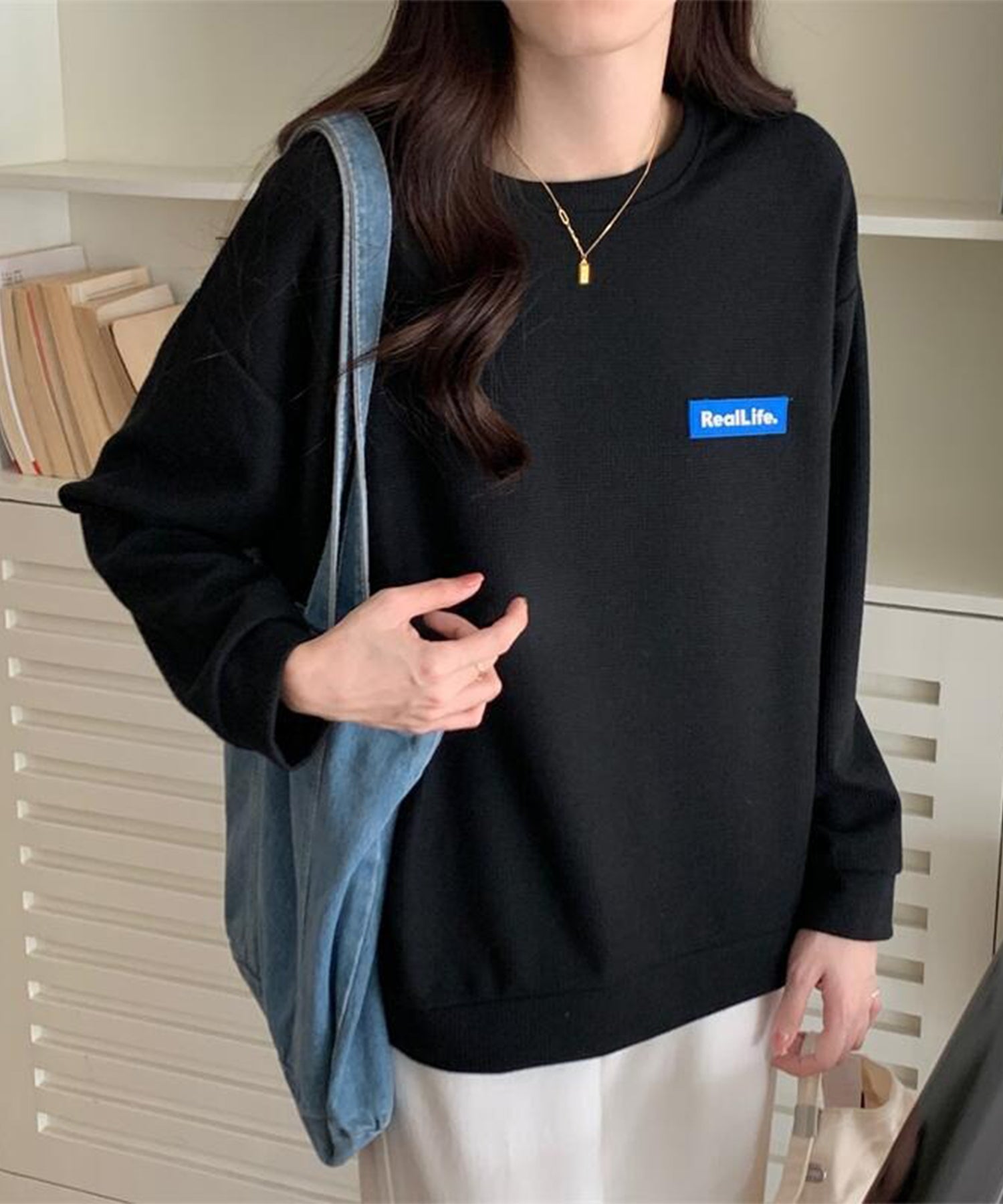 体のラインを拾わないオーバーサイズシルエットは、ドロップショルダーと相まって抜け感のある表情に。