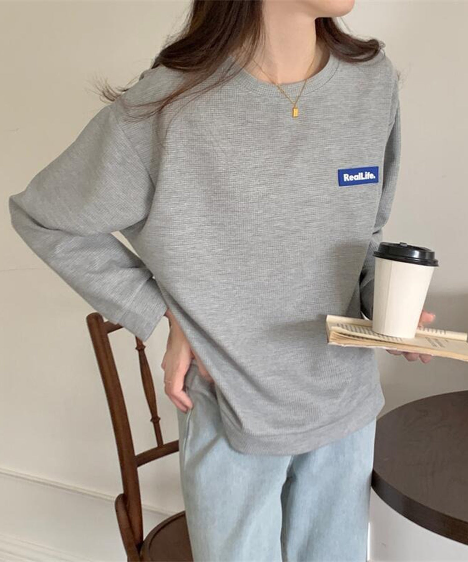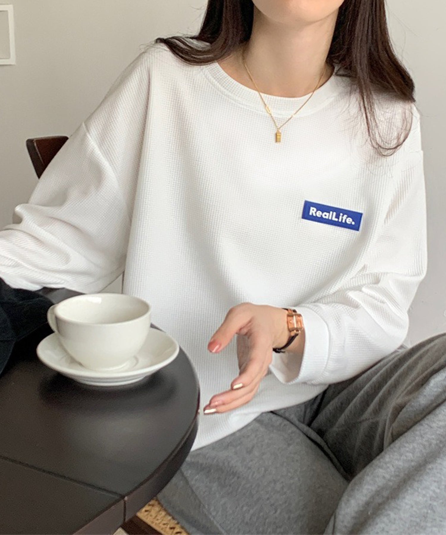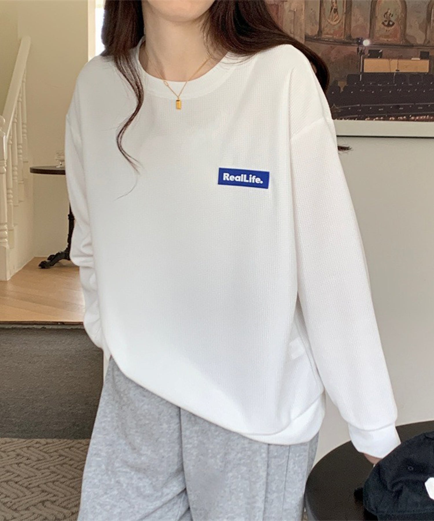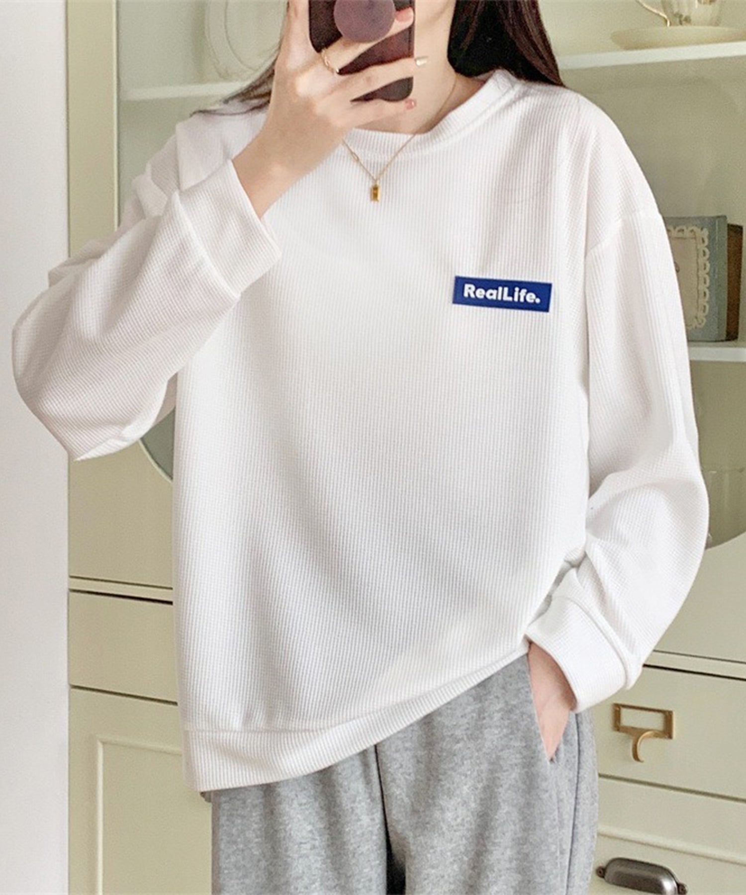 ワッフル素材 ワンポイント オーバーサイズ クルーネック プルオーバー