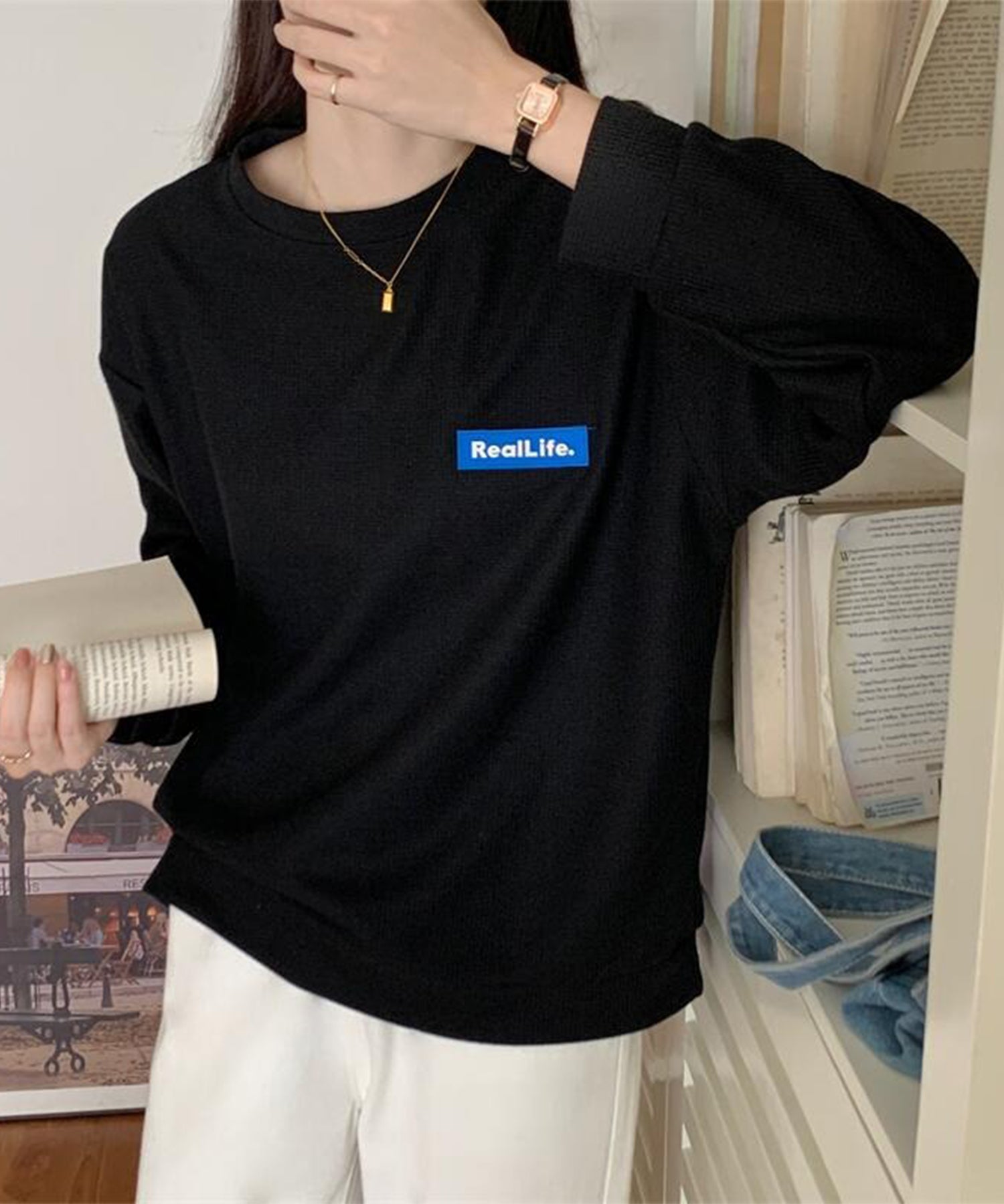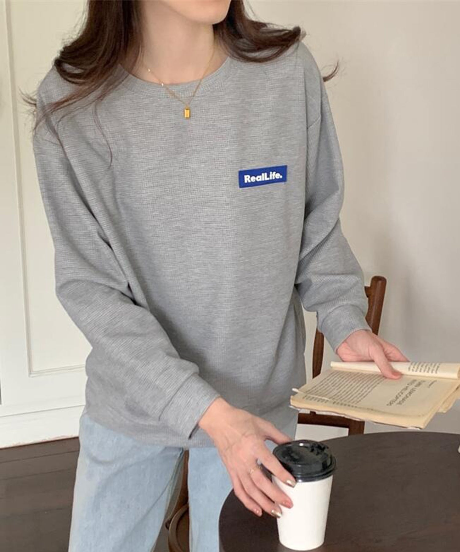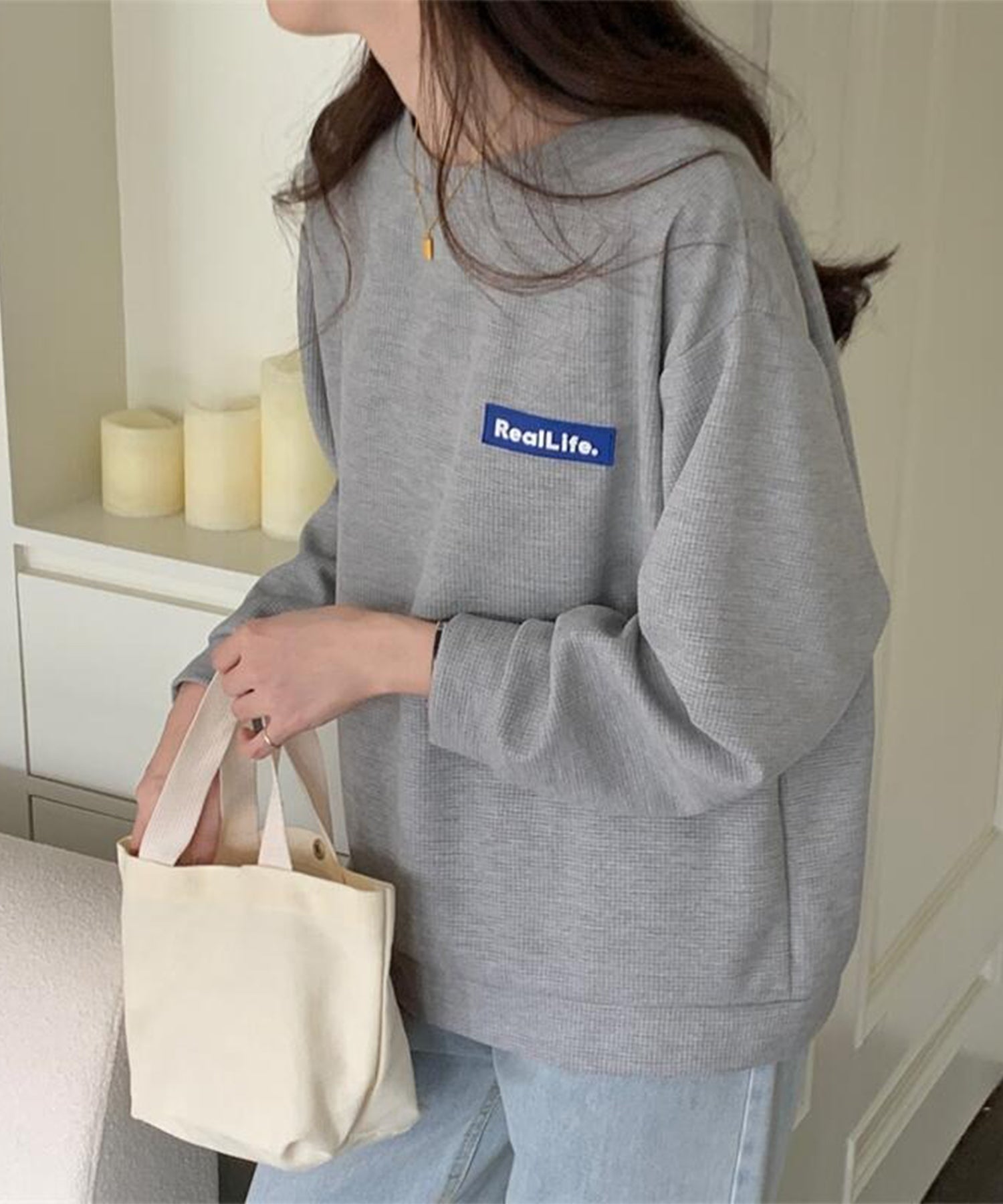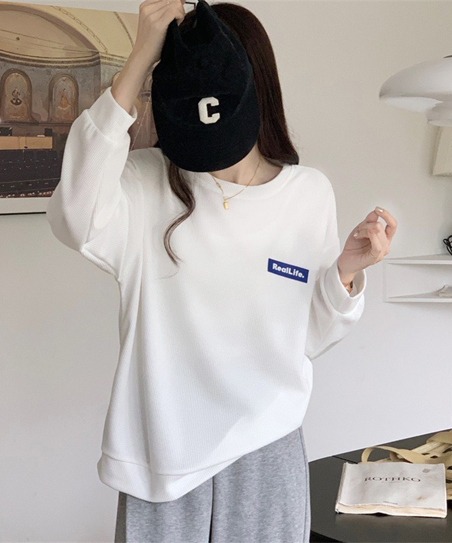 ワッフル素材 ワンポイント オーバーサイズ クルーネック プルオーバー