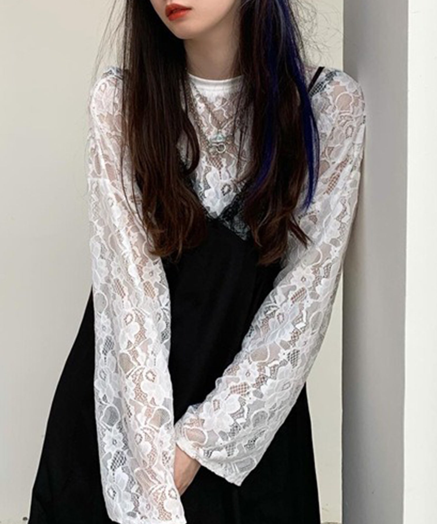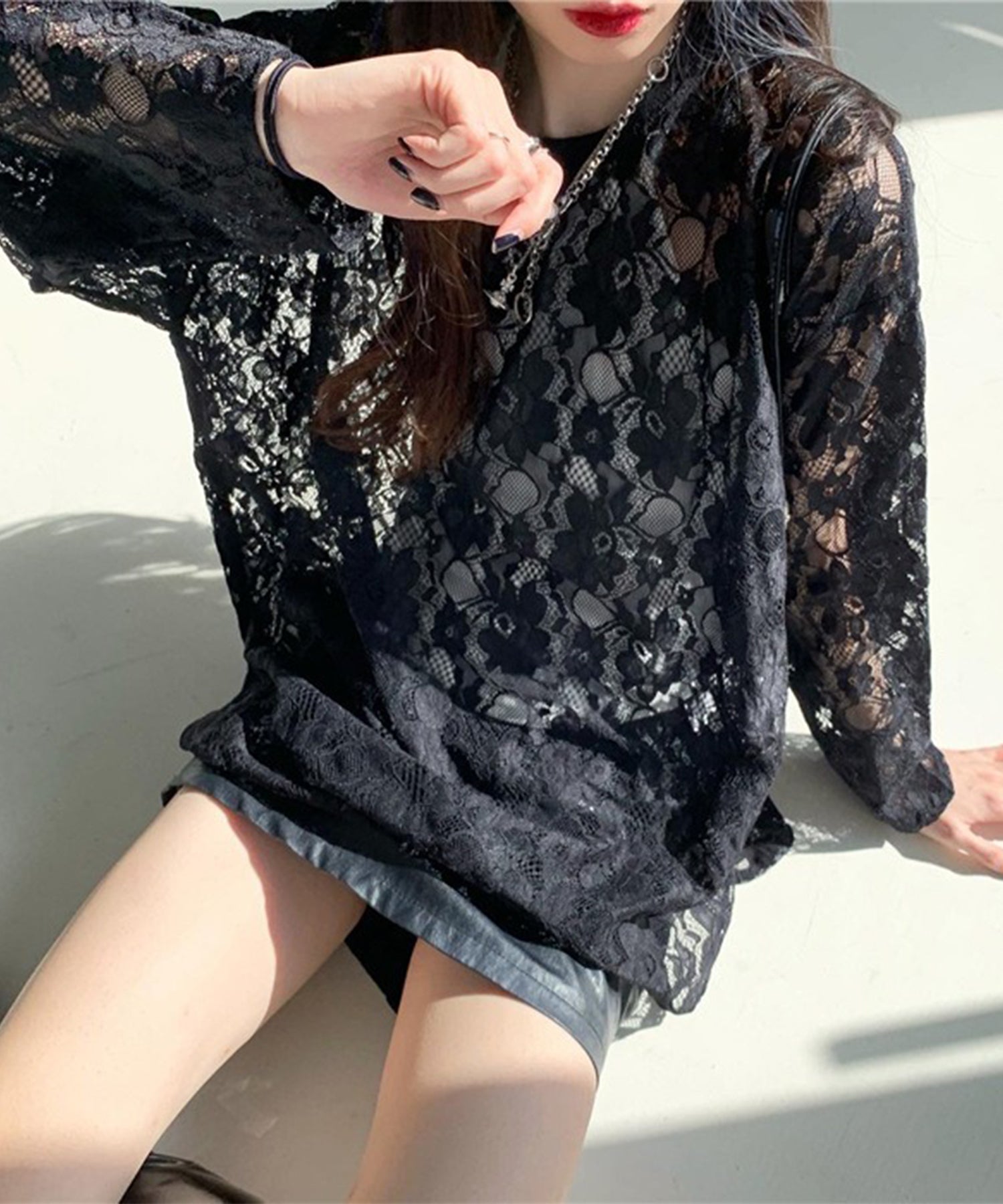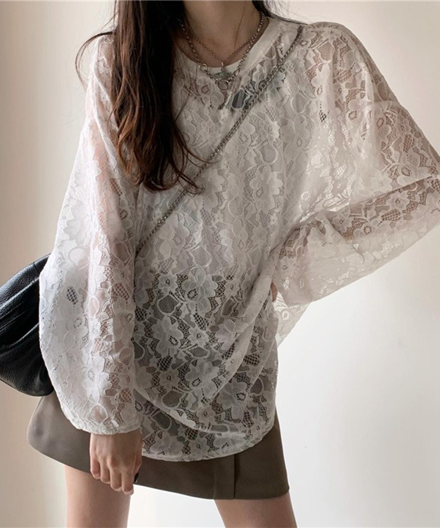レース シアー クルーネック ロング丈 プルオーバー