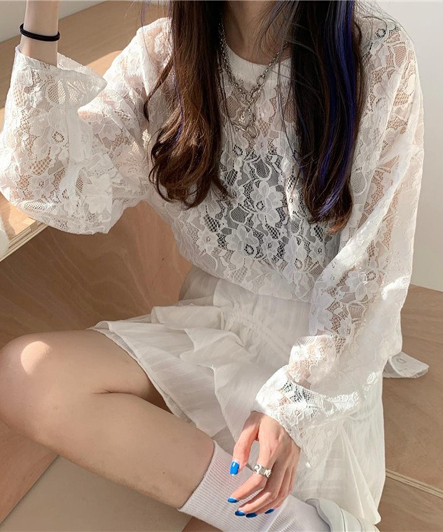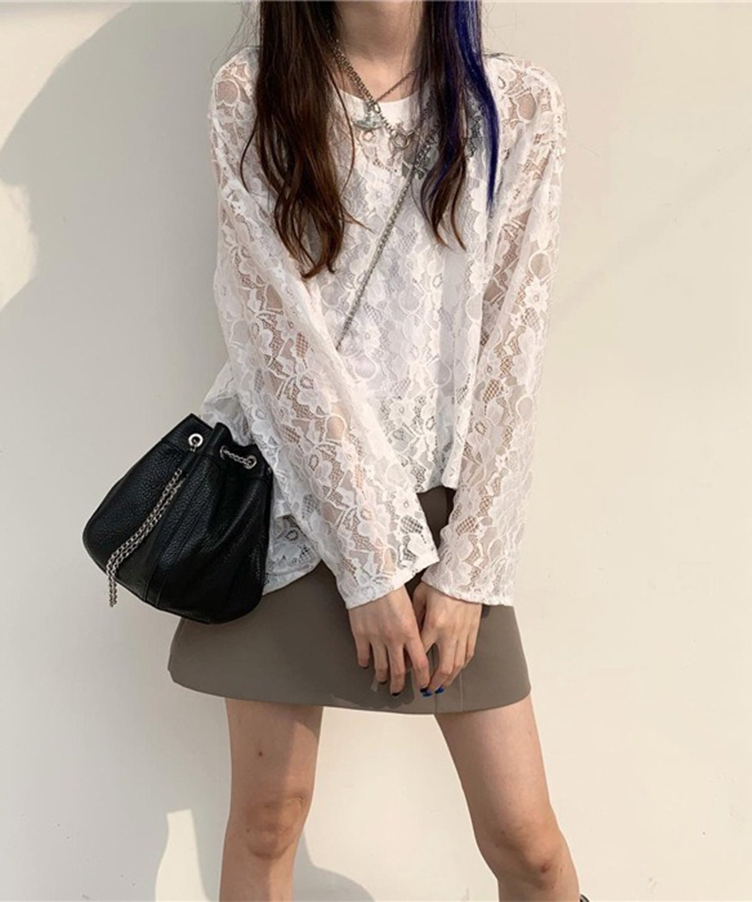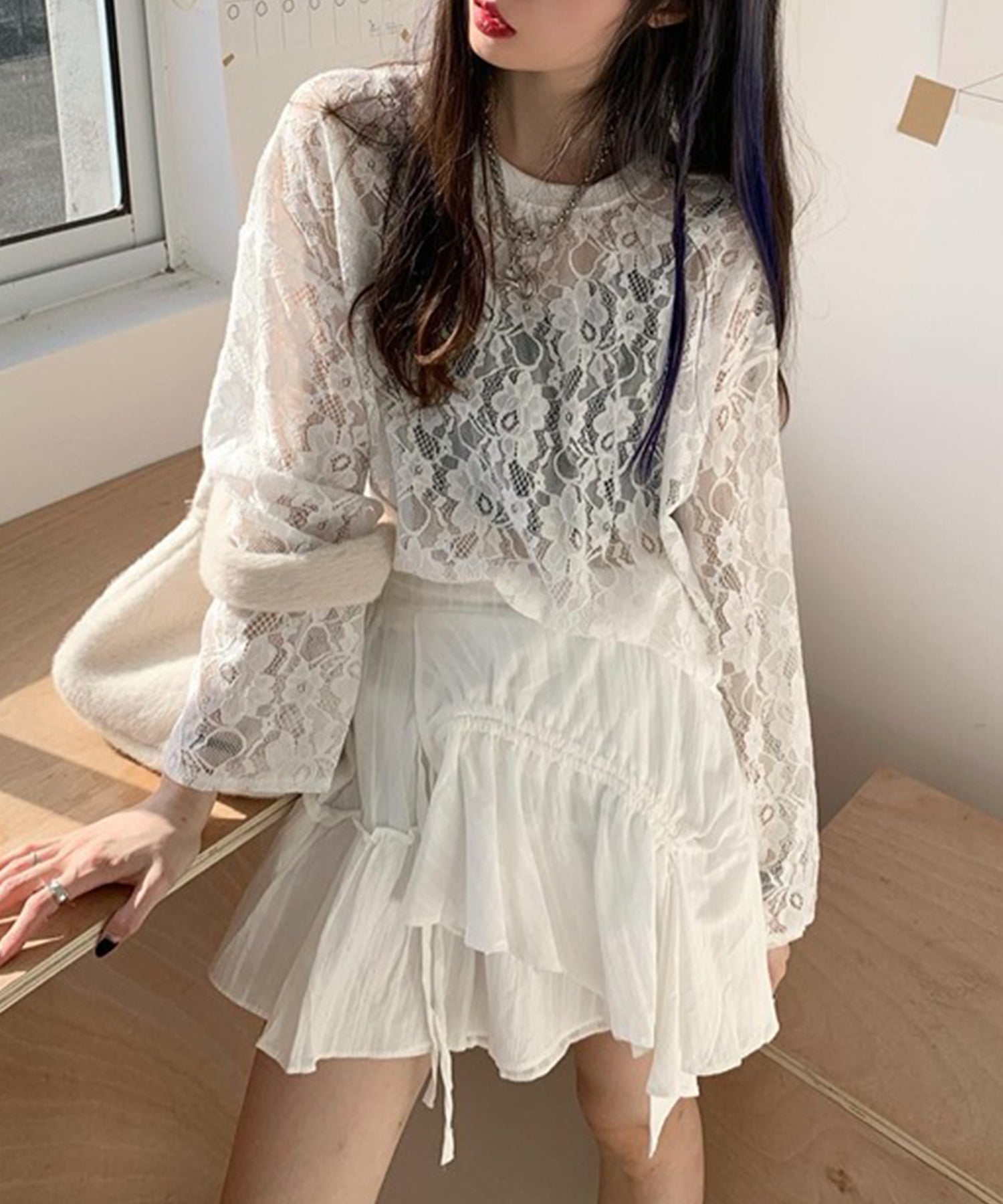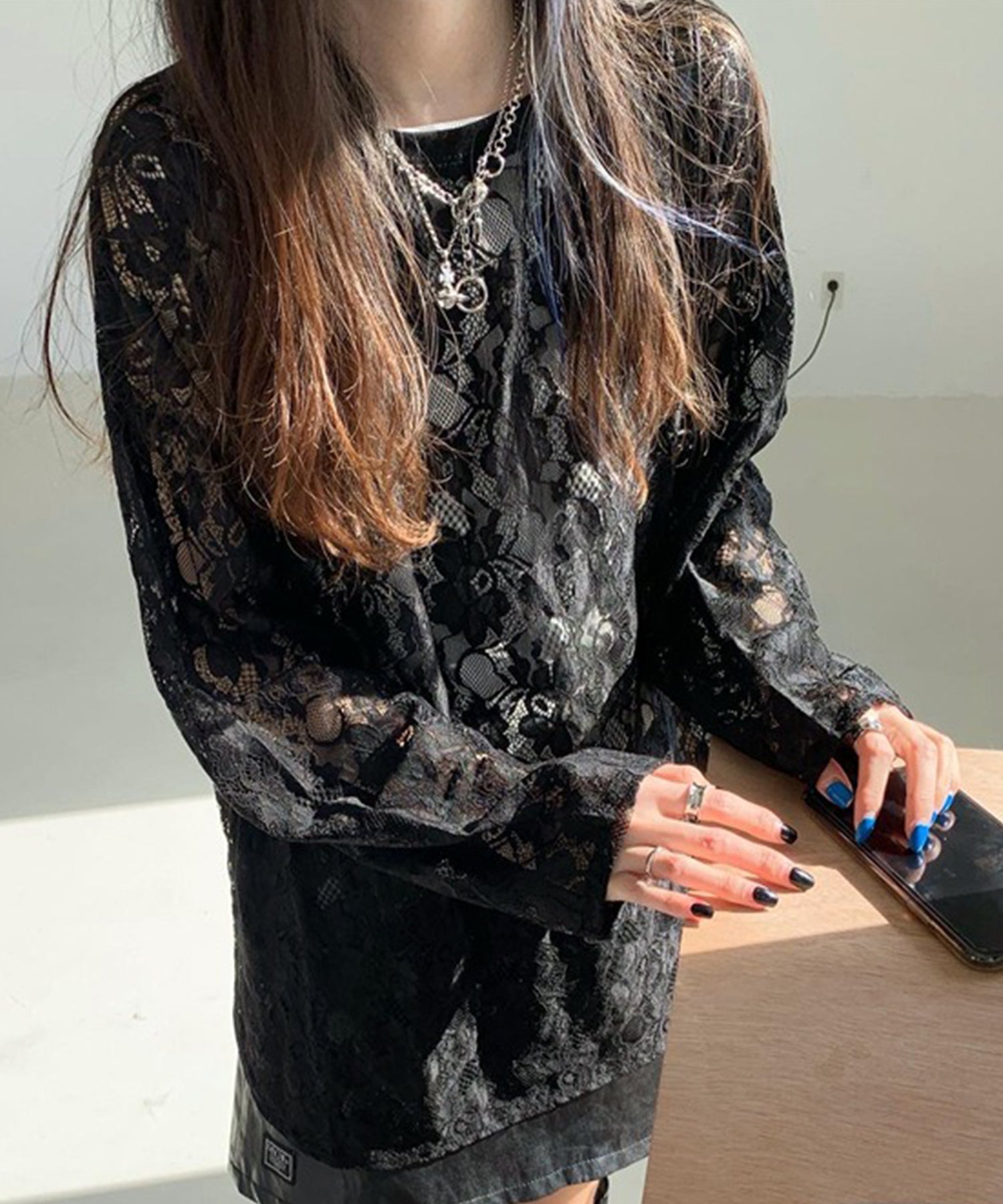 レース シアー クルーネック ロング丈 プルオーバー