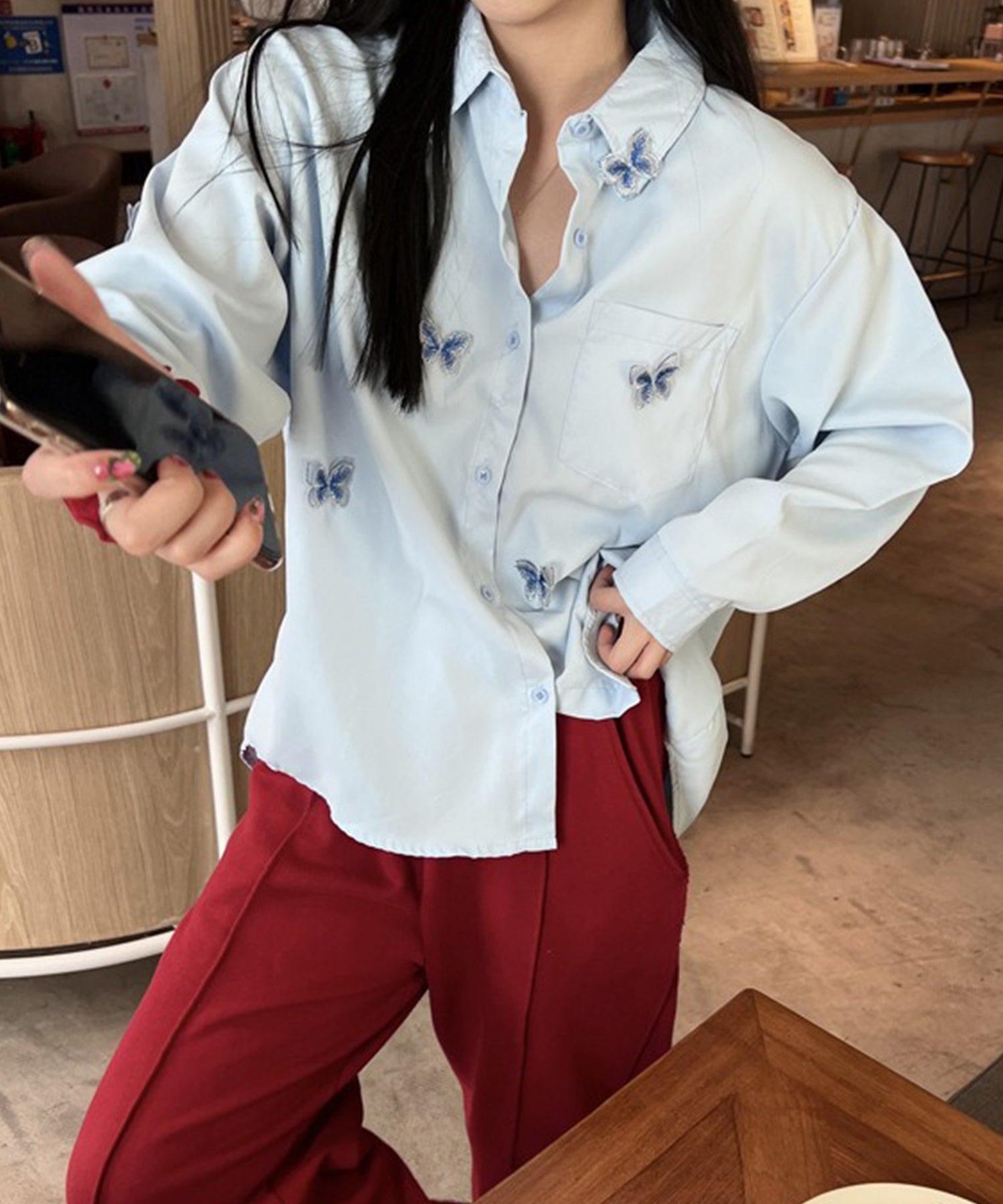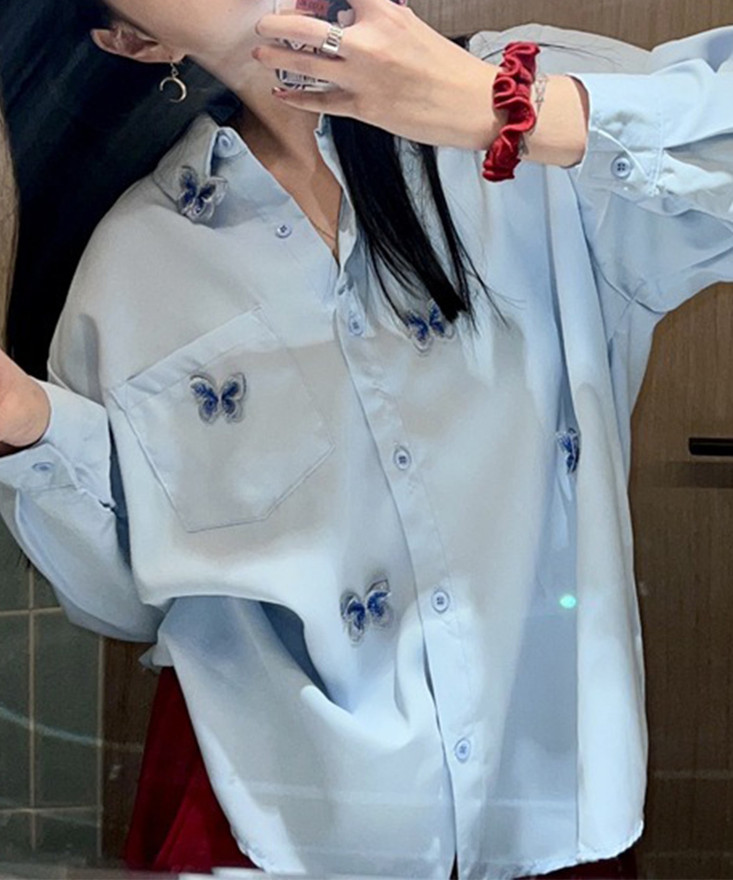 バタフライ 刺繍 レギュラーカラー オーバーサイズ シャツ