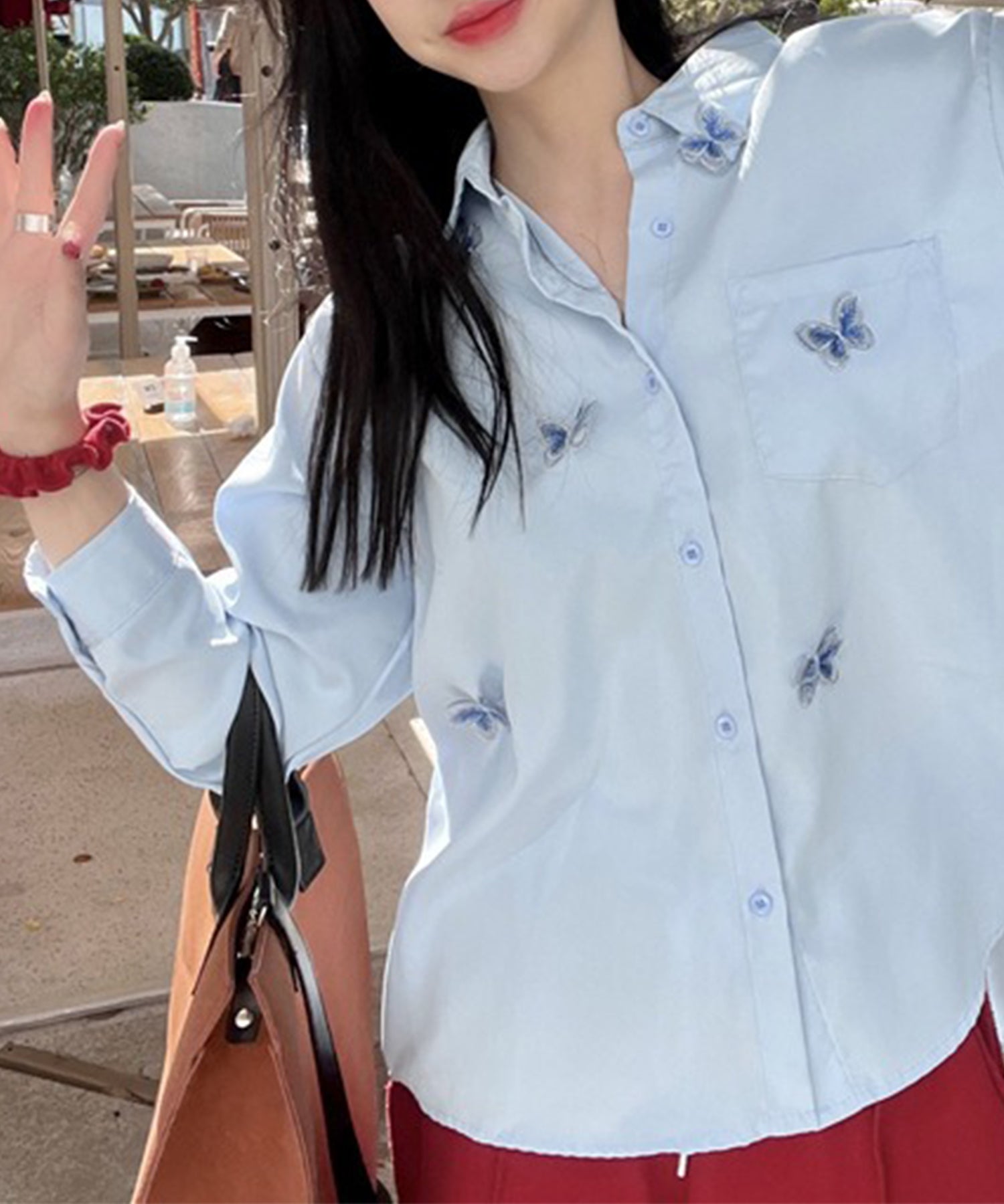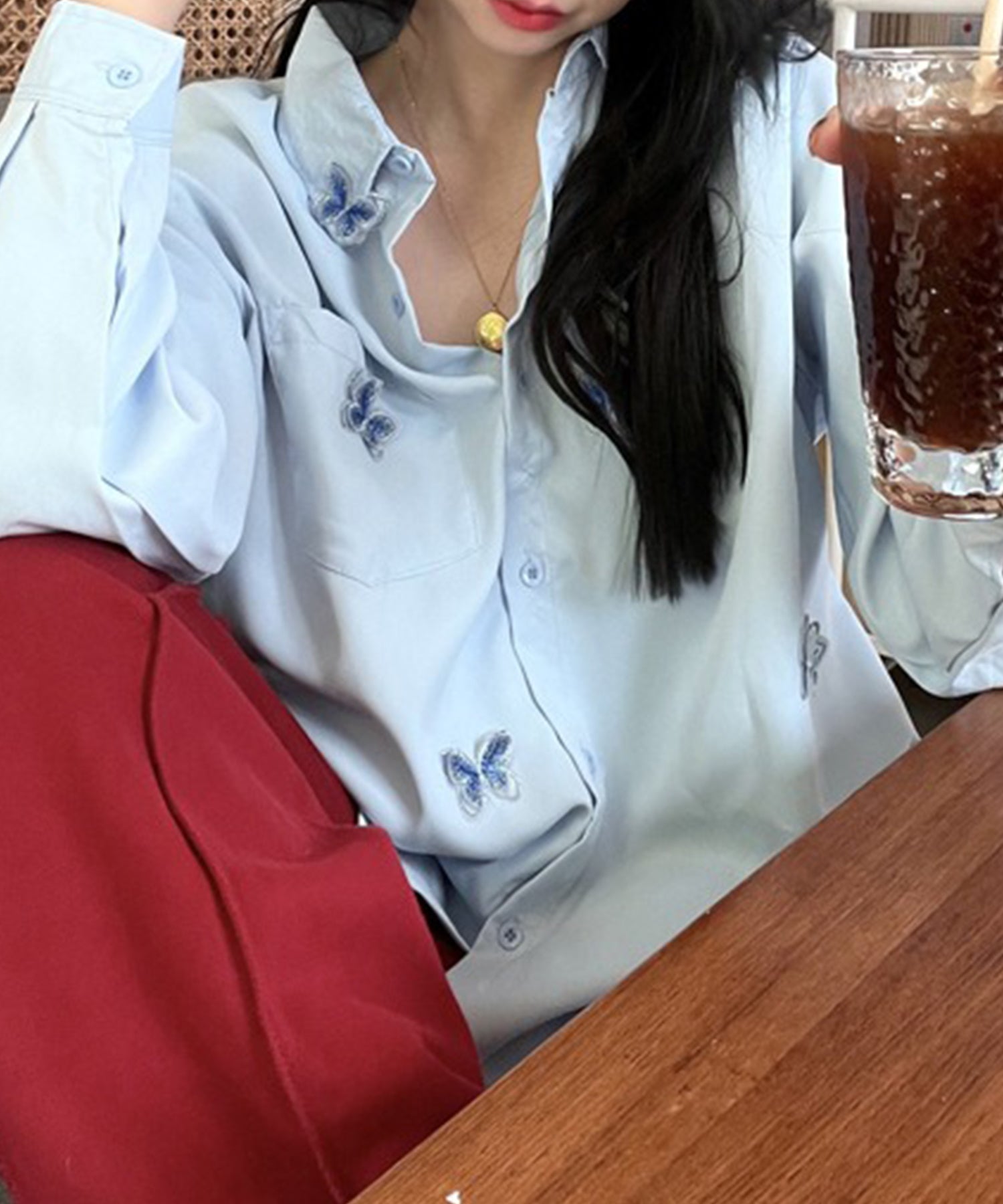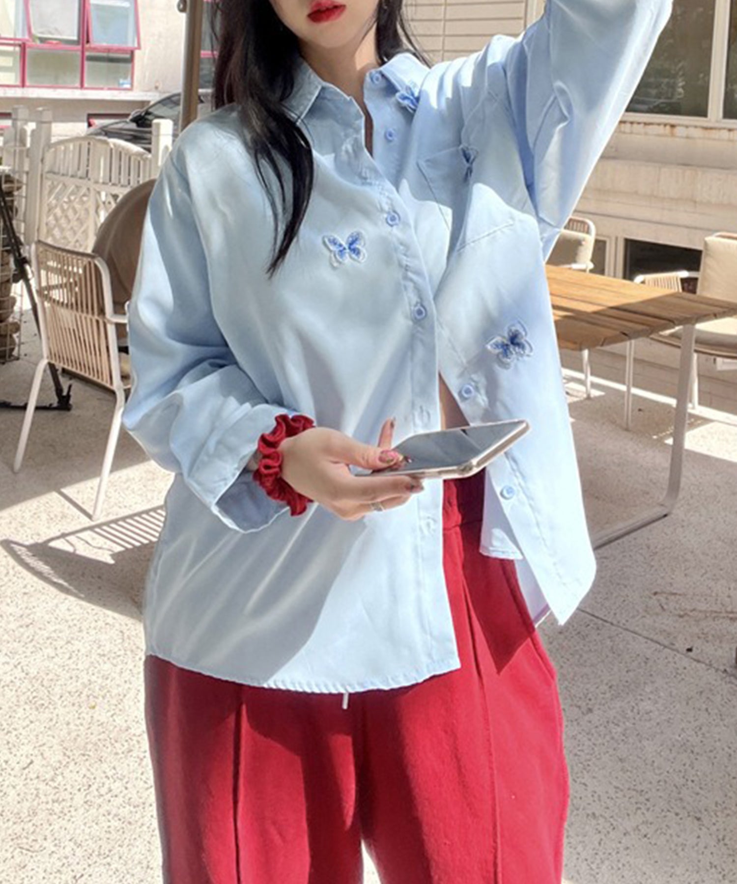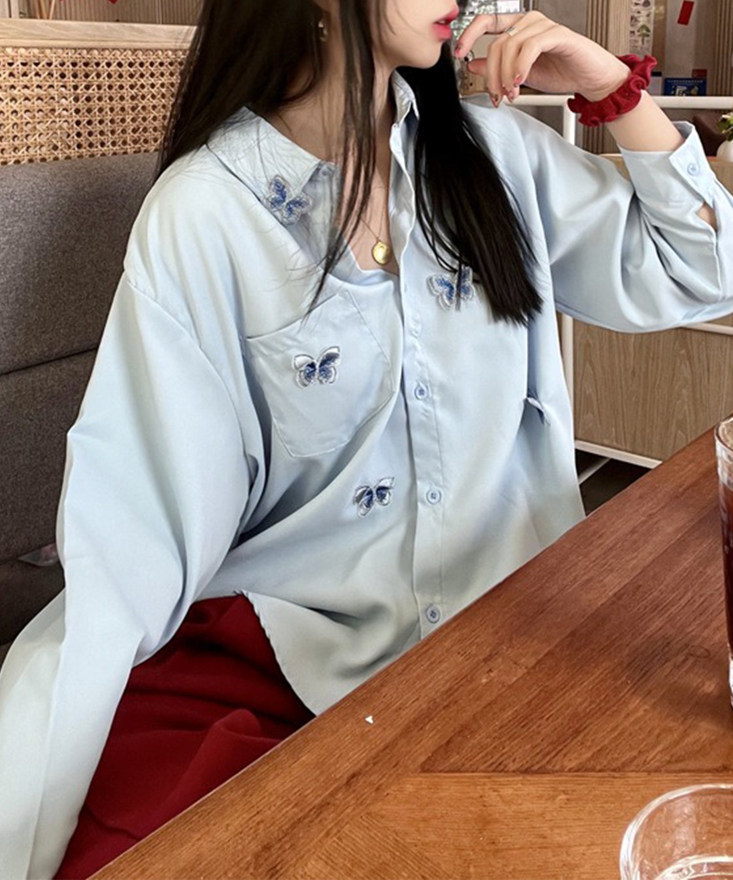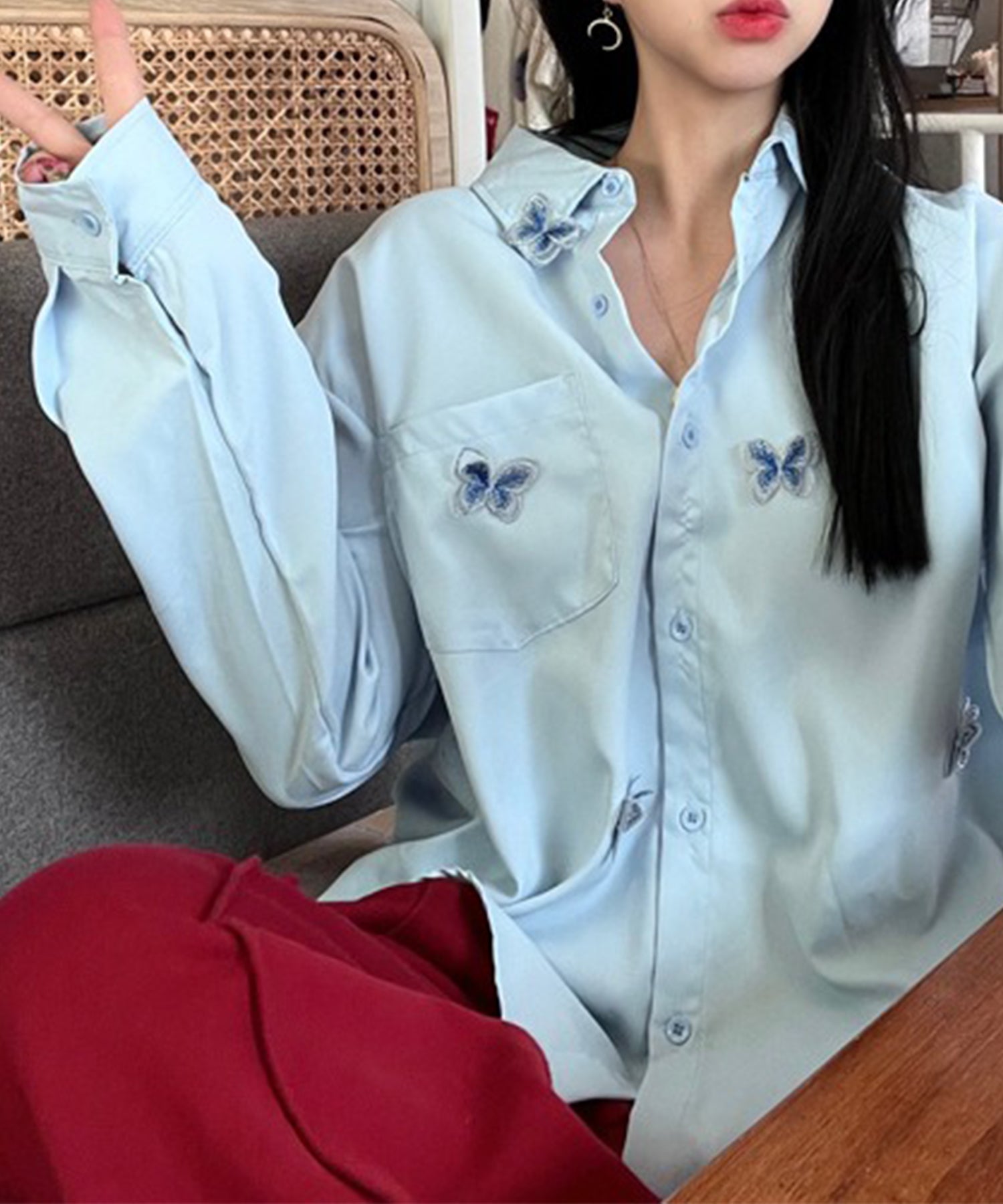 バタフライモチーフを飾ったオーバーサイズシャツ。