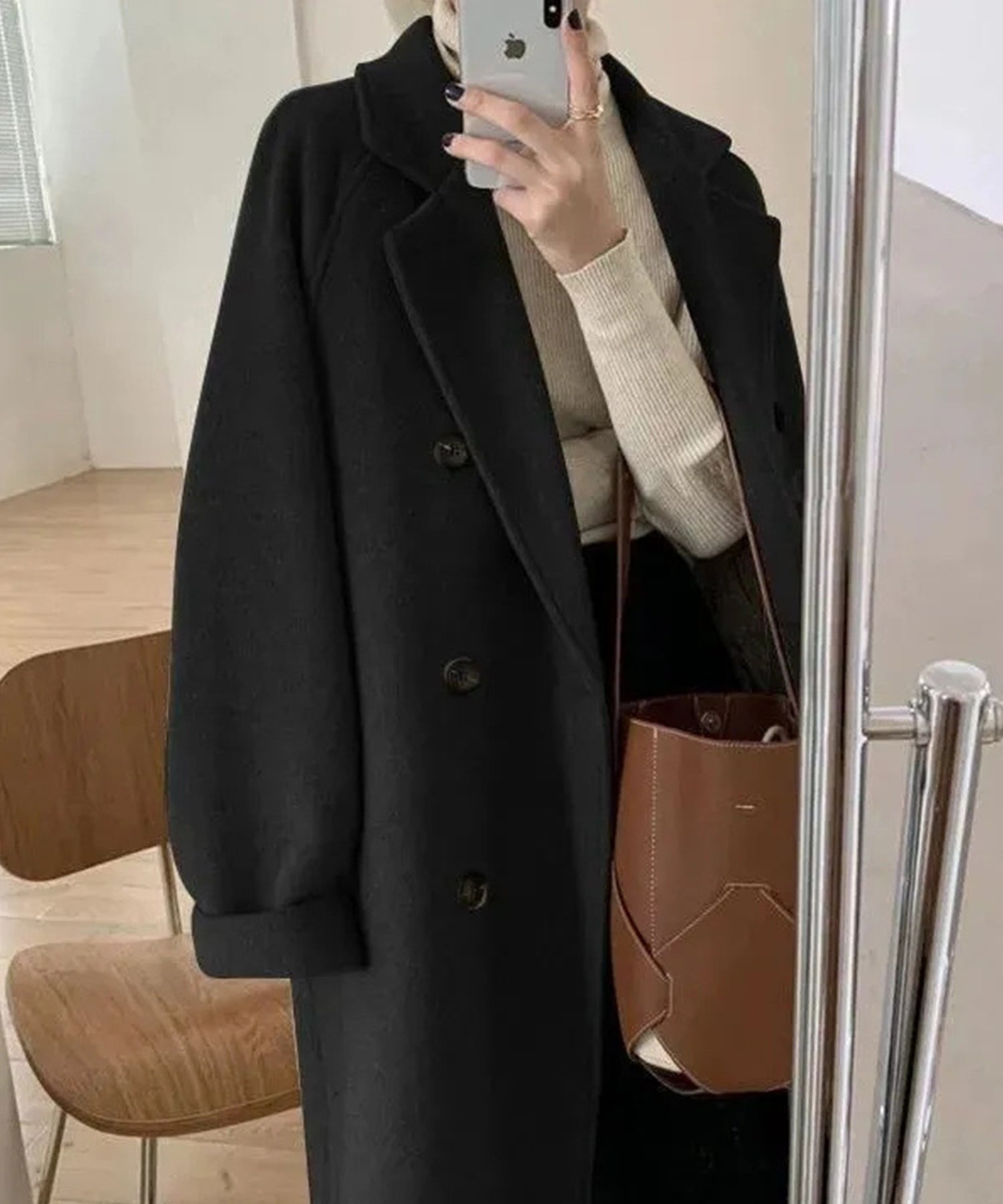 ウールライクな生地を使用したダブルブレストのロングコート。