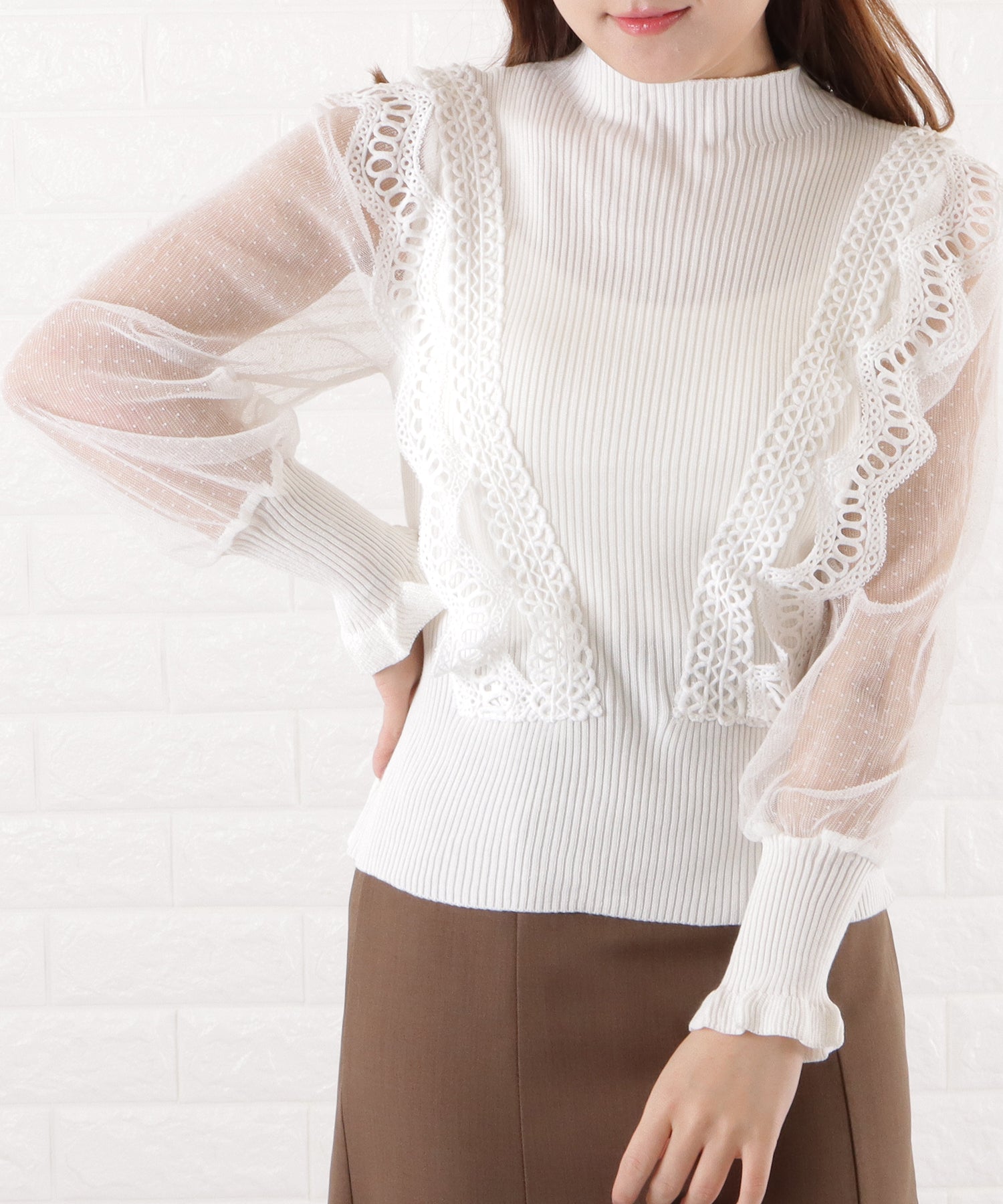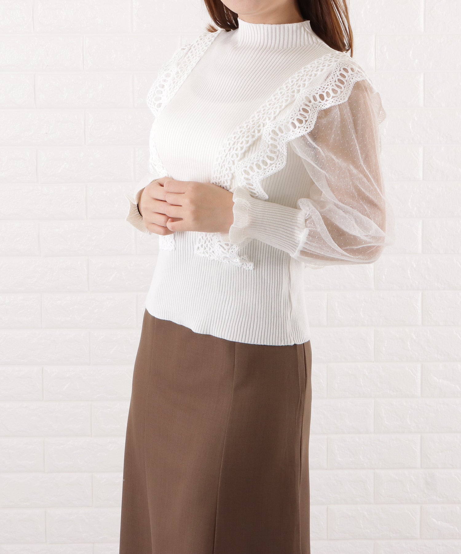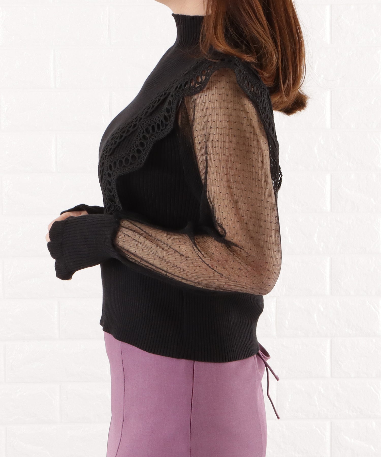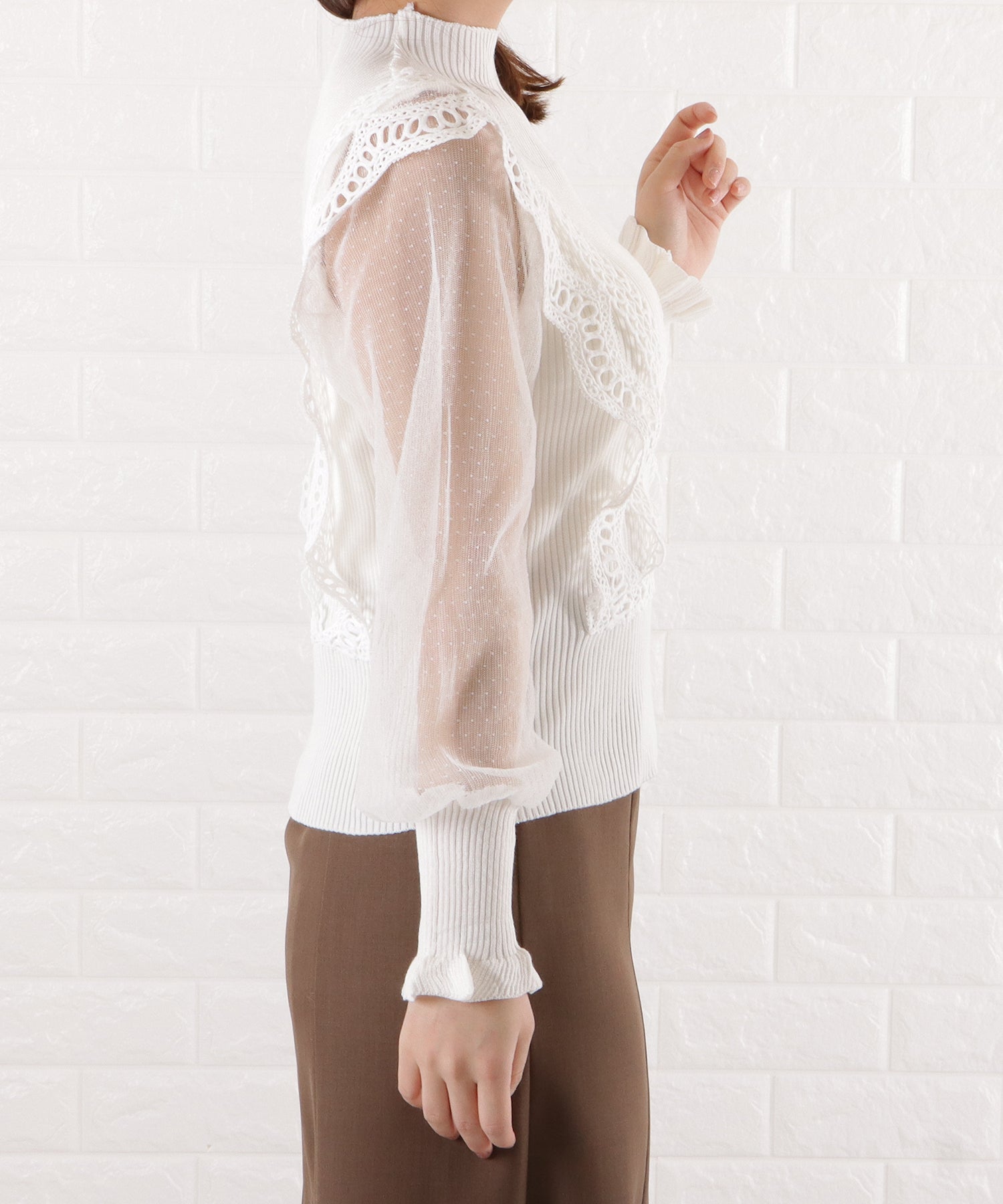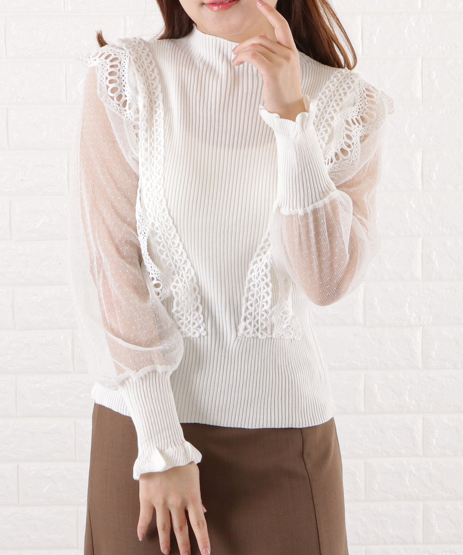 Vレース付きハーフハイネック チュール長袖ニット?レースデザイン
