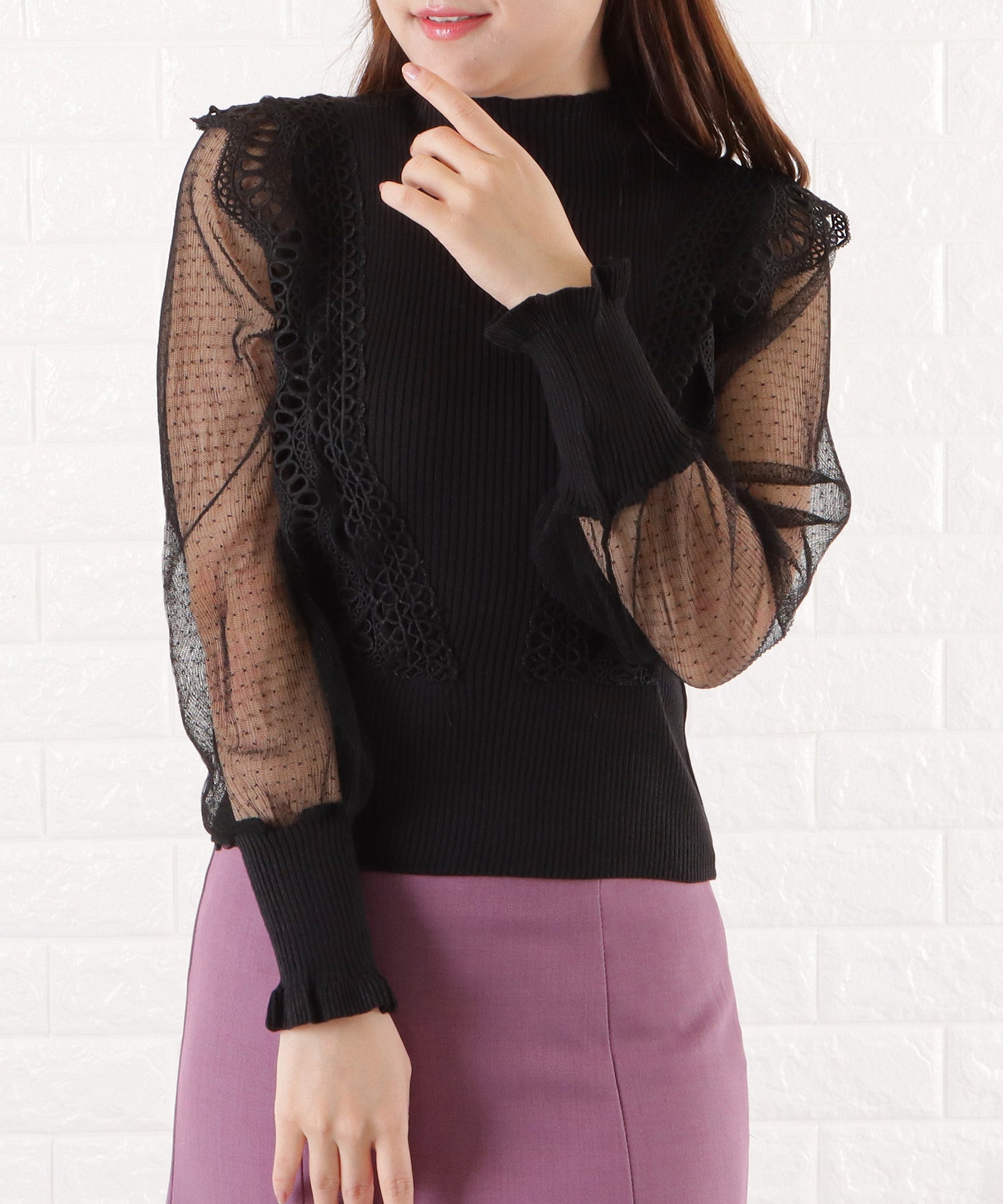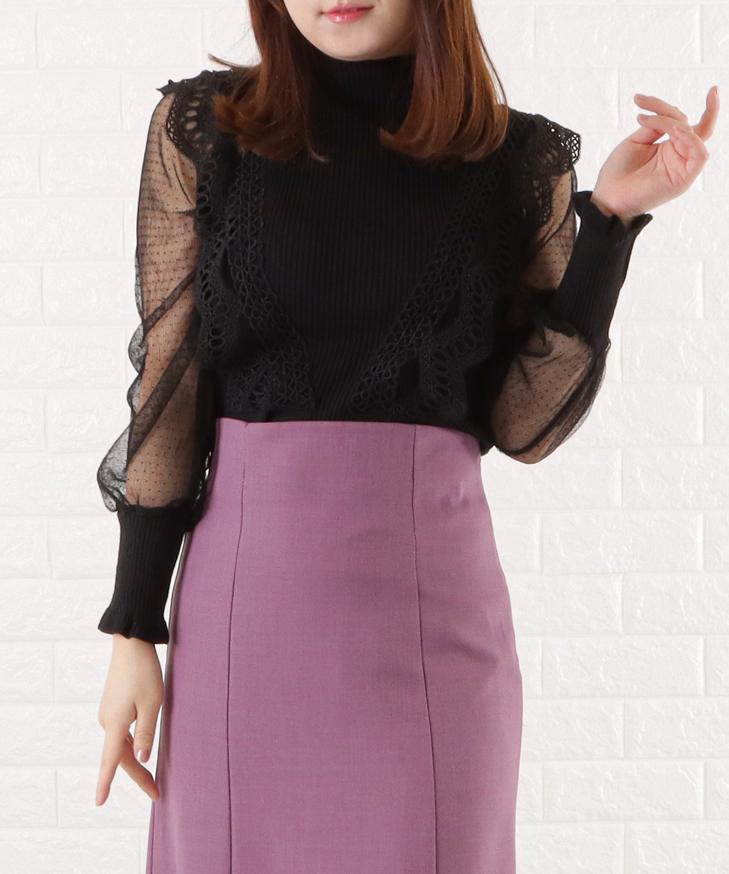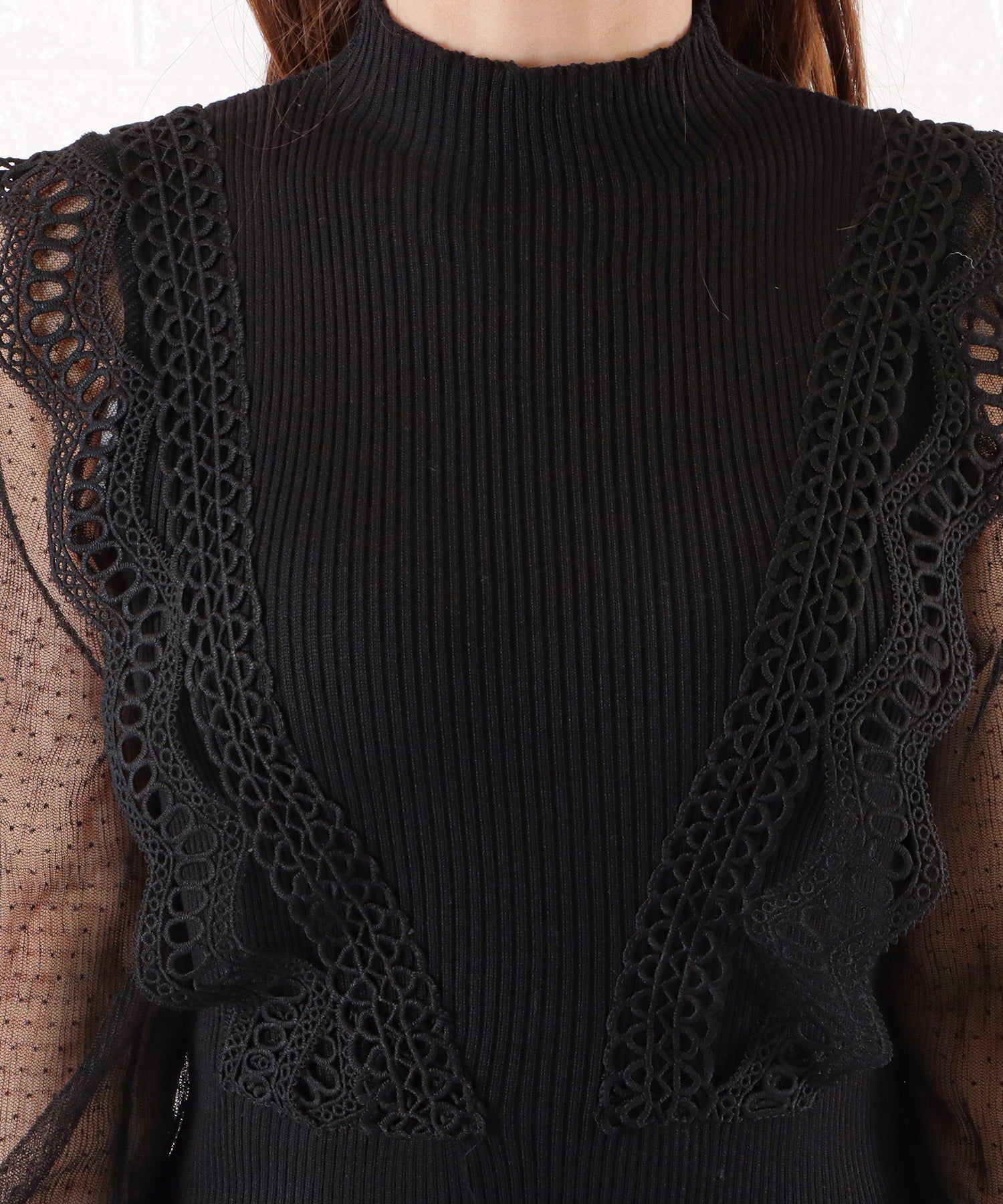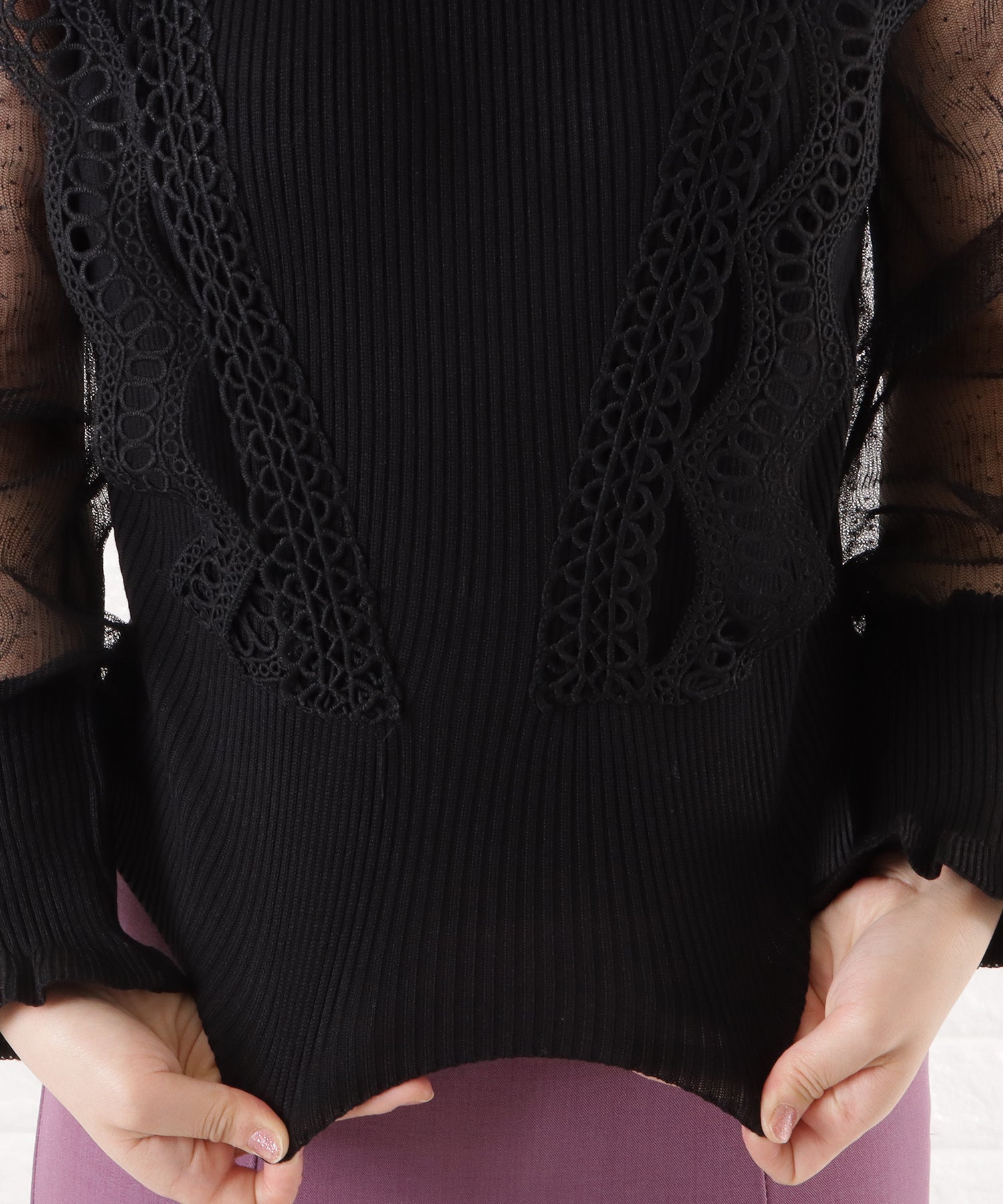 Vレース付きハーフハイネック チュール長袖ニット?レースデザイン