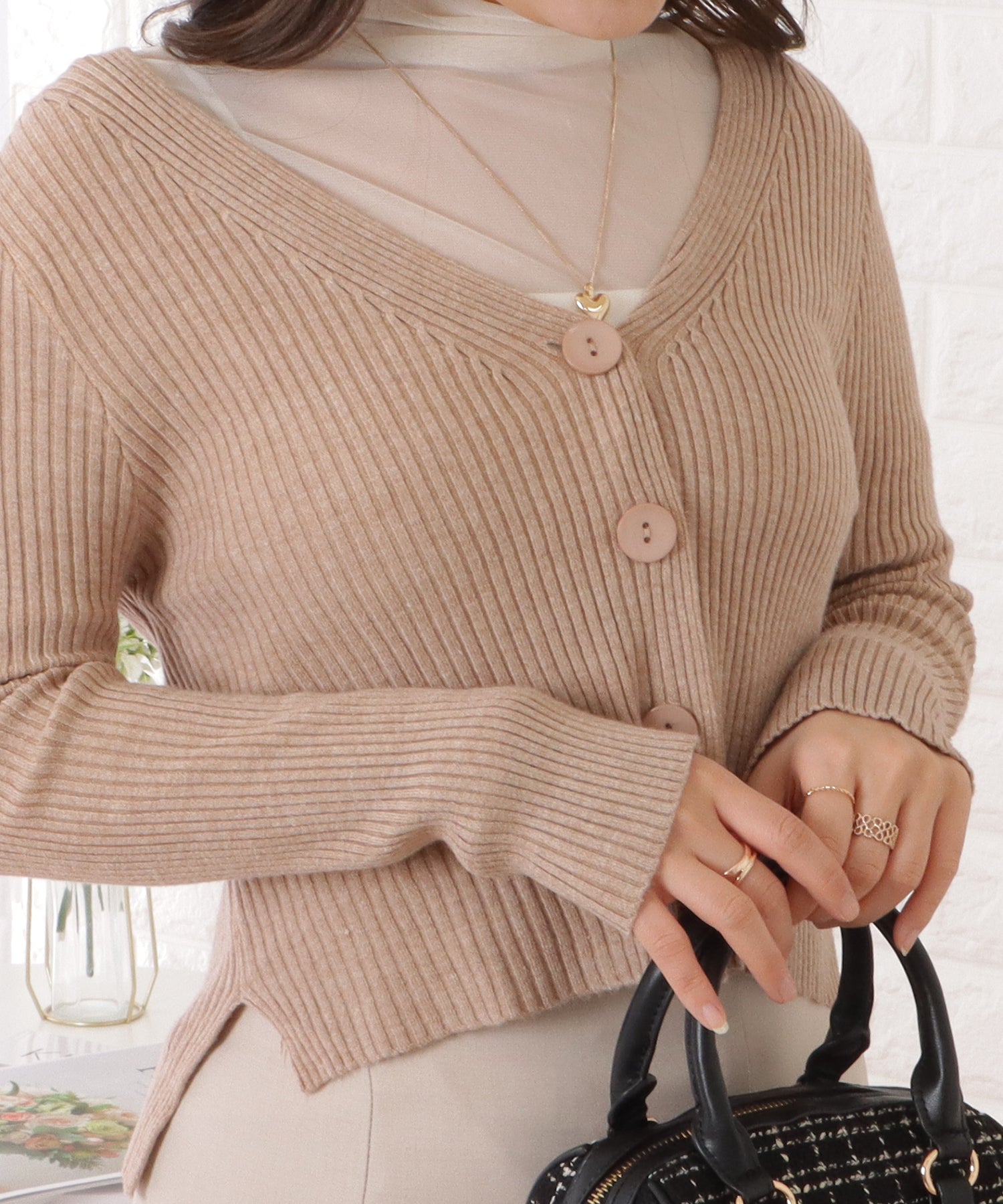 大きくあいたVネックは、デコルテラインを美しく見せてくれるので、ボタンを留めてトップスとしての着用も◎