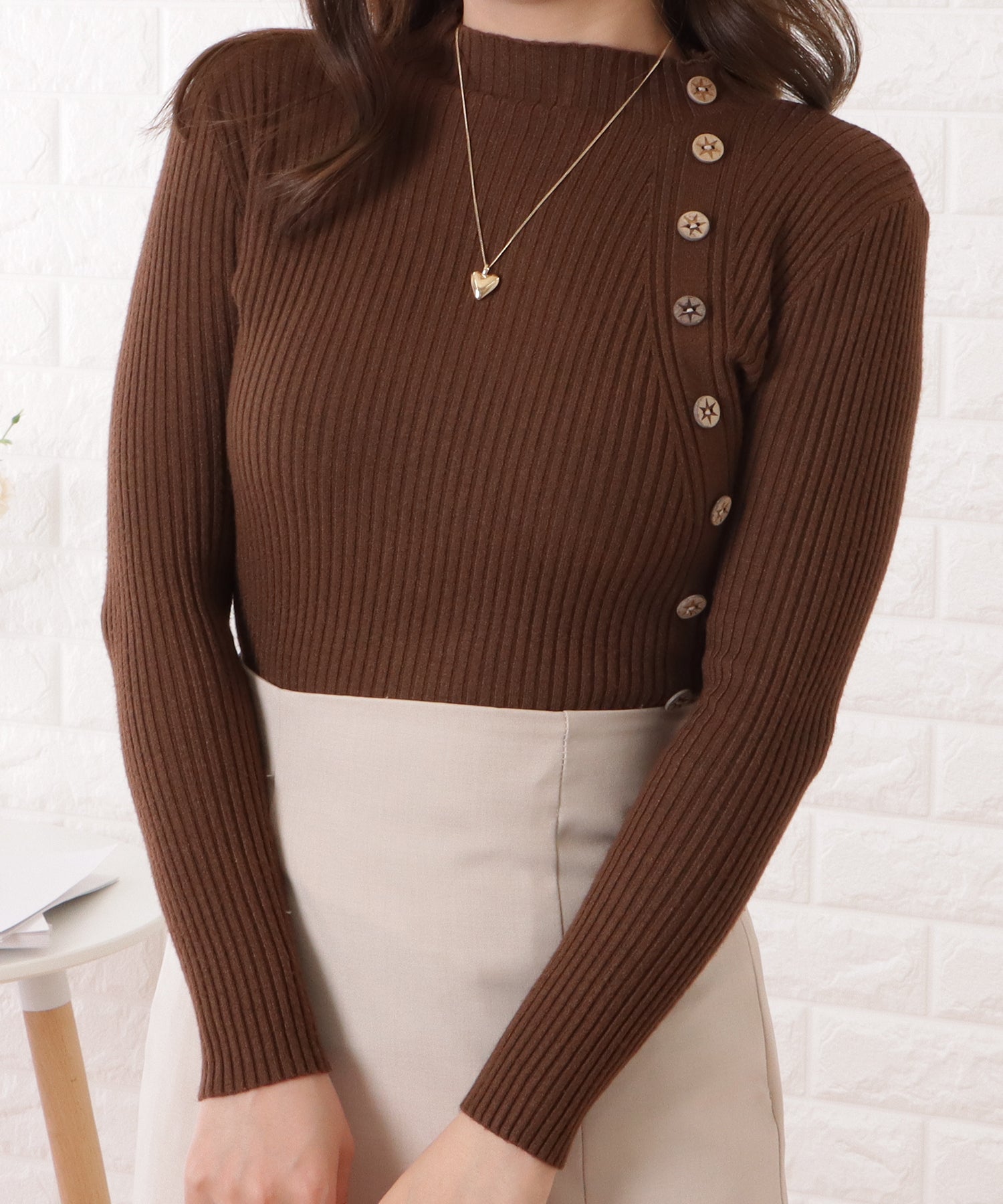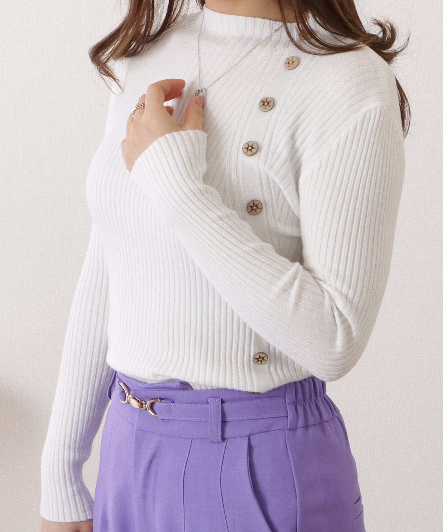 無地ベースにボタンを一列に並べた、アシンメトリーデザインが個性的な1枚です。