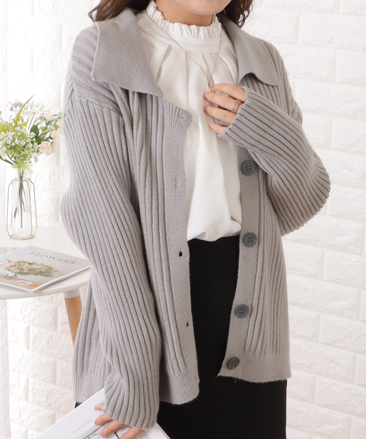 まるでシャツのようなルックスが魅力の、衿付きニットカーディガン。