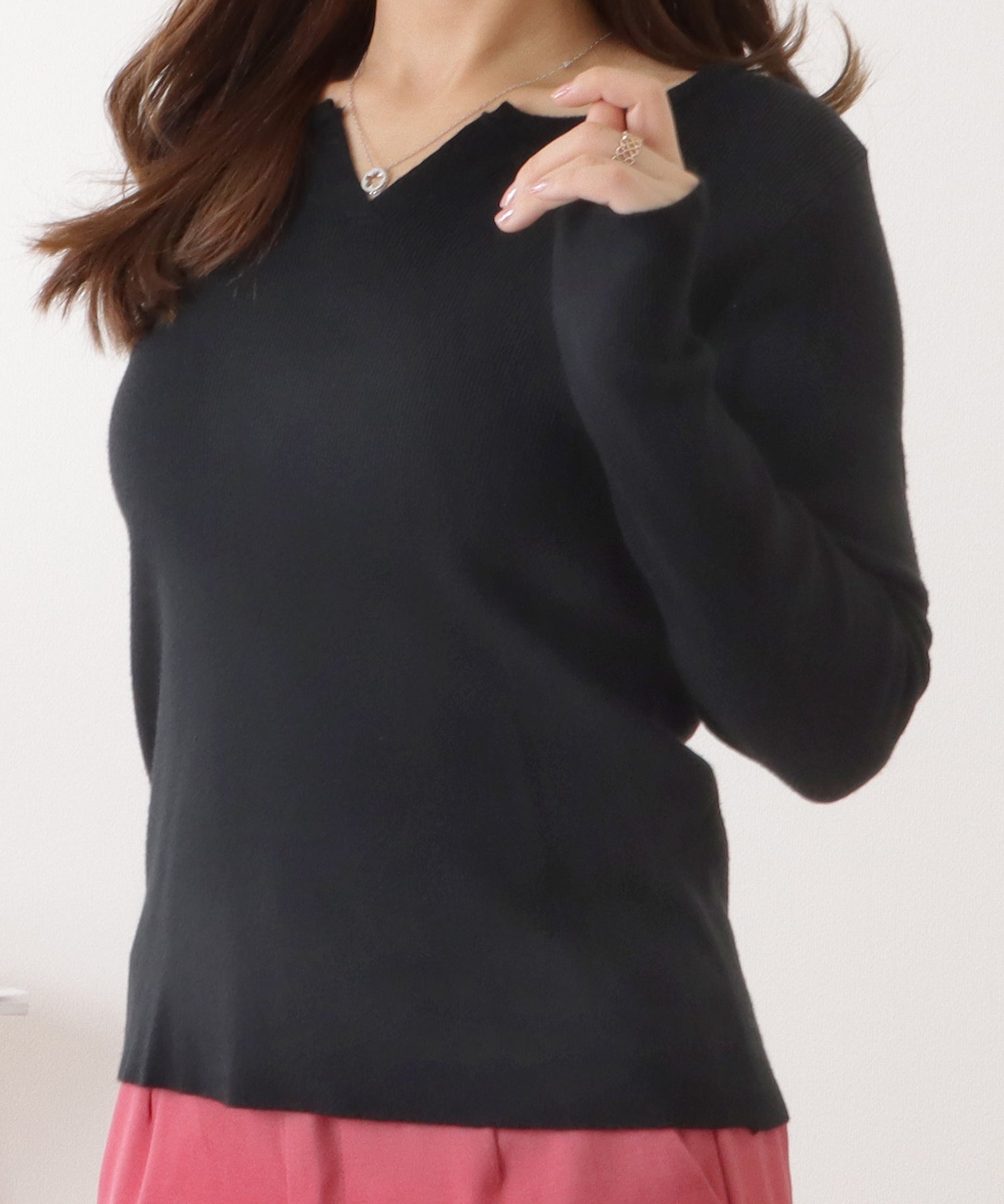 キーネックシンプル長袖ニットプルオーバー