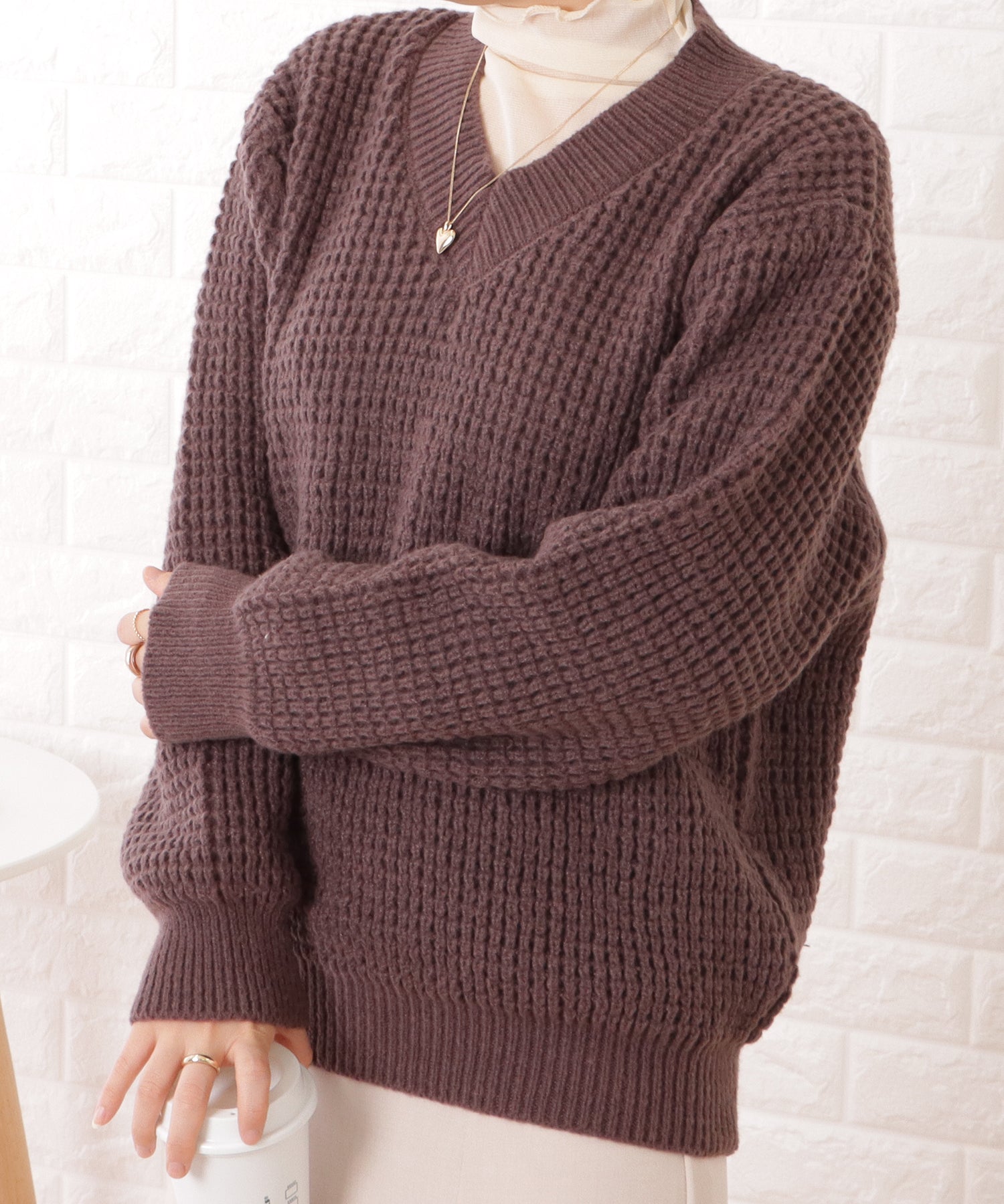 存在感のある幅広のリブで仕立てたVネックは、やや首詰まりにすることで引き締まった印象に。