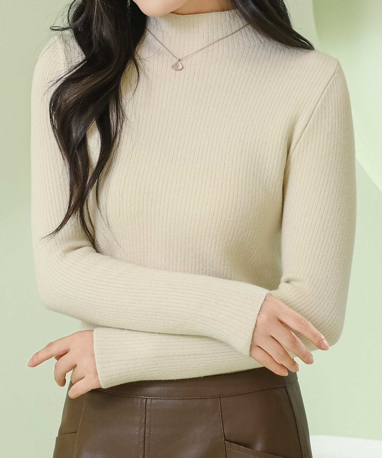 生地にはフィット感は心地良い伸縮のあるリブベースを採用し、首元はモックネックで上品な佇まいに仕上げました。