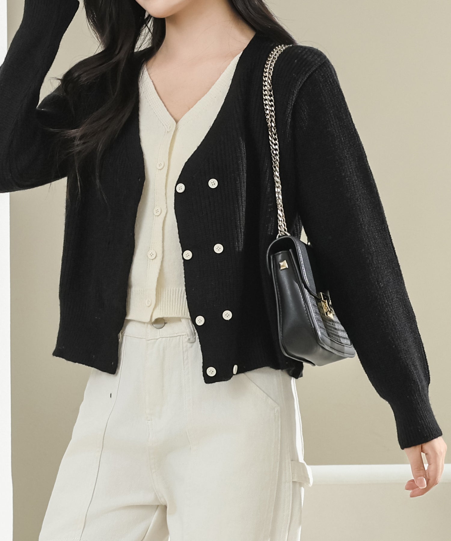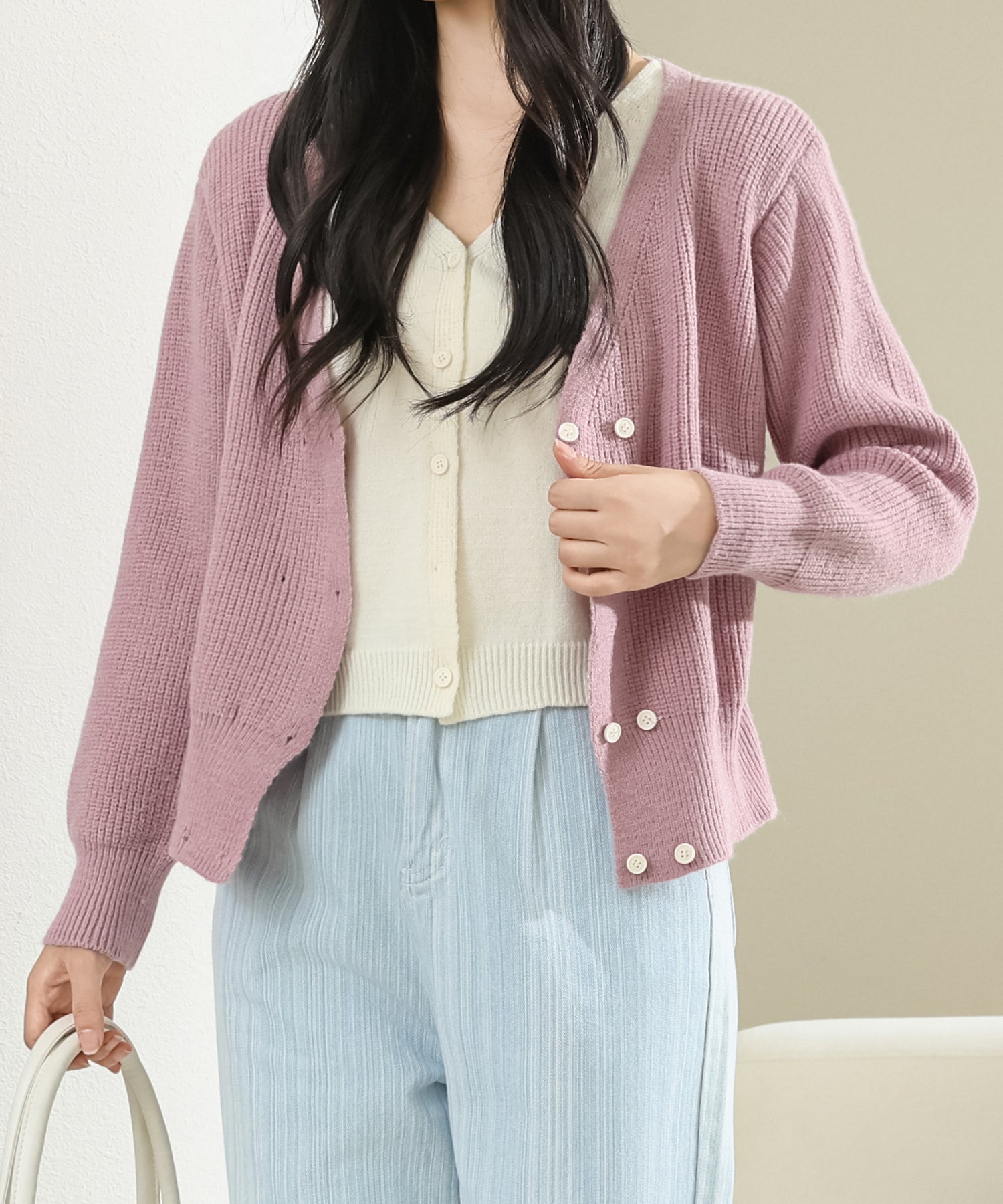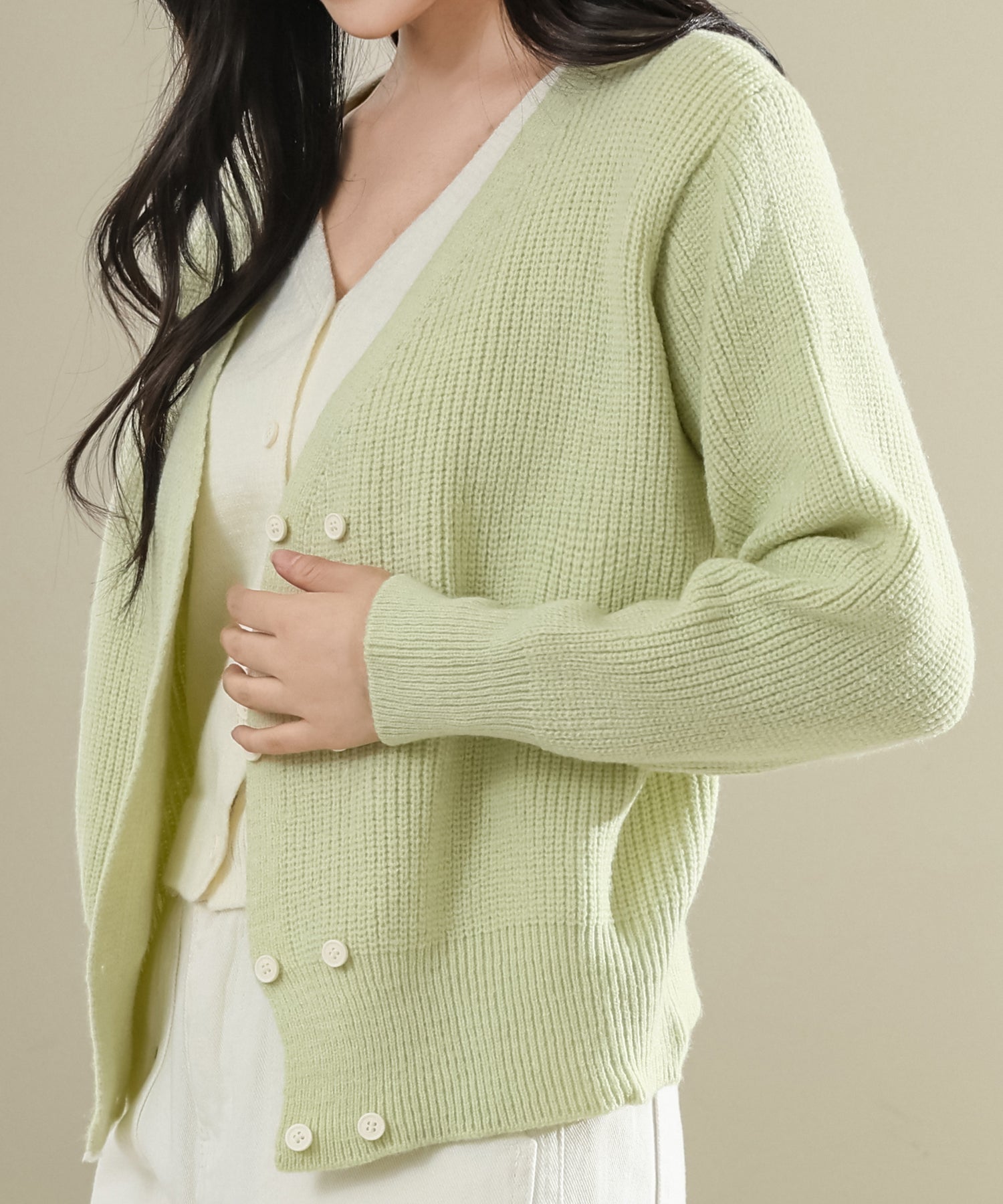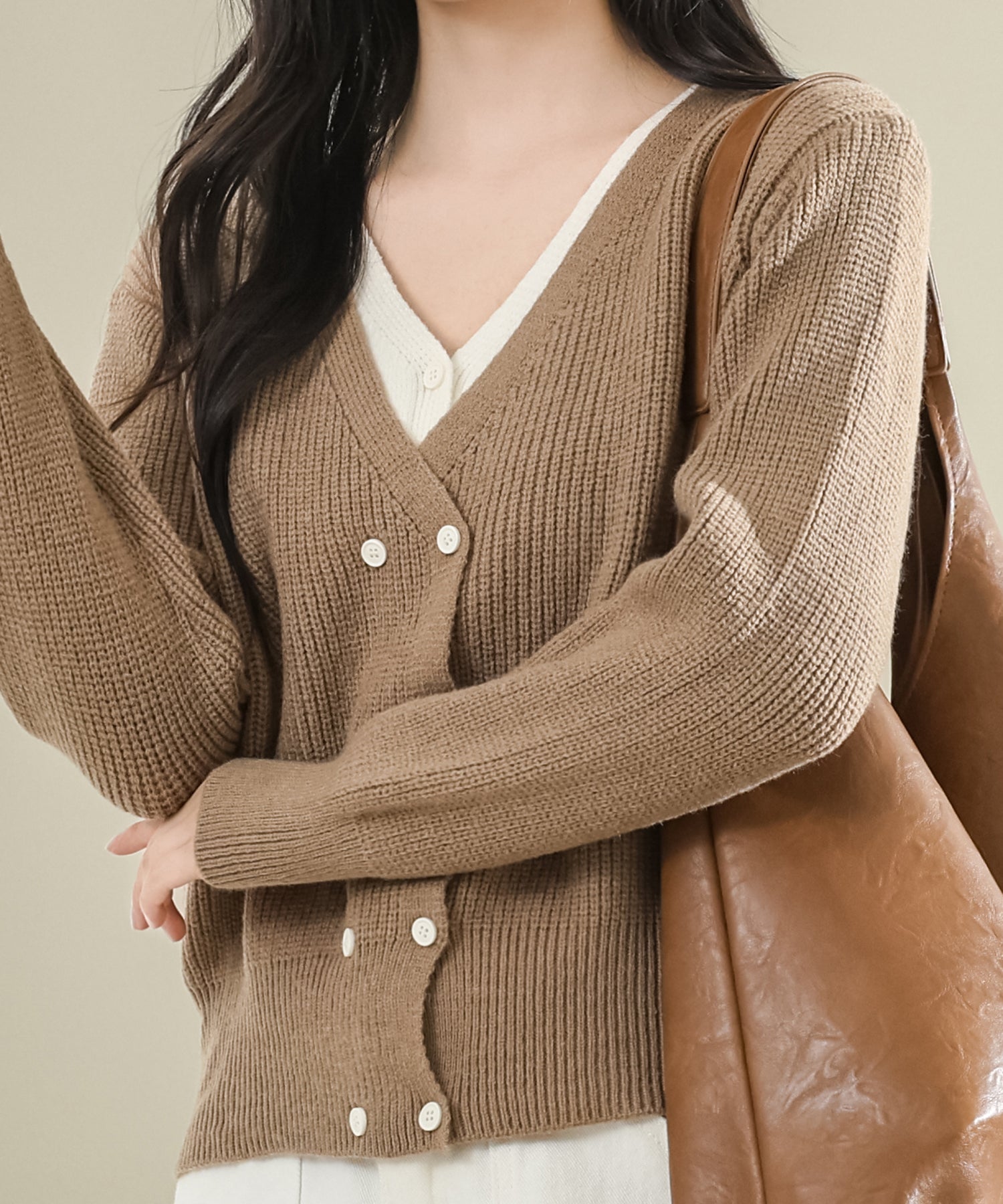 フェイクレイヤード ダブルボタン Vネック ニット カーディガン