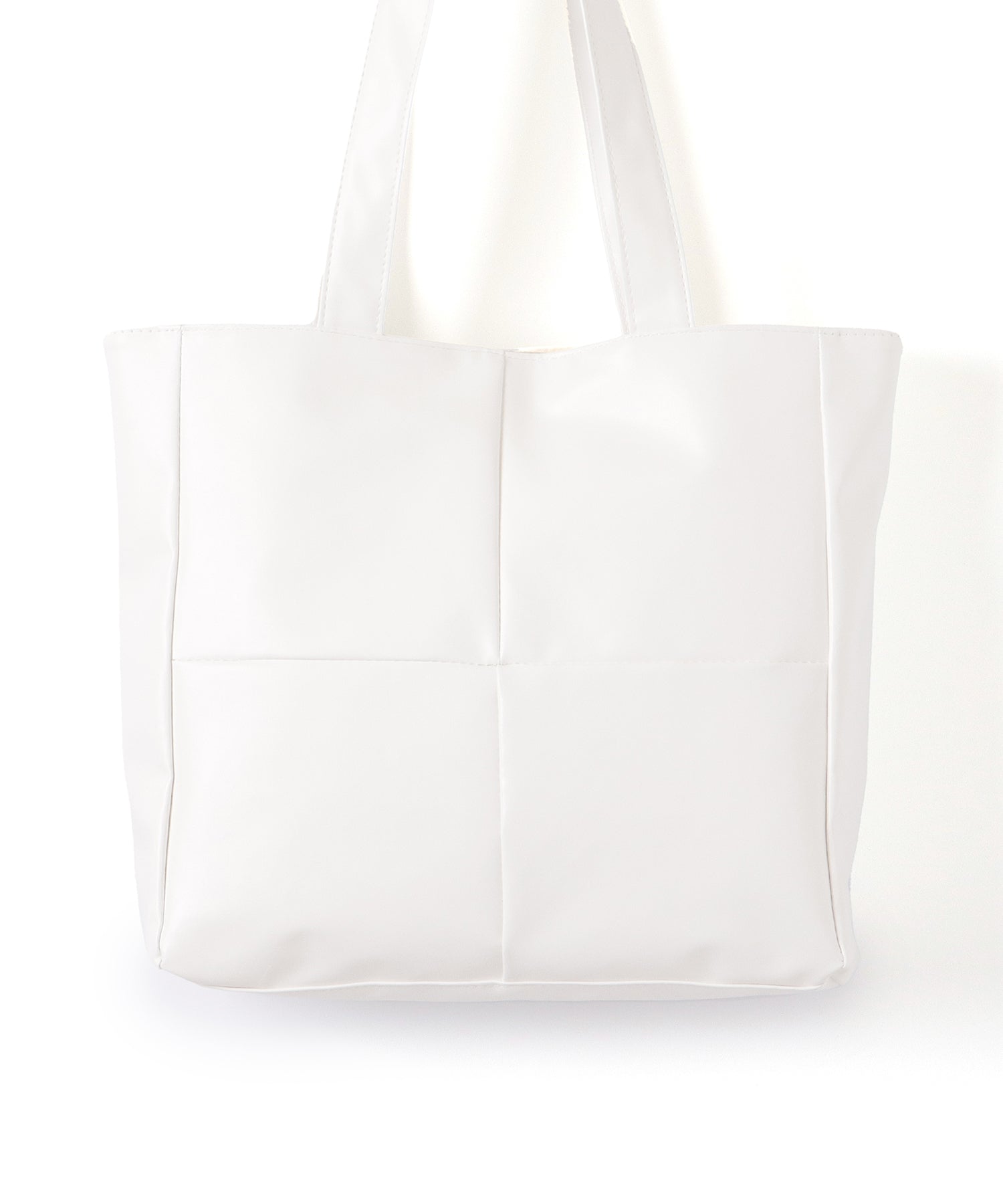 上品なレザー調の素材感をいかし、パッチワーク風デザインで表情をつけた洒落感たっぷりのひと品。