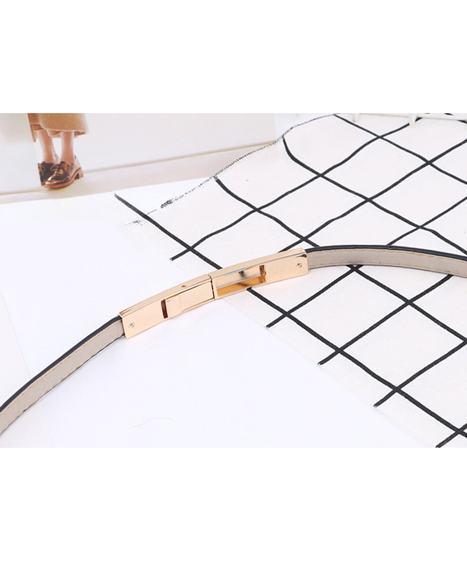 ゴールドのスクエアバックルが映えるシンプル且つ上品なスリムベルト。