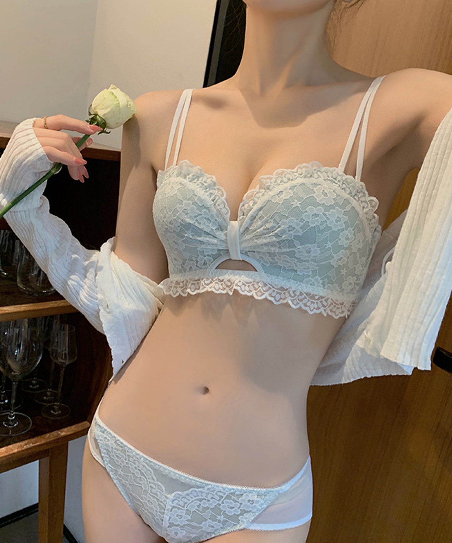カップ生地と異なるカラーのレースを重ねた、おしゃれなブラショーセット