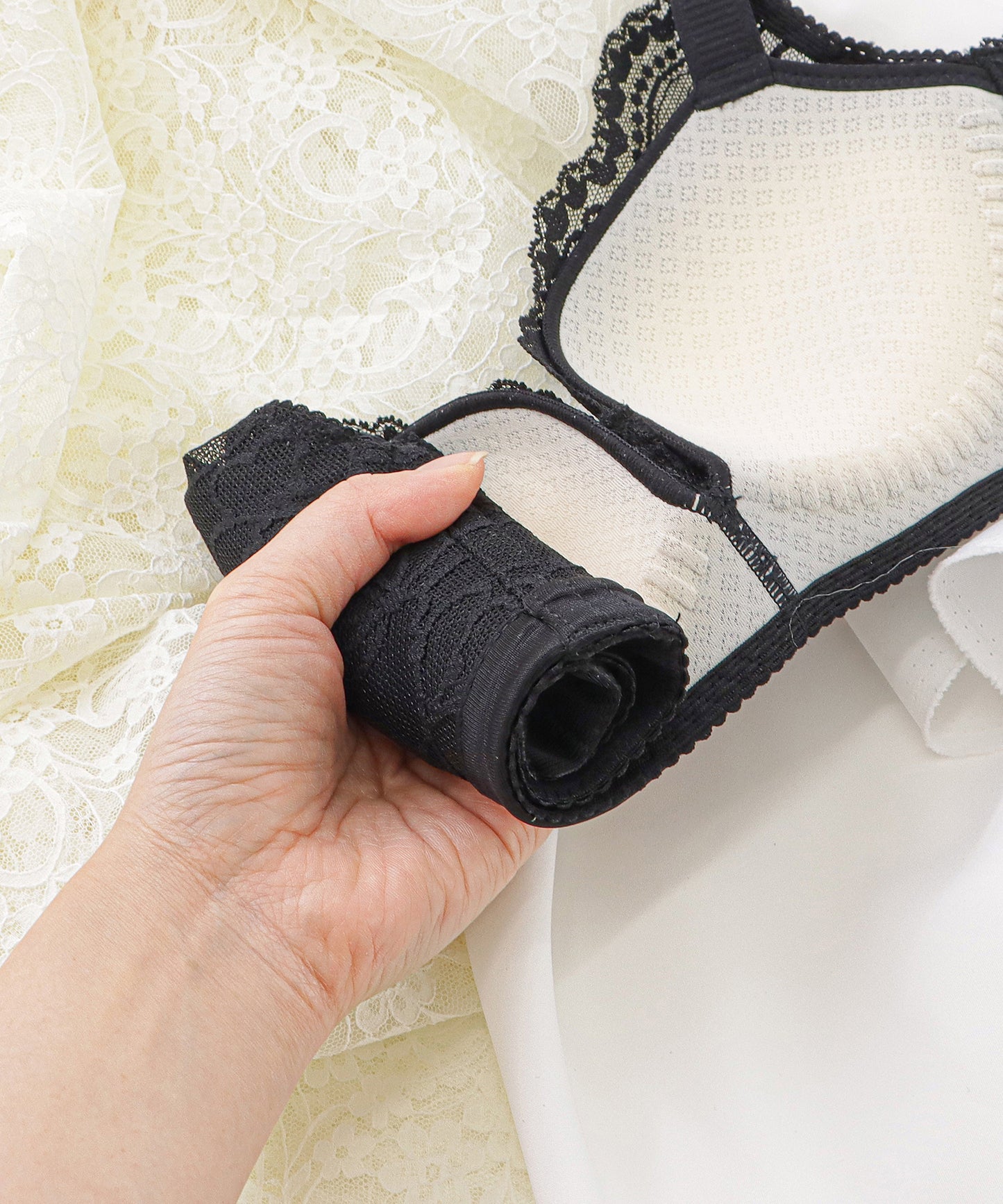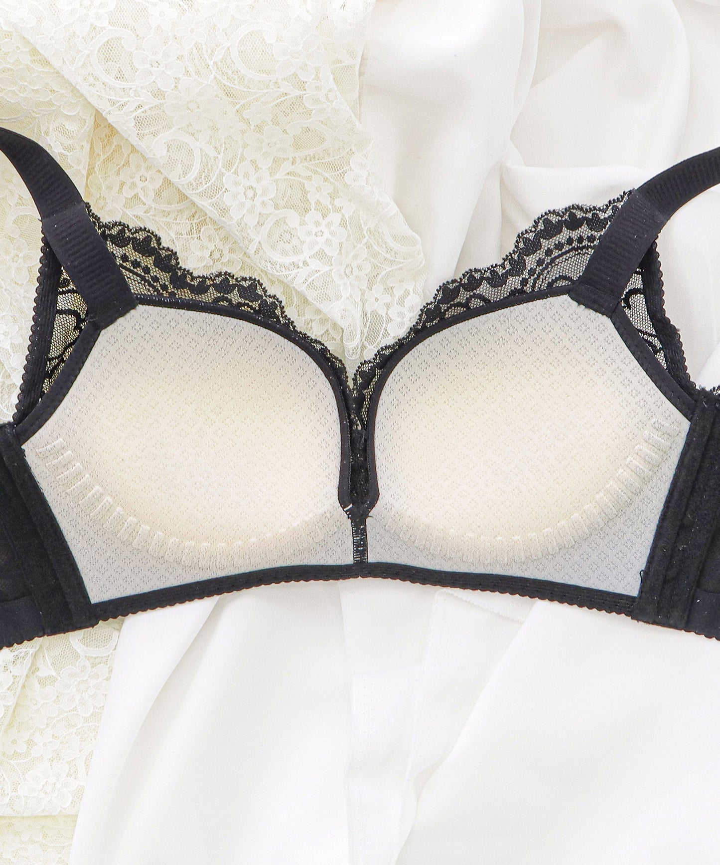カップ上部にもレース生地を被せることで、透けて見える素肌が美しい1着。