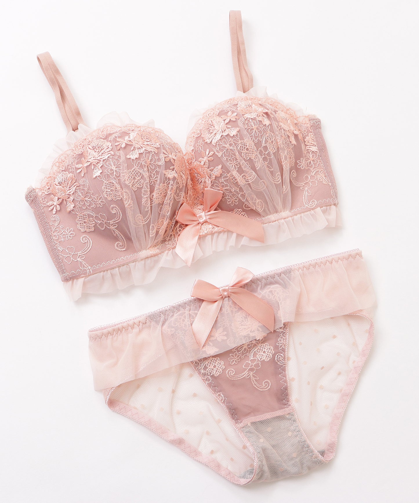サテンリボン花柄フリルノンワイヤーブラ&ショーツセット