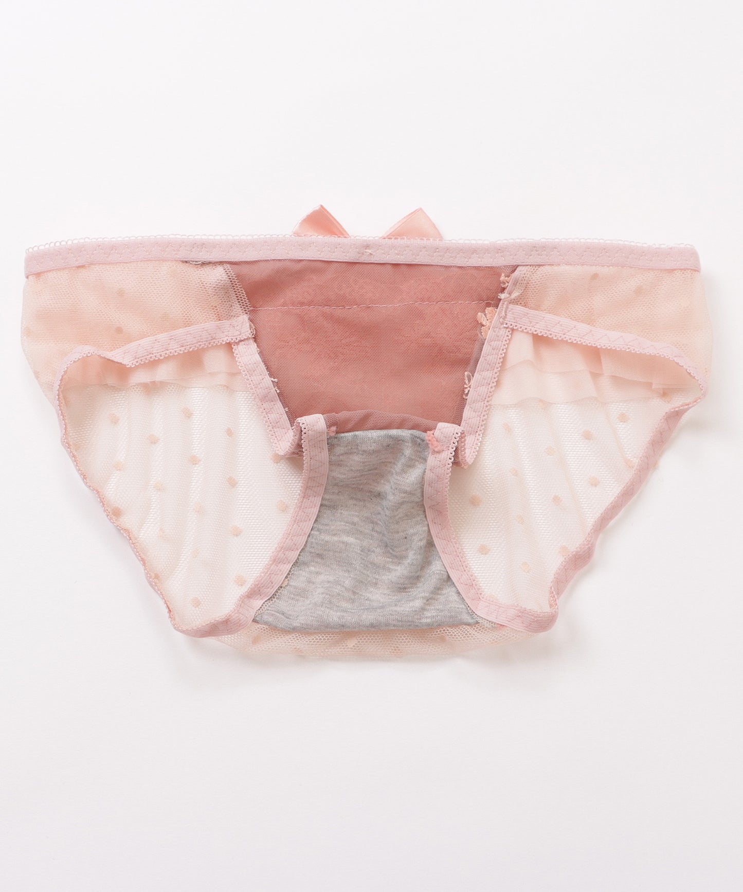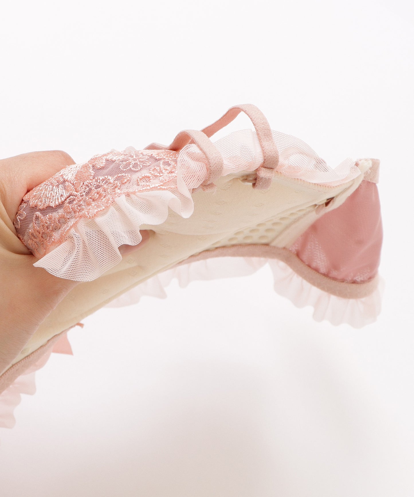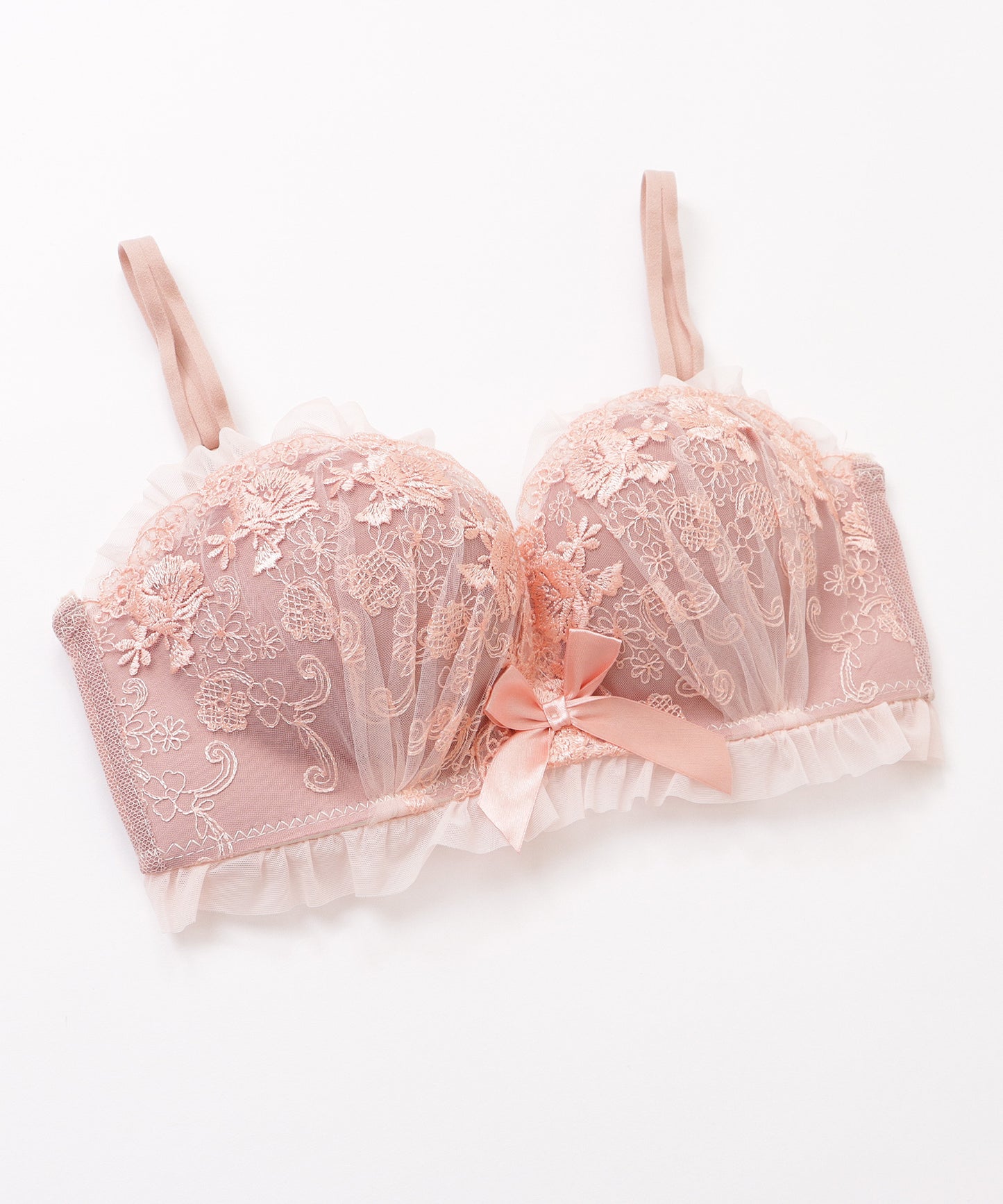 大小の花柄刺繍をあしらったエレガントなカップに、サテン調リボンをアクセントにプラスした、リッチなデザインに仕上げました。
