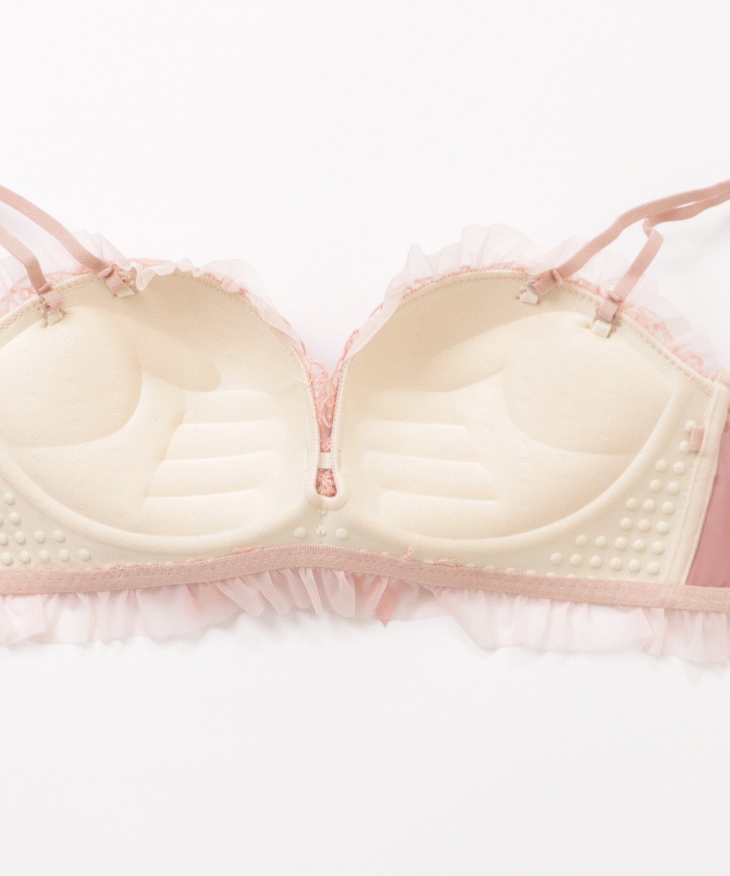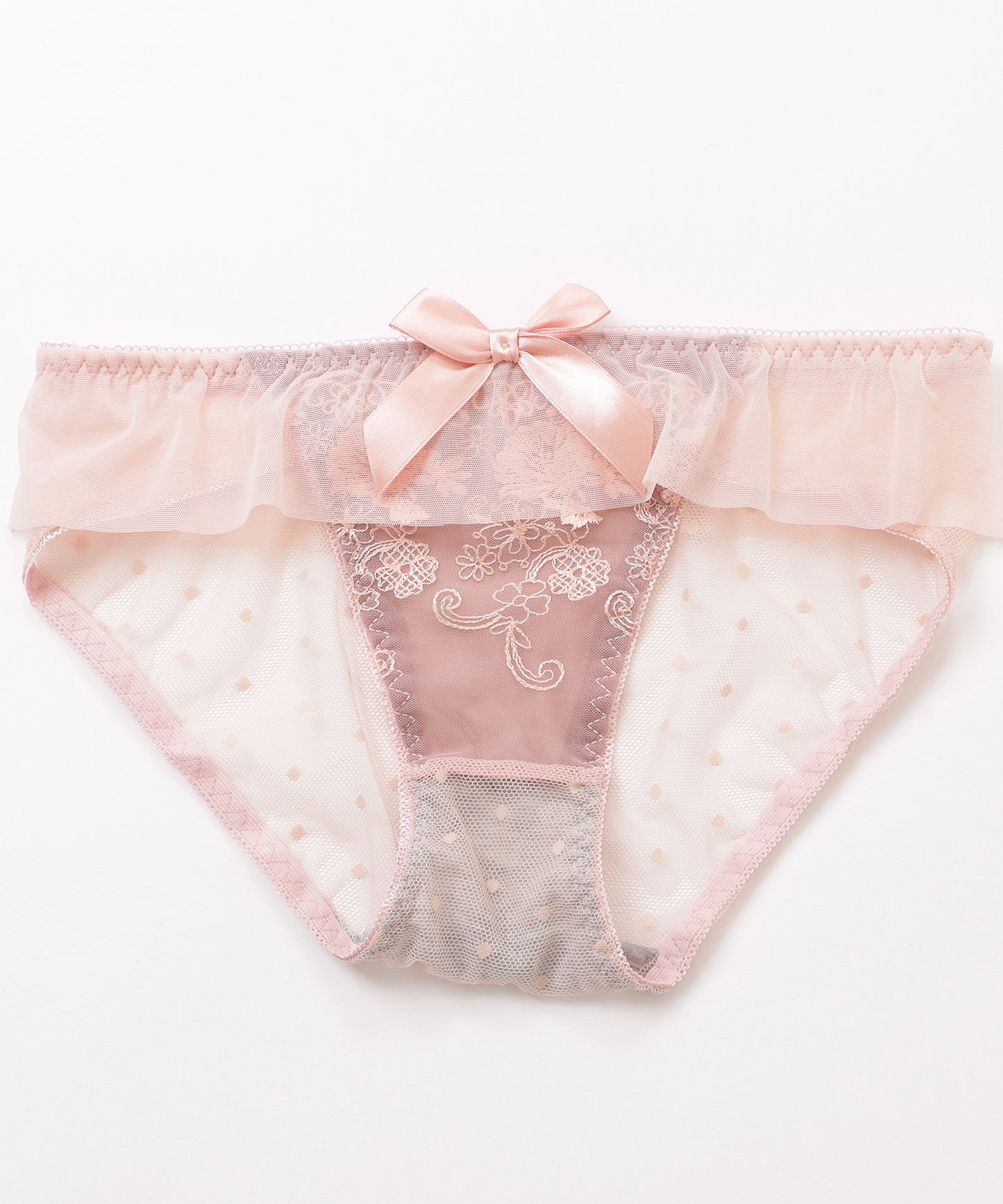 カップ上下にあしらった大胆なシフォンフリルがフェミニンなブラジャー&ショーツセット。