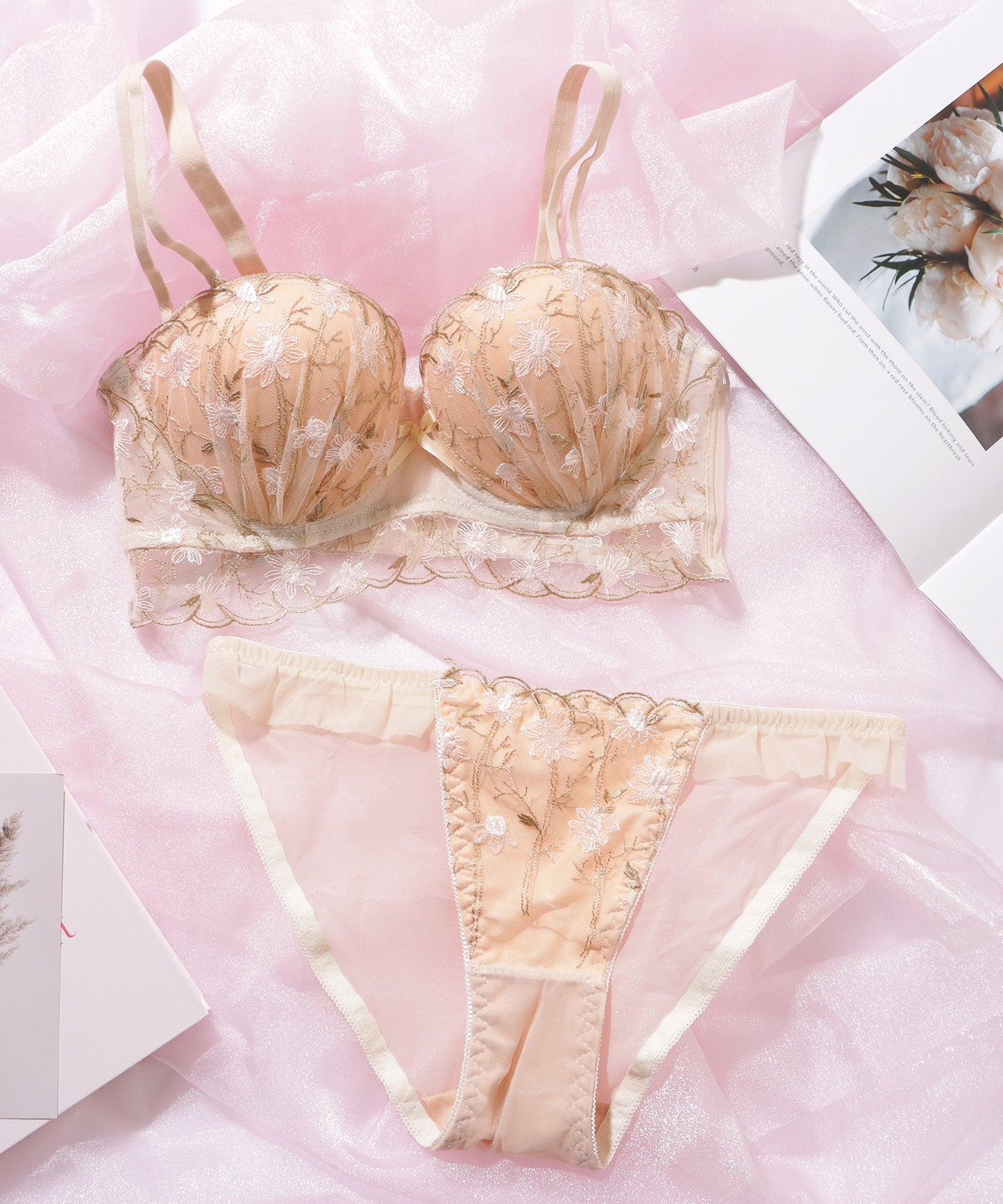 まるで花畑をイメージしたかのような、可憐なフラワー柄レースのブラジャー&ショーツセット。