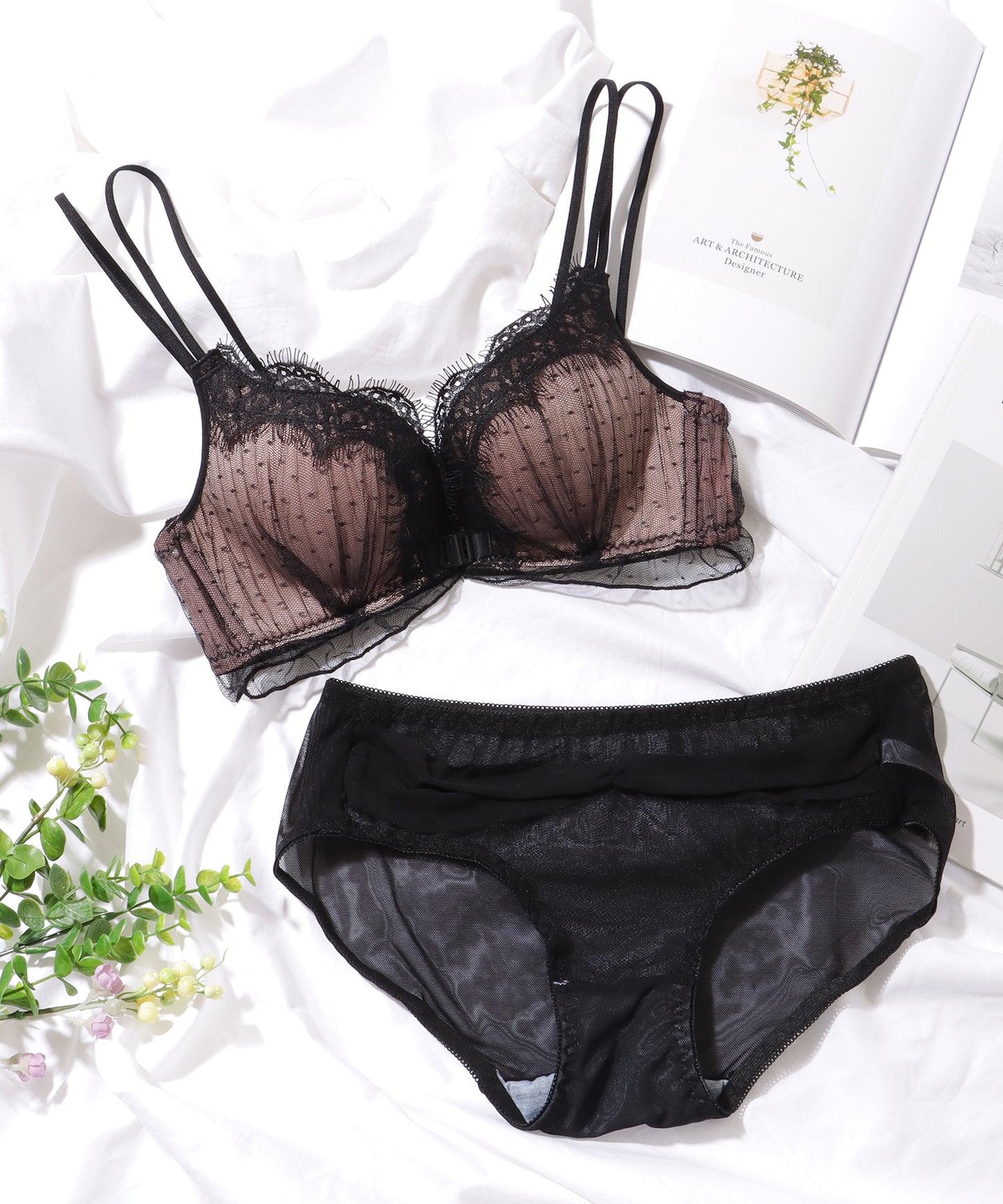 ドット チュール フロントホック 3/4 ノンワイヤー ブラ&ショーツ
