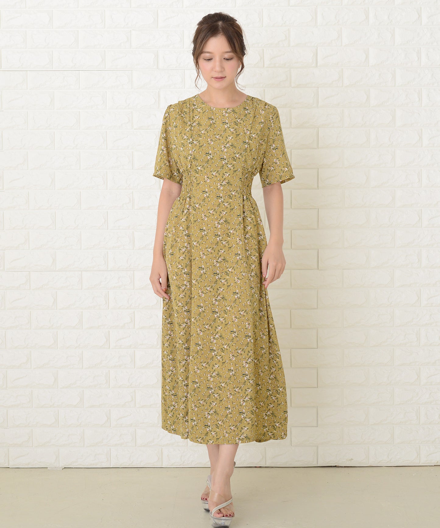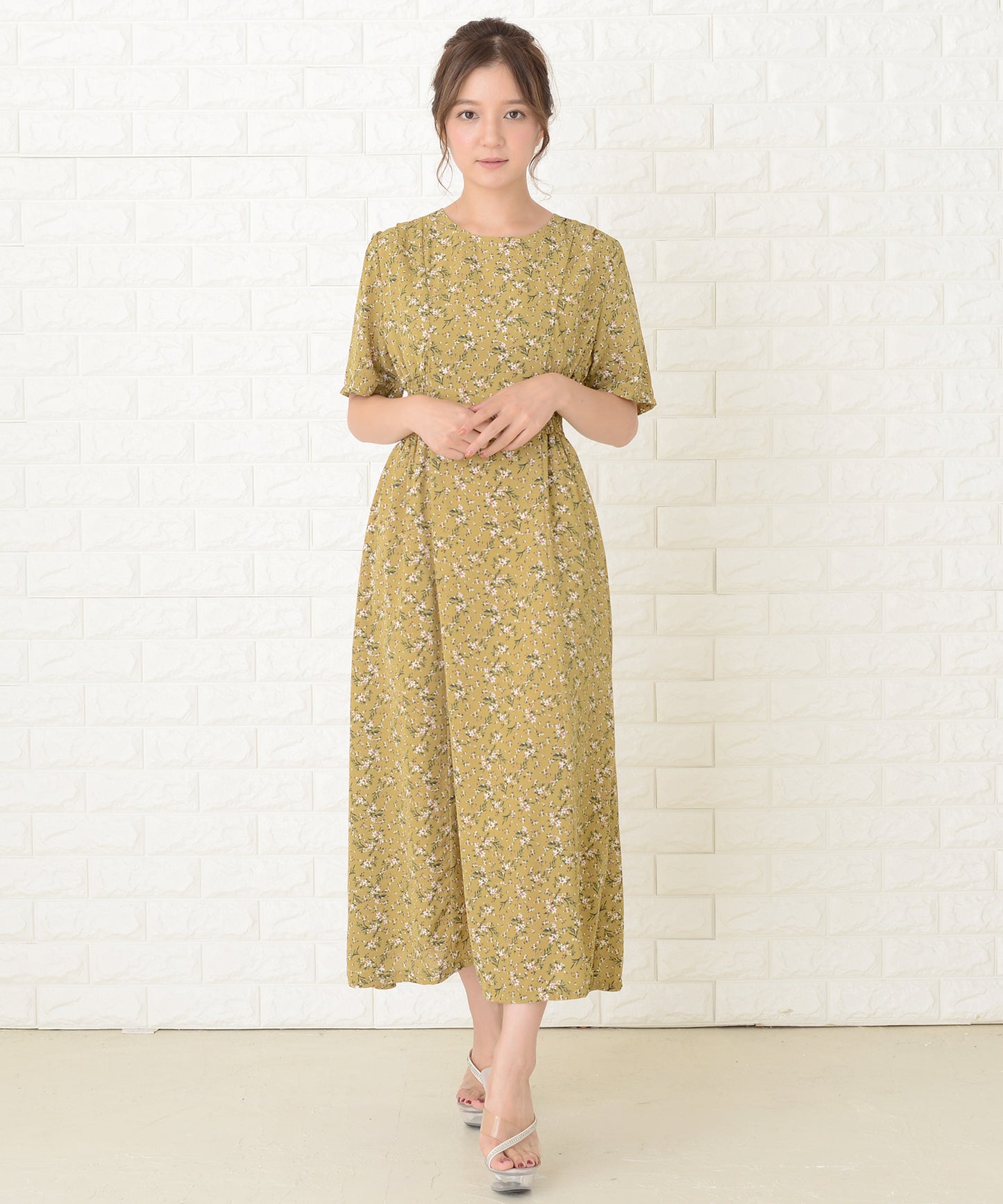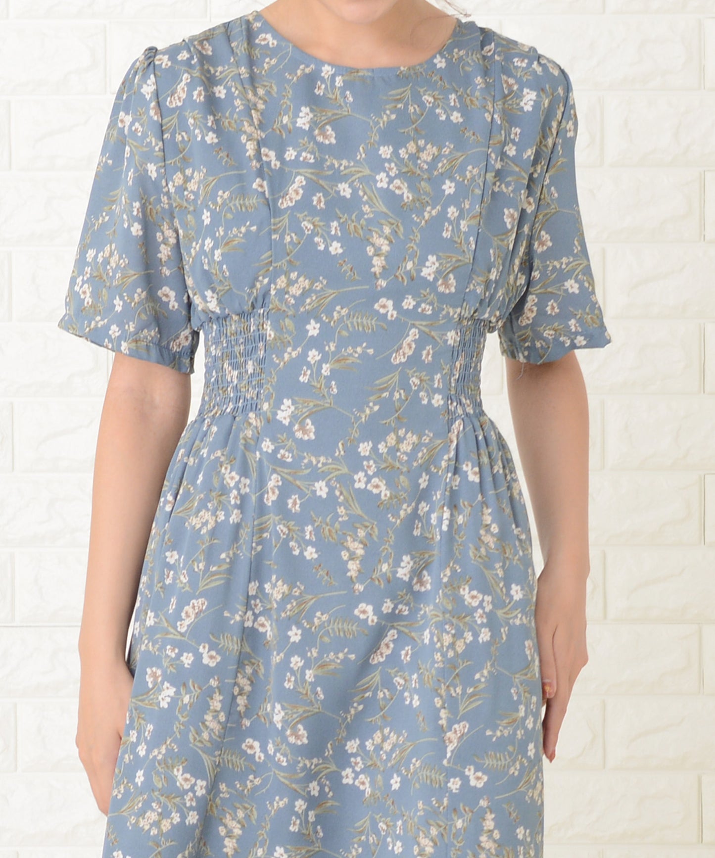 配色 クルーネック キャンディースリーブ ギャザー ドレス