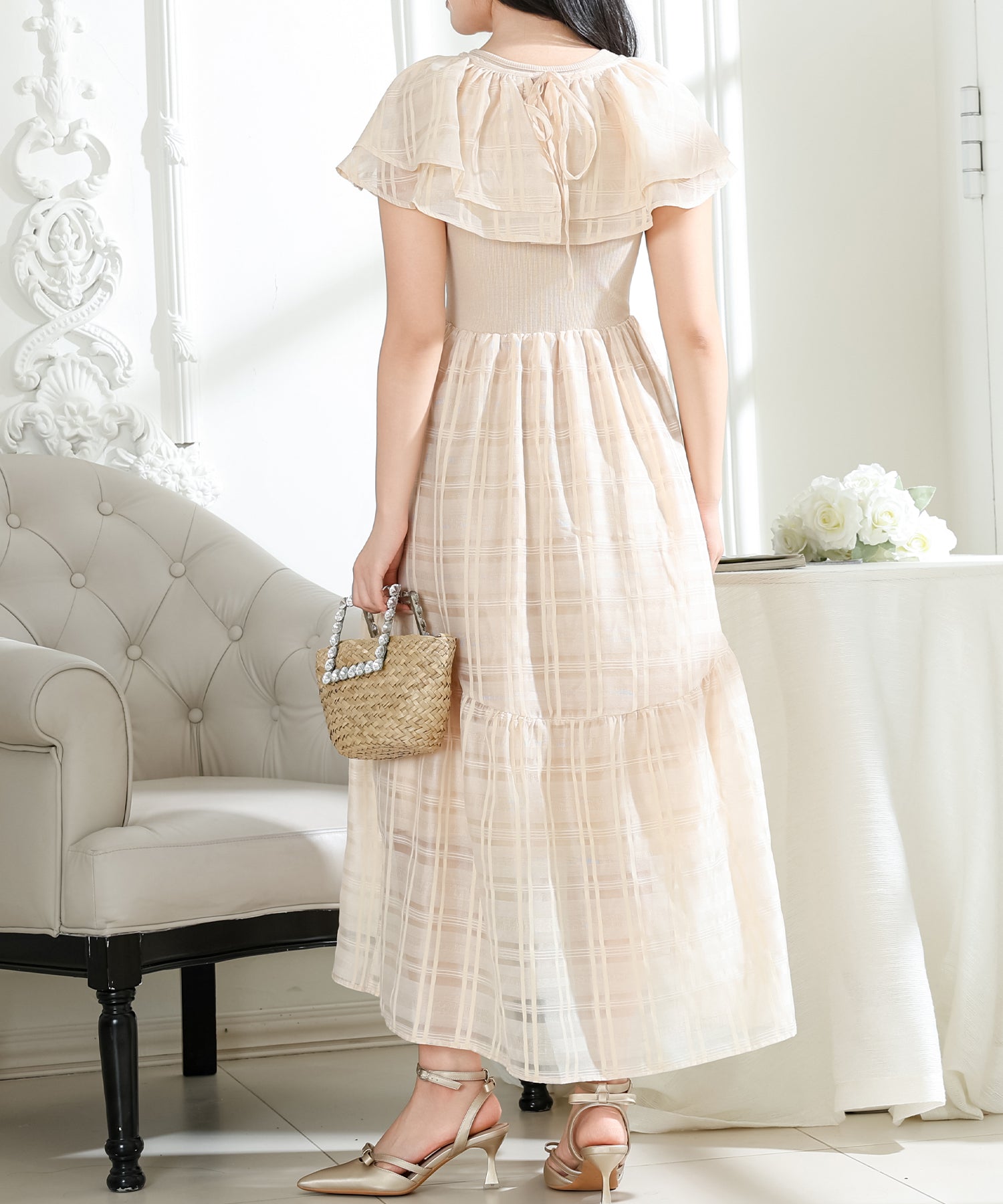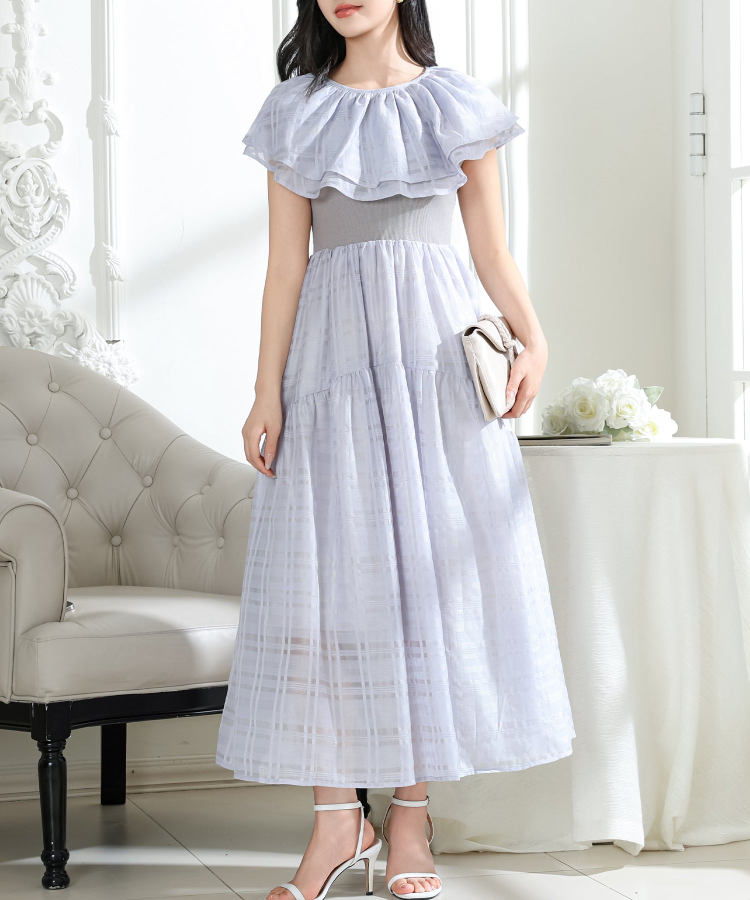 オーガンジー フリル ペプラム レイヤード ロング ドレス