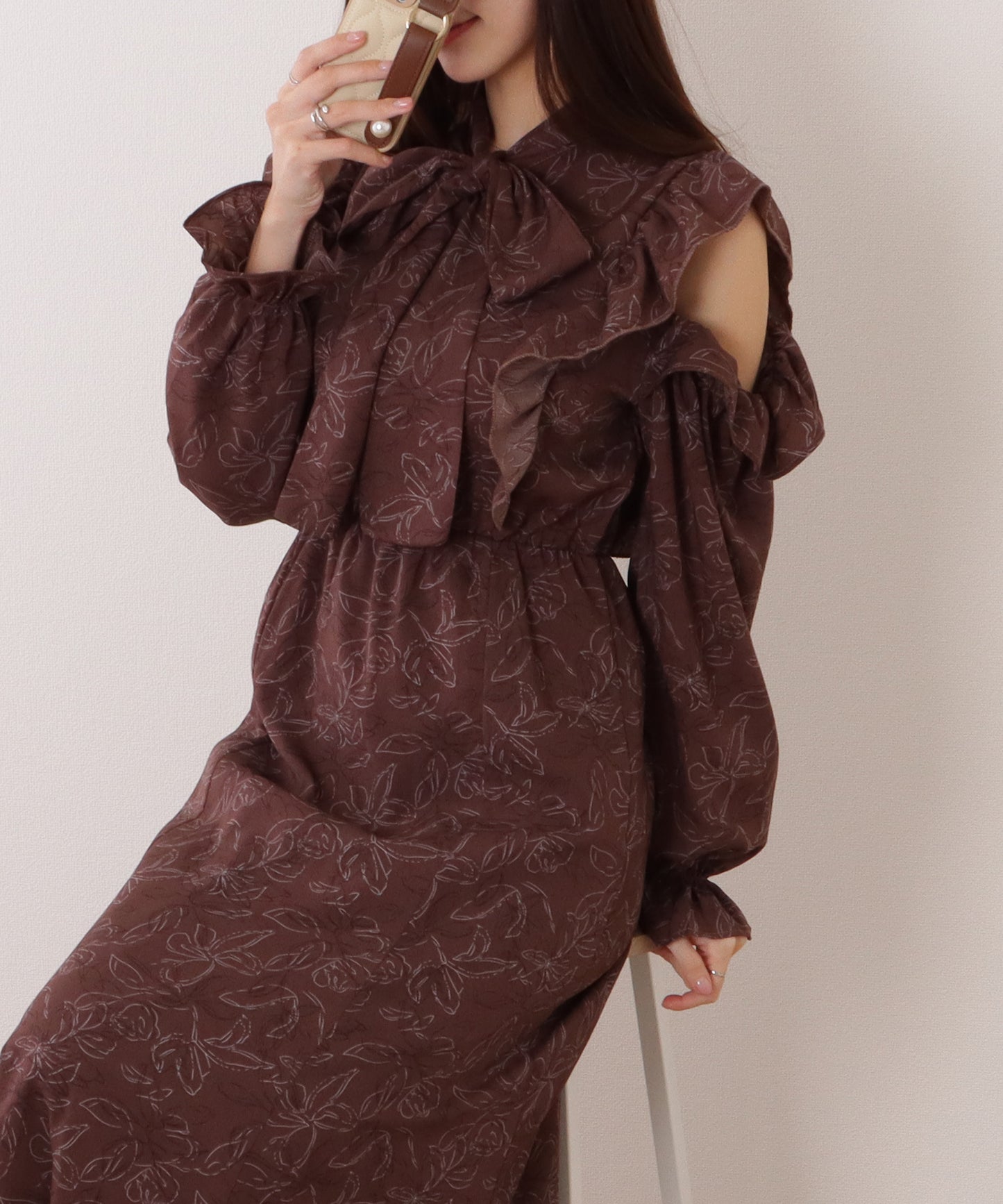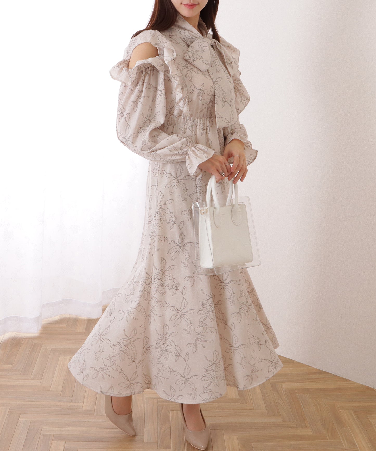 ボウタイ付き 花柄 カットアウト フリル ワンピース