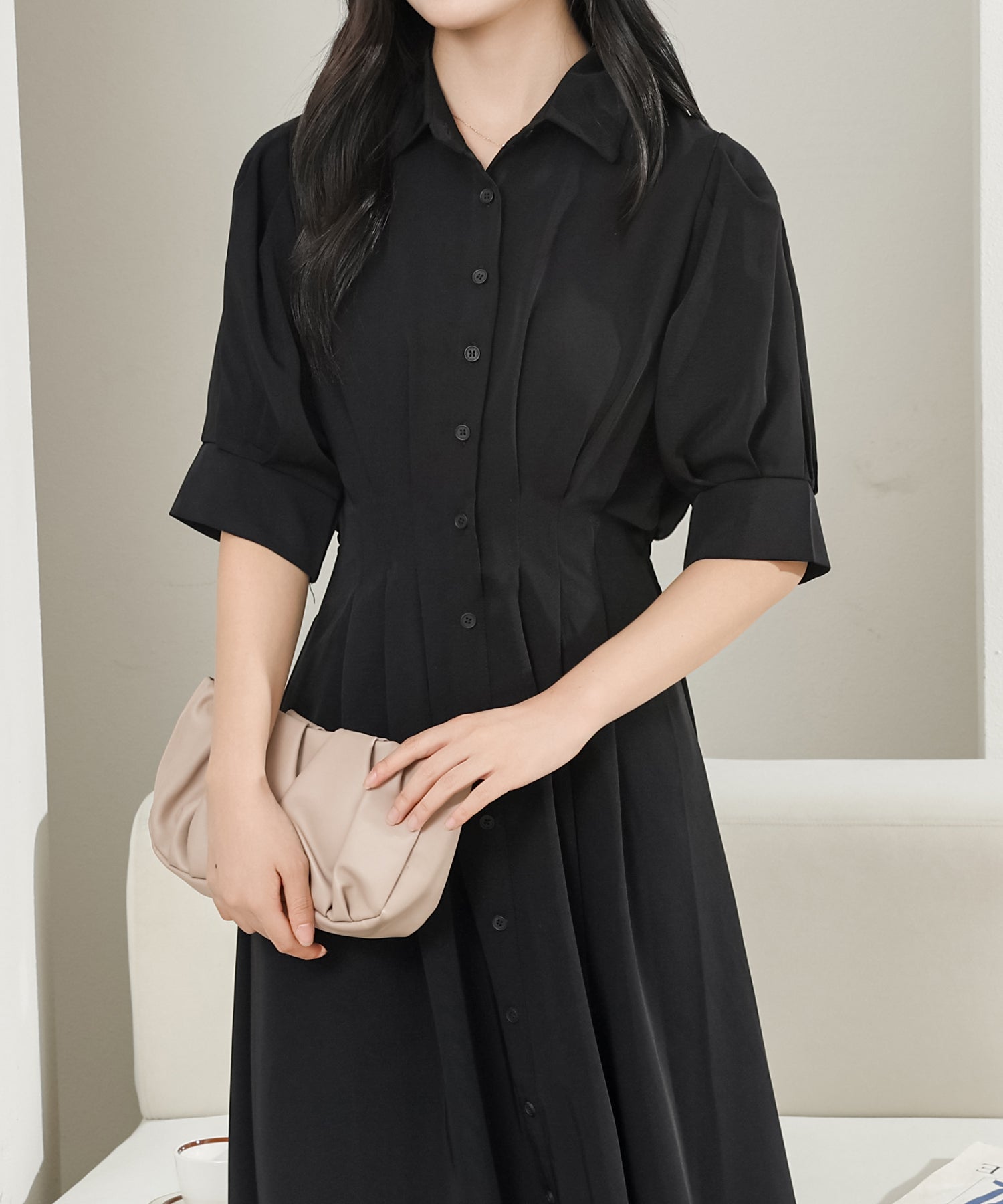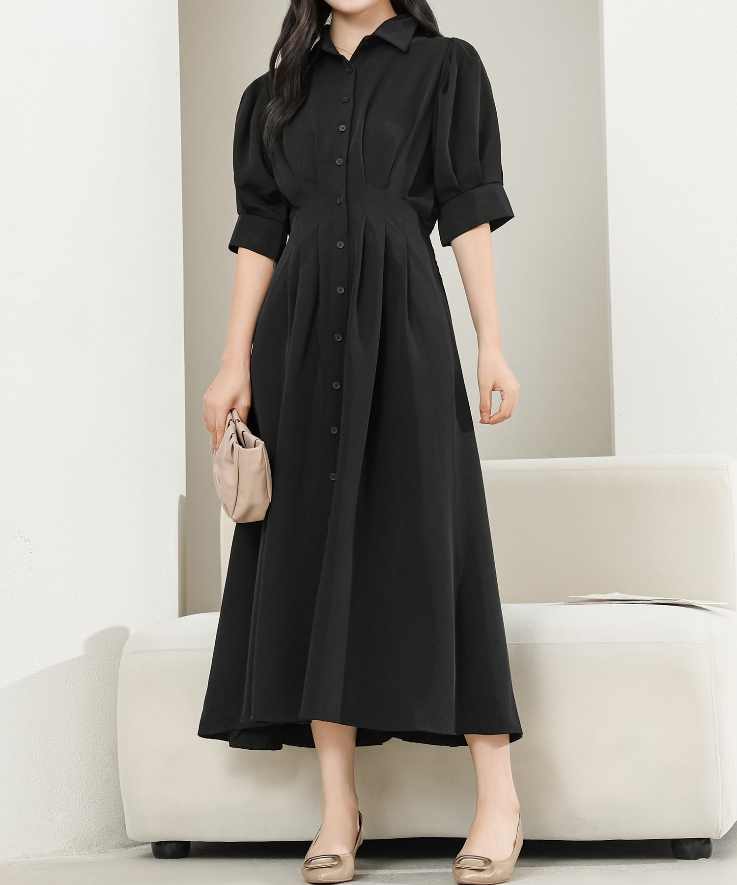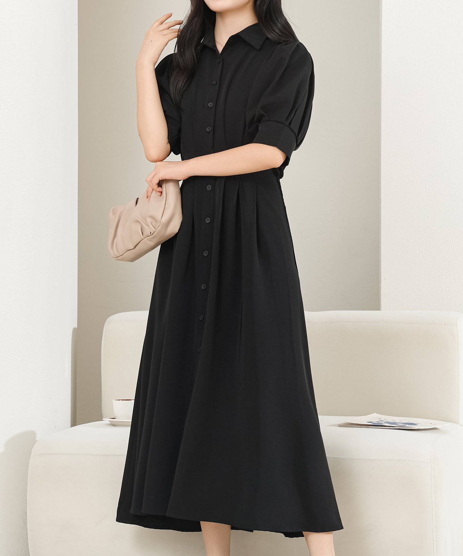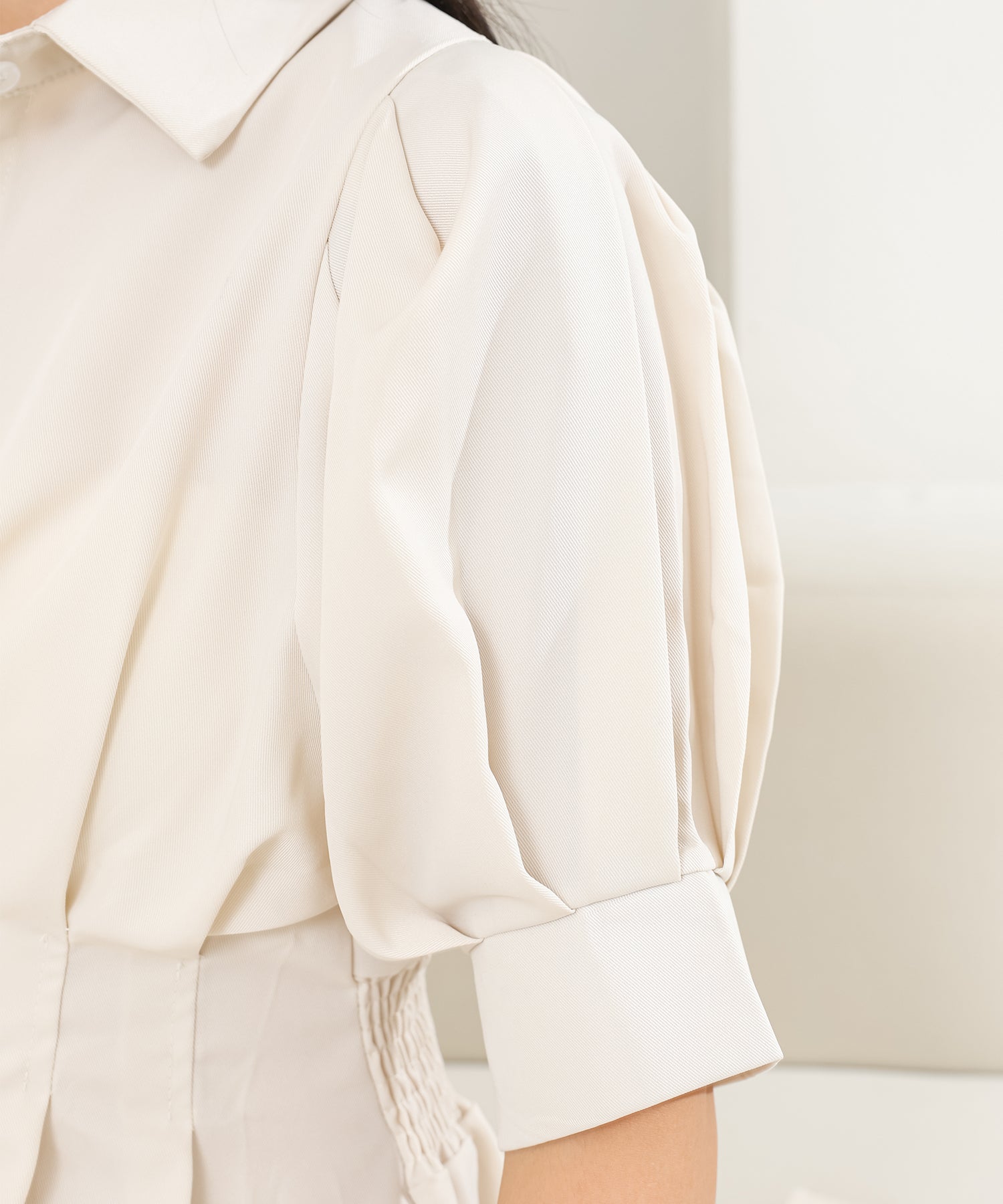 身頃全体にはタックをほどこし、シルエットに立体感をプラス。