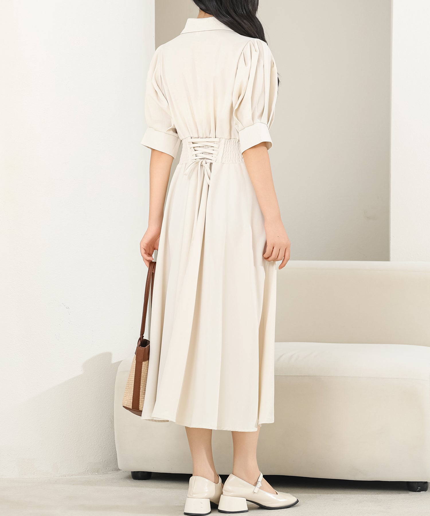 バックレースアップ パフスリーブ ロング シャツ ワンピース