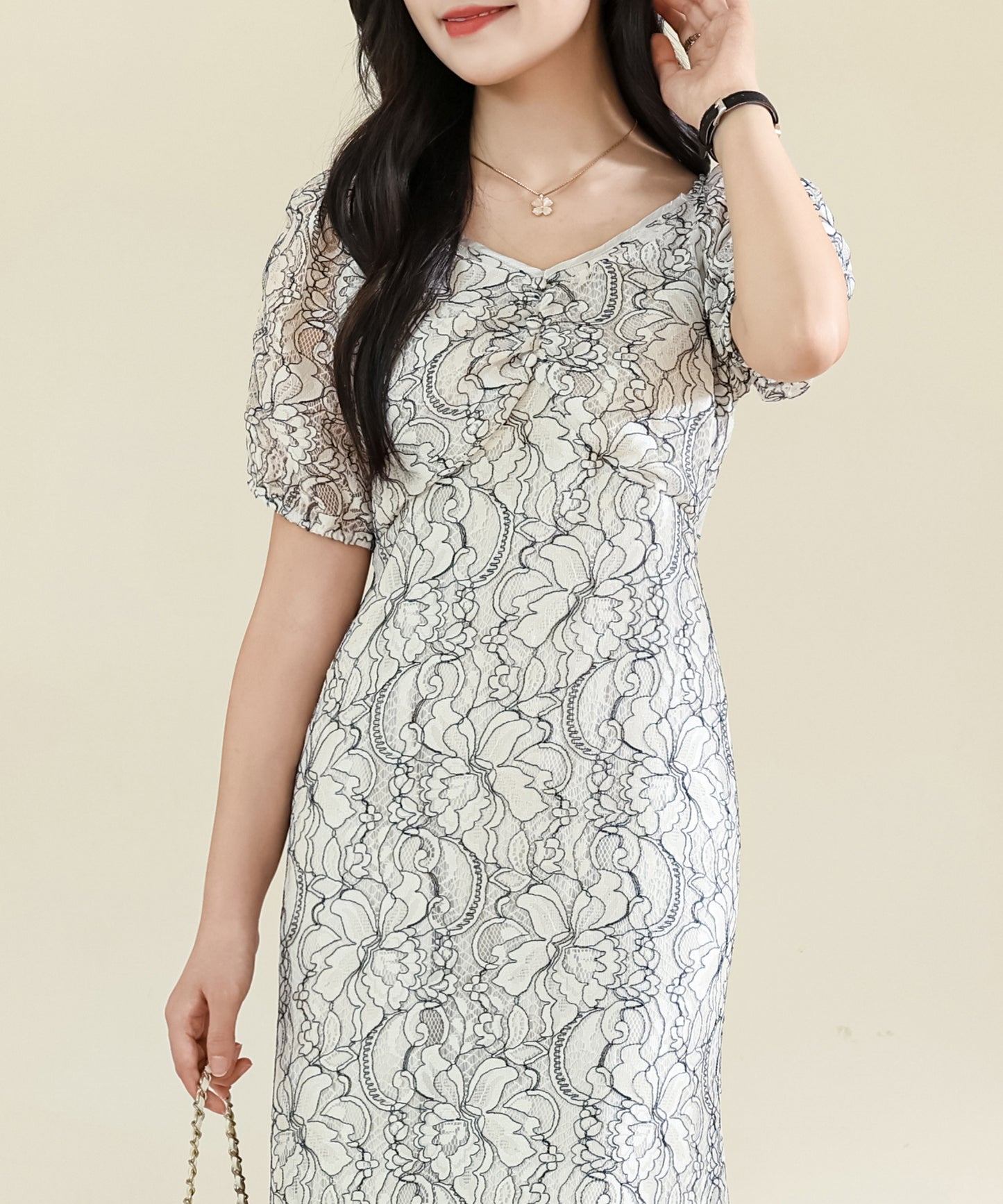 首元には全体の華やかな印象を引き締める、Vラインを採用しました。