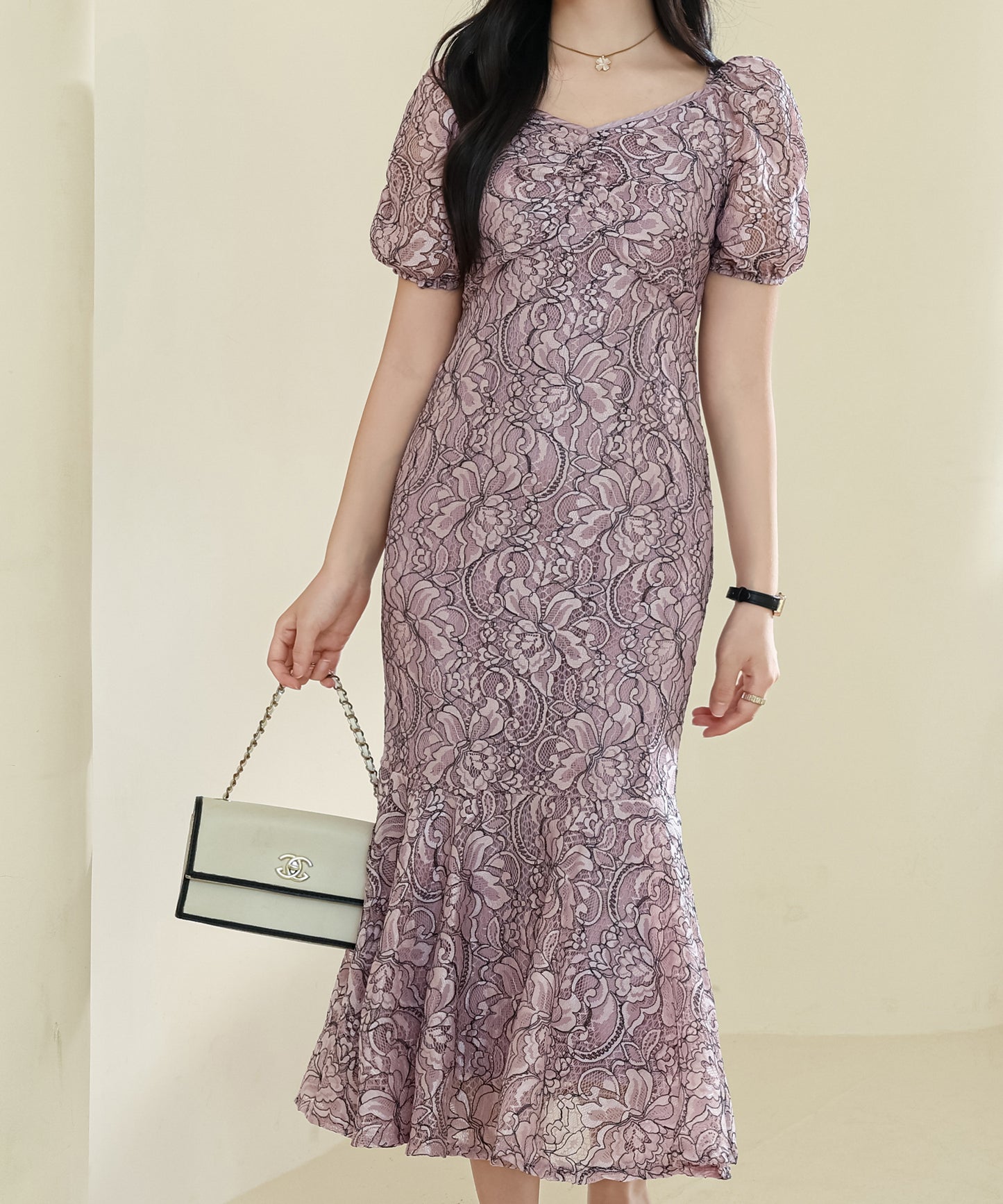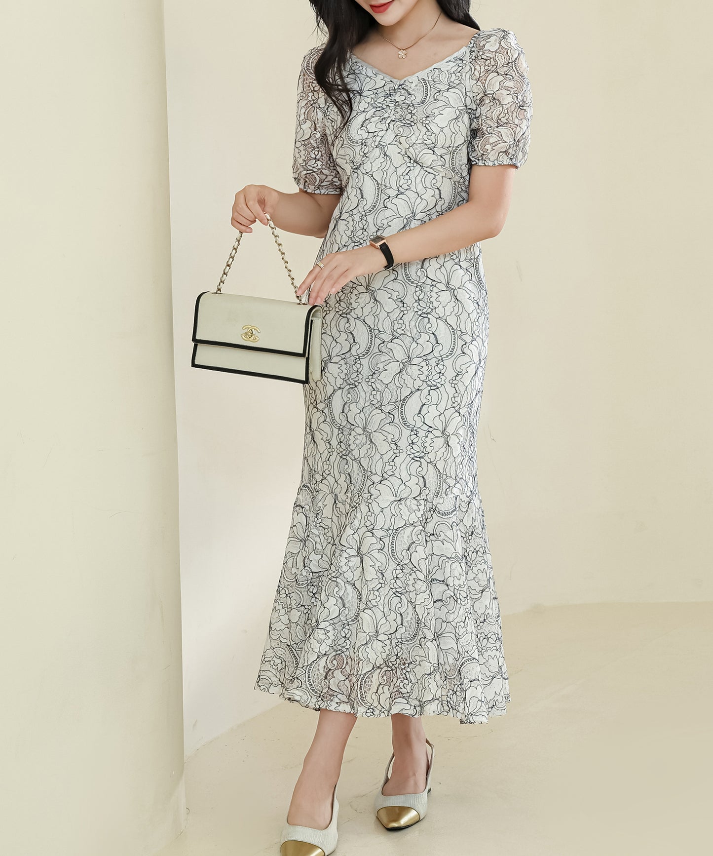 総レース Vネック マーメイド パフスリーブ ワンピース