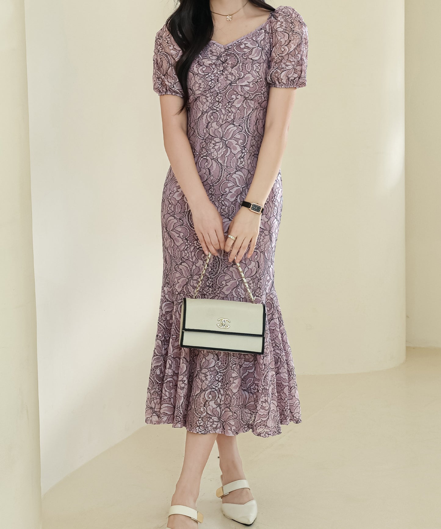 歩くたびに花びらのように揺れ動く、マーメイドラインも印象的。