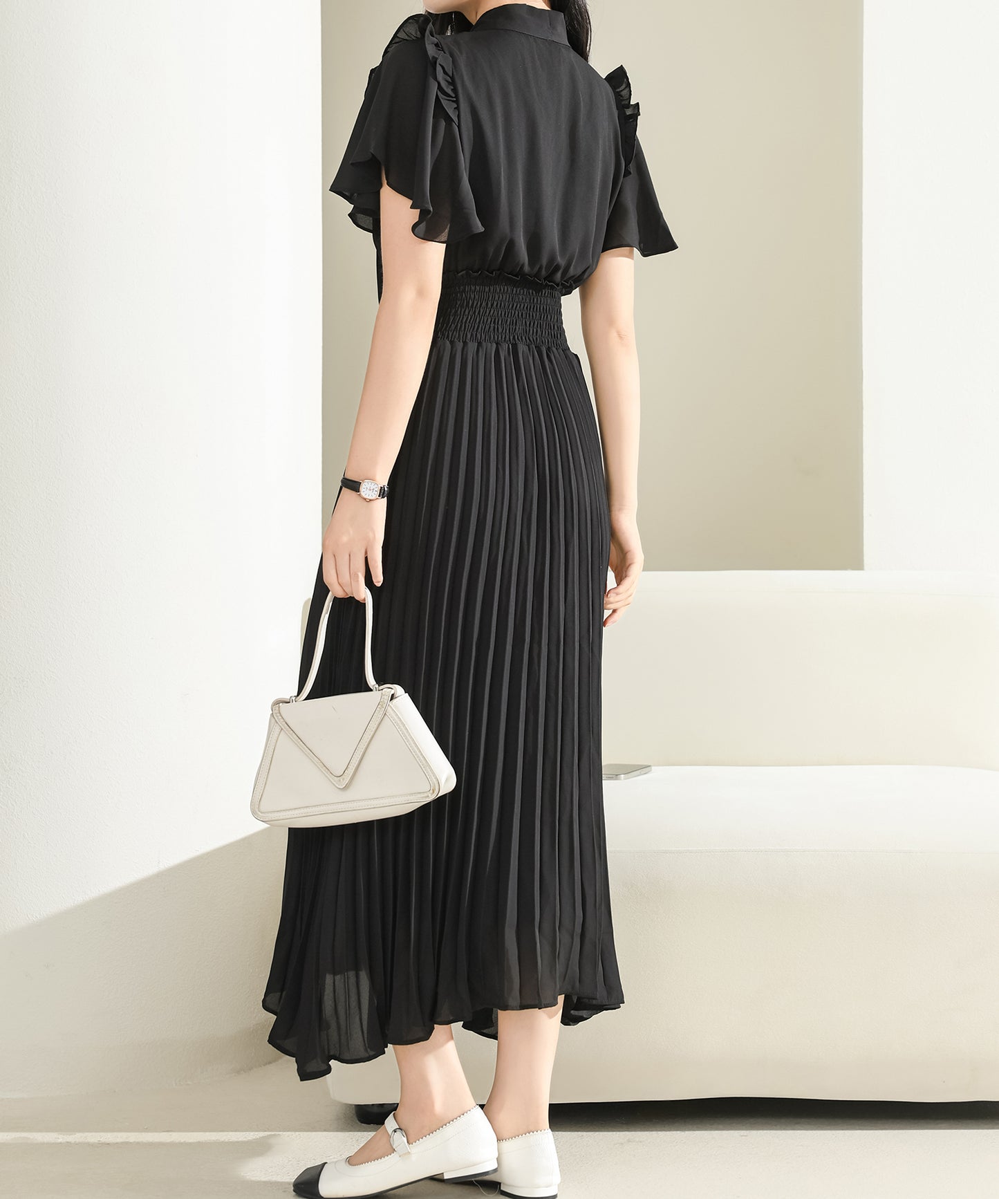 ウエスト部分はシャーリングで仕上げ、トップスとボトムスのコントラストをはっきりと。
