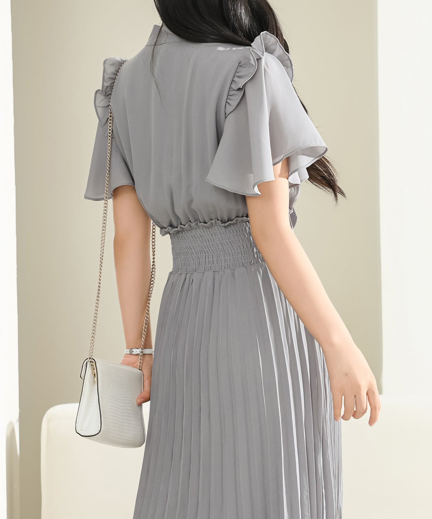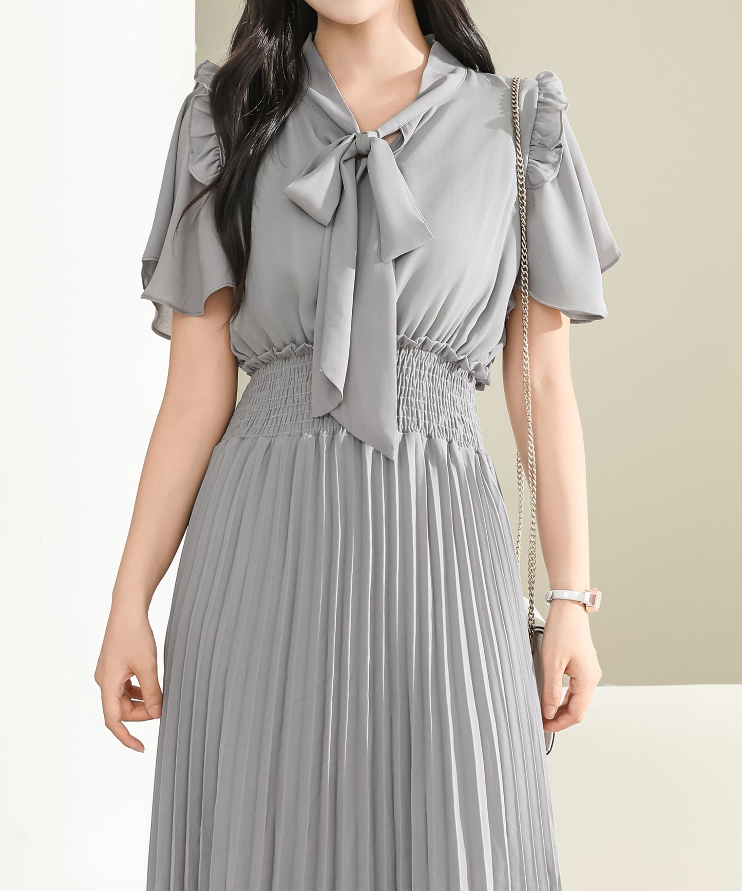 スカート部分は繊細なプリーツ生地にすることで、歩くたびに華やかに揺れる余韻が美しいデザインに。