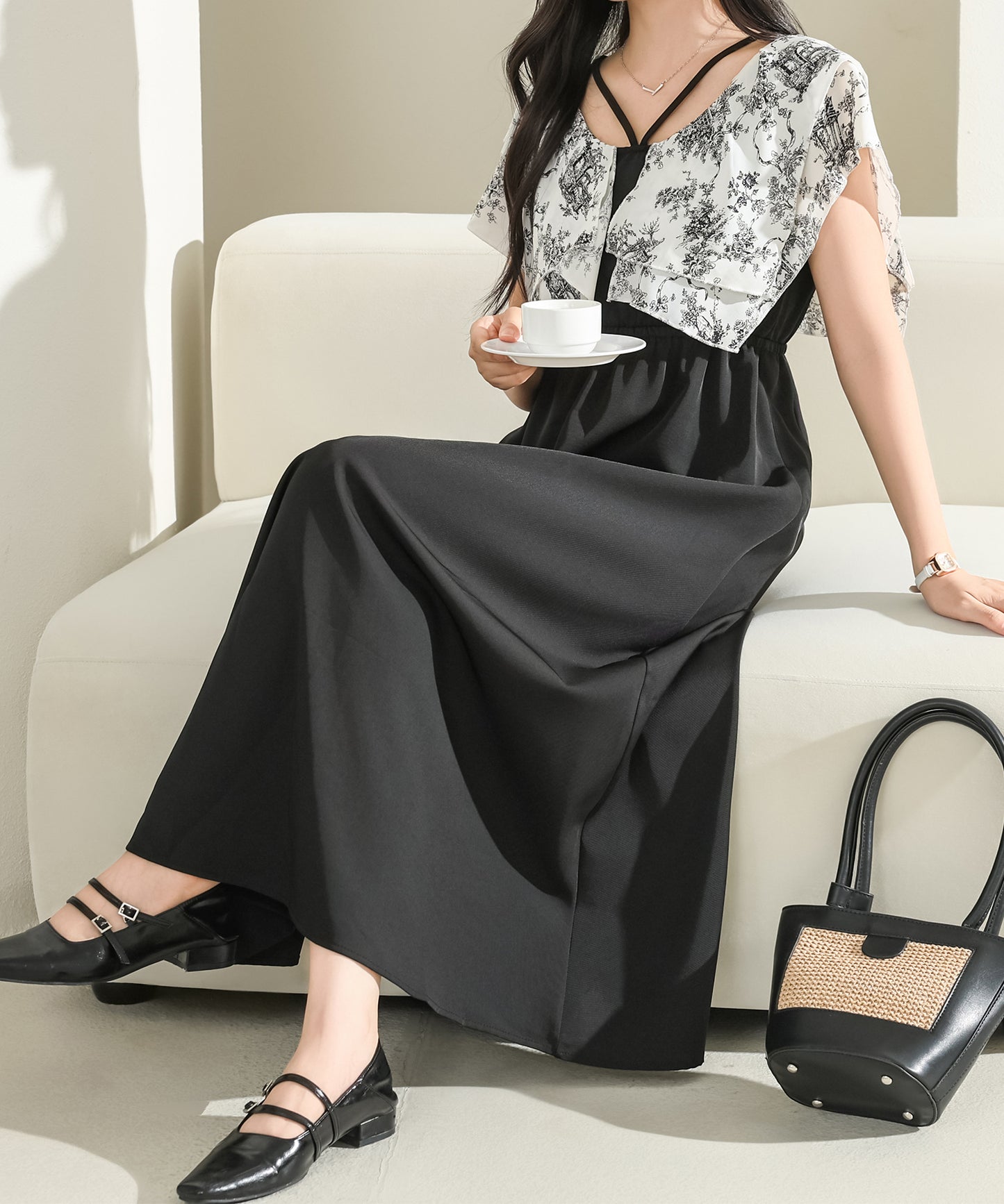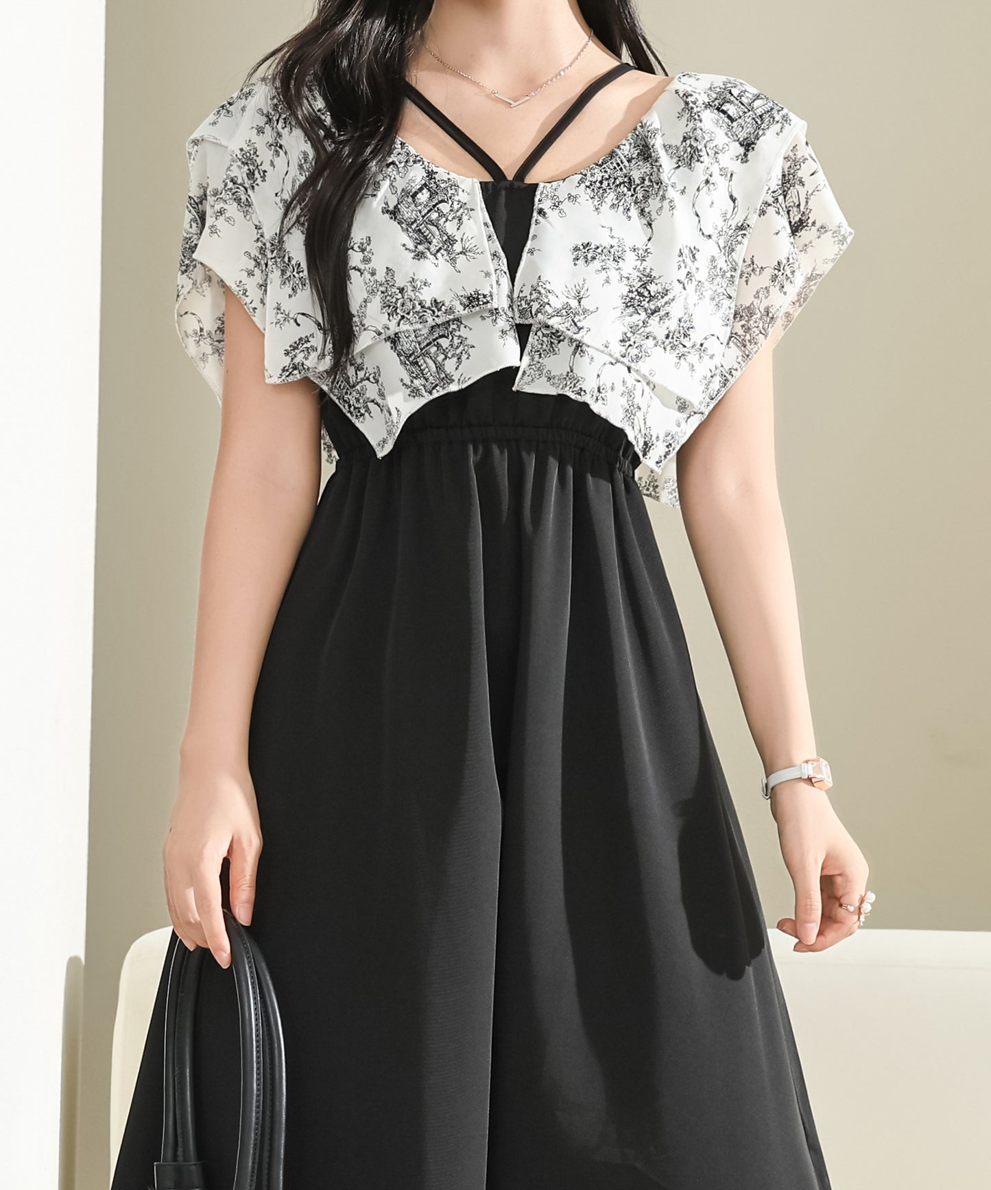 チュールフリル ケープ付き スリット キャミソール ドレス