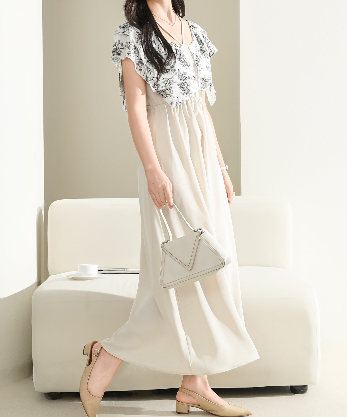襟ぐりから肩部分にかけては、ボタニカル柄の生地をティアードさせることで、顔まわりを華やかな印象に。