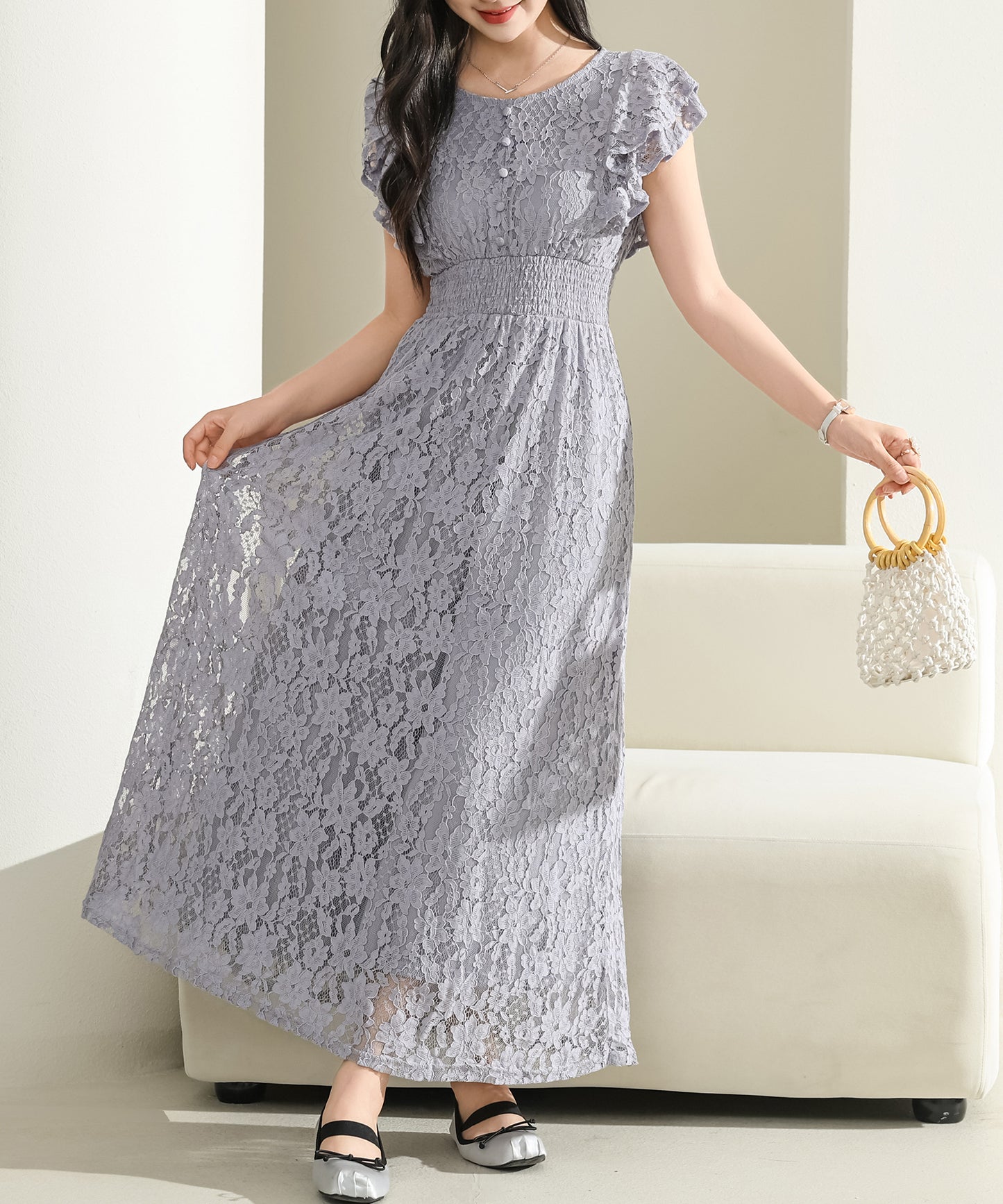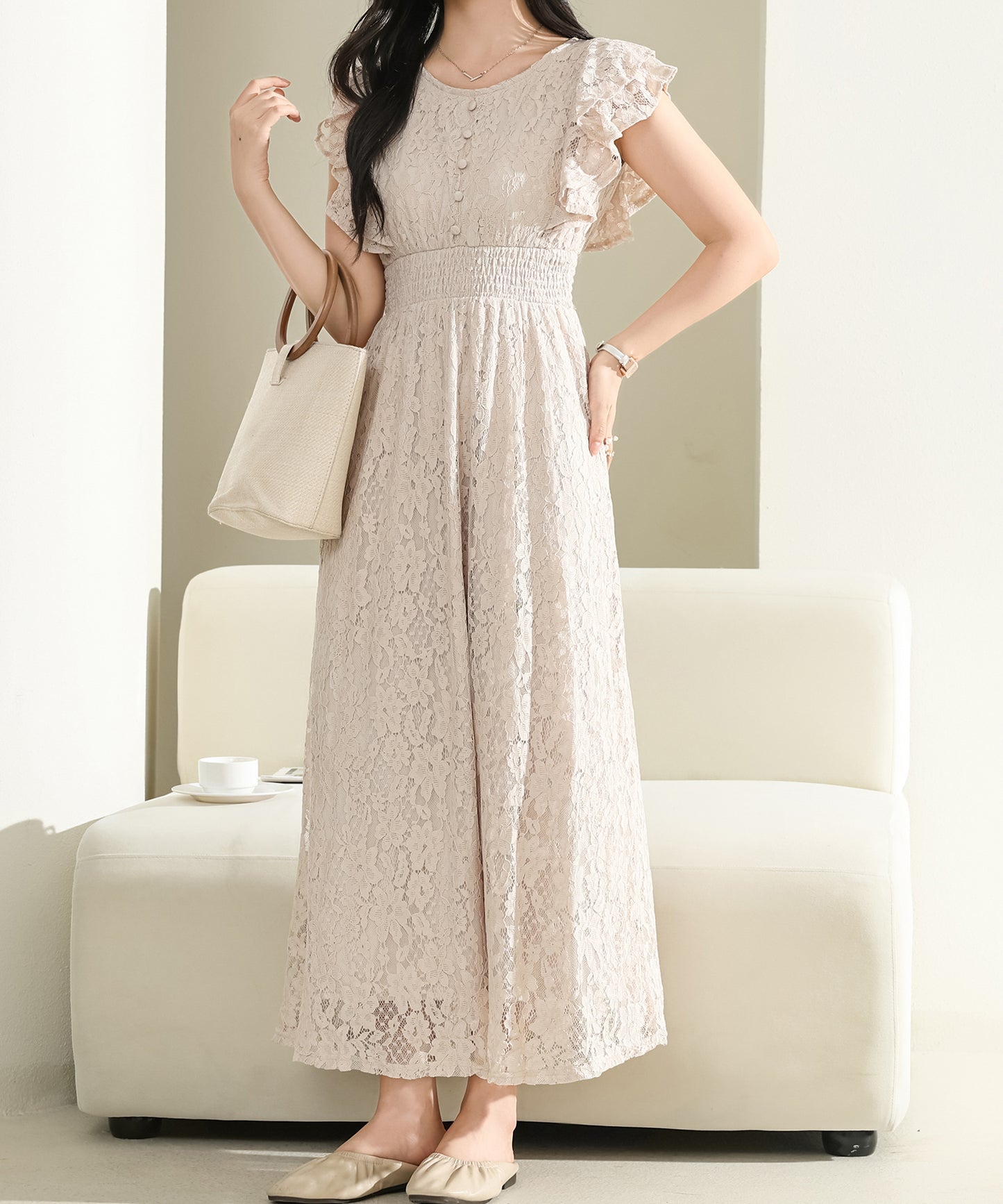 歩くたびに花びらのように揺れる長めの裾で、ドレス感たっぷりの1枚に仕上げました。