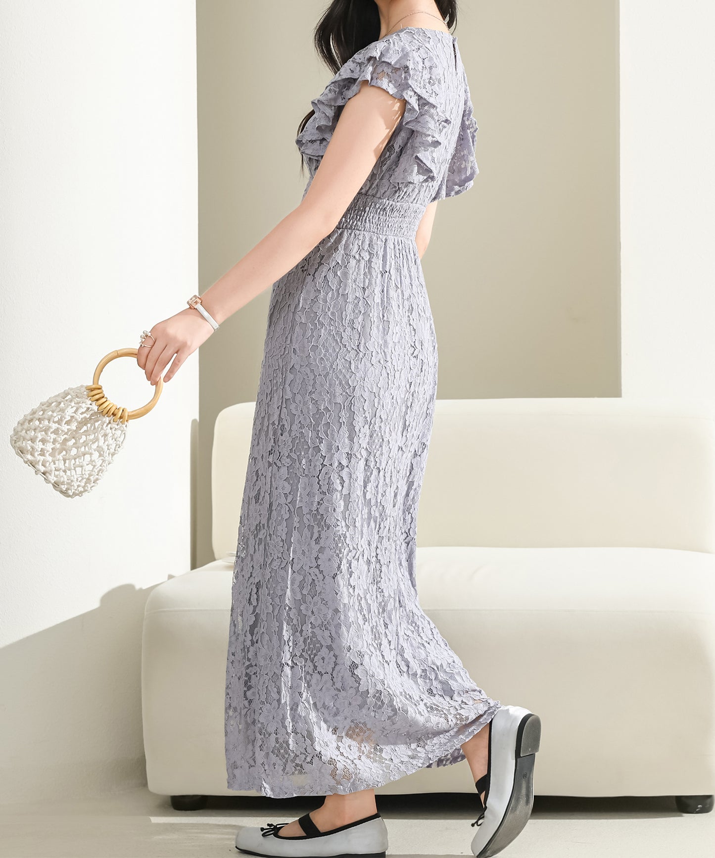 肩から身頃にかけてはラッフルフリルを大胆に重ね、華やかな印象に。