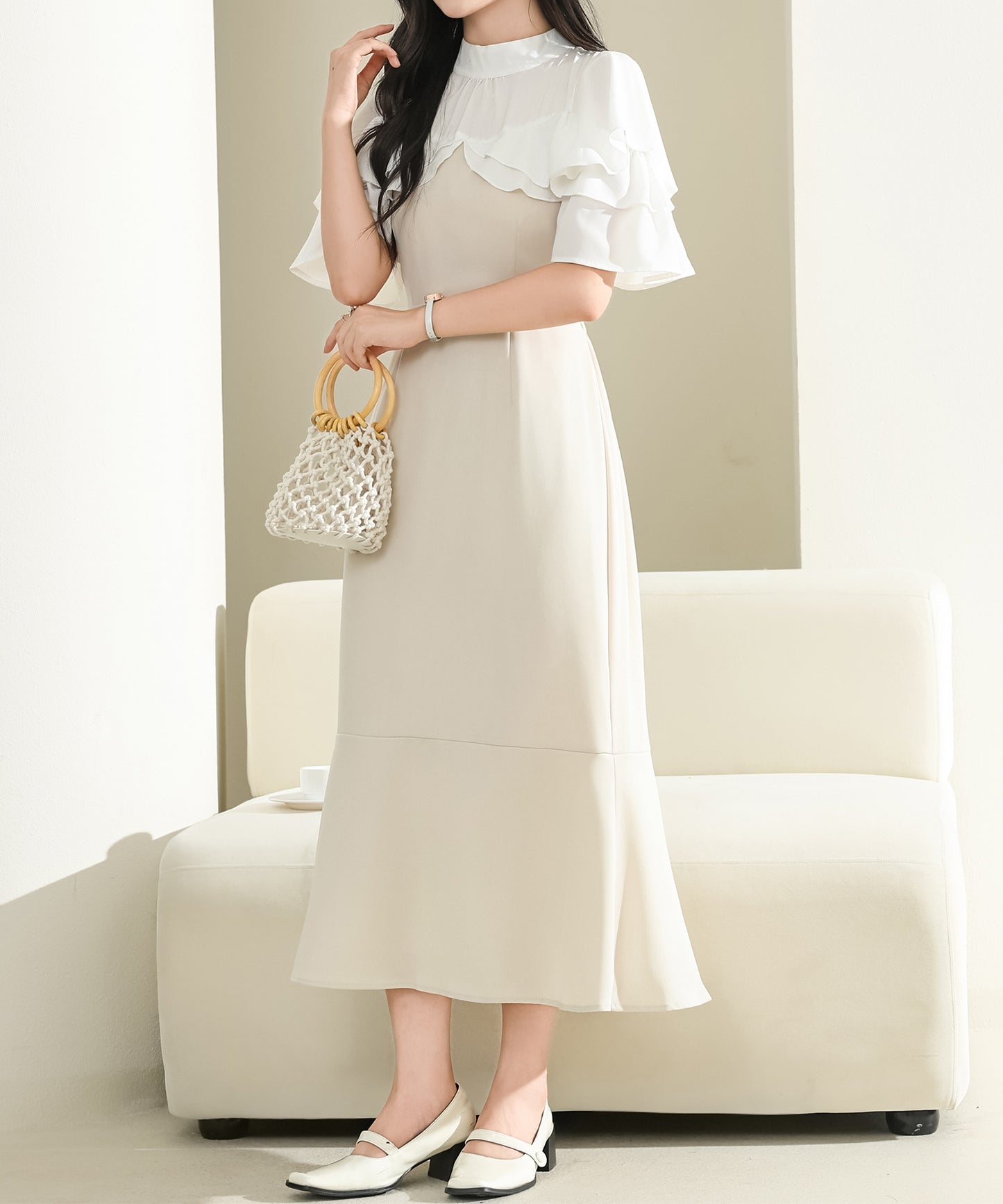 プチハイネック フリル フェイクレイヤード ロング ワンピース
